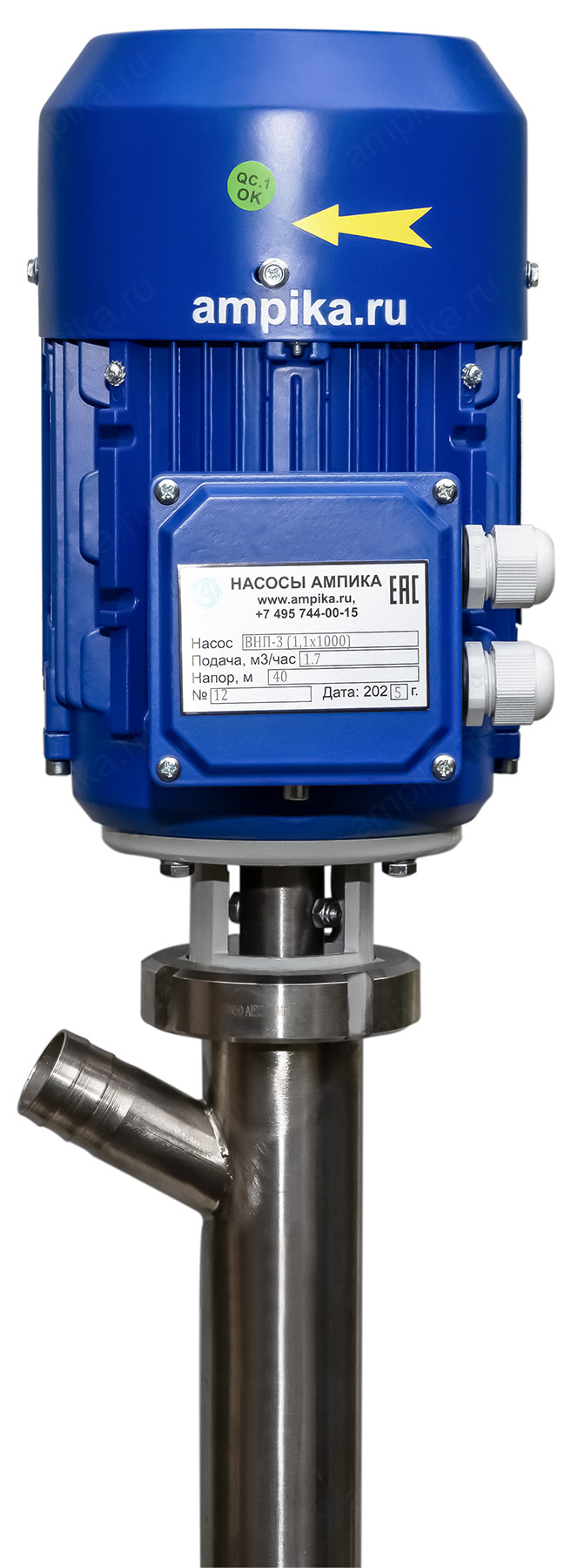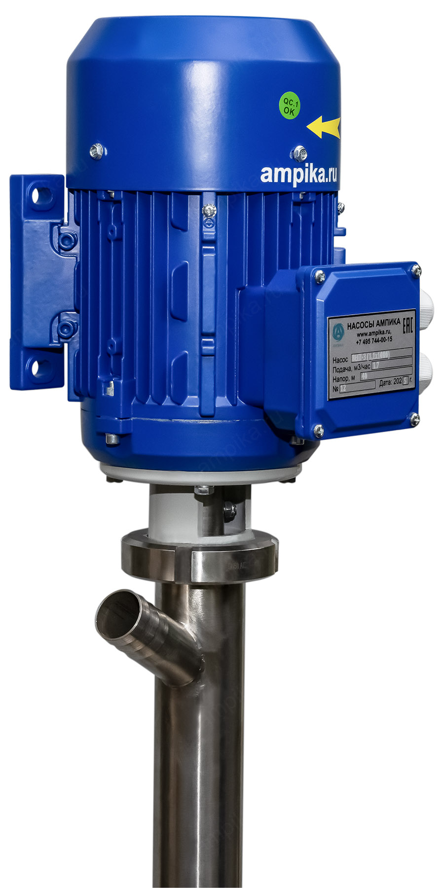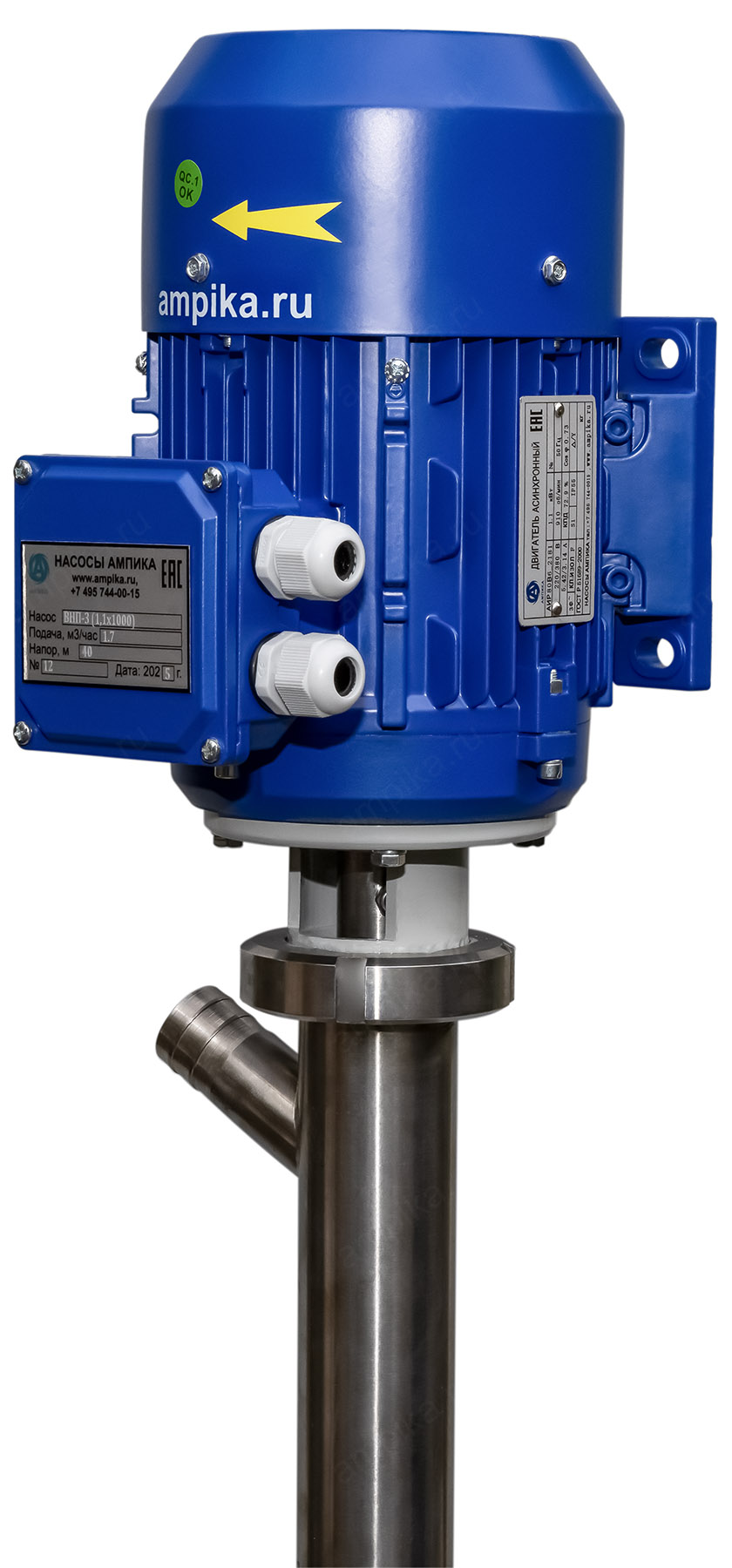 Винтовой полупогружной насос Ампика ВНП-3 (1,1х1000)Универсальный промышленный полупогружной героторный насос ВНП-3 (1,1х1000) предназначен для выкачивания различных жидких продуктов с вязкостью до 10000 мПа*с из бочек 200 л, 60 л, фляг (максимальная глубина погружения 1000 мм). Насос предназначен для таких жидкостей как краски на водной основе, лаки на водной основе, масла, дизельное топливо, клеи на водной основе, эпоксидные смолы, герметики и т.п. жидкости, не агрессивные к материалам насоса. В стандартном исполнении эта модель комплектуется статором из полиуретана и уплотнением вала из витона. ВНИМАНИЕ! Этот насос НЕ ПРЕДНАЗНАЧЕН!!! для полиэфирных смол, отвердителей, кислот, щелочей, растворителей!!! Уточняйте возможность работы насоса с каждой конкретной жидкостью у наших специалистов!!! Промышленный электрический насос для бочек ВНП-3 с двигателем 1,1 кВт на 1000 об./мин. выкачивает до 30 литров в минуту, создавая давление до 4 атмосфер. Возможно изготовление такого насоса с давлением до 7 атм. под заказ. Такое давление возможно при использовании героторной пары увеличенной длины. Насос называется полупогружной потому, что верхняя часть (электродвигатель) всегда над ёмкостью, а нижняя погружена в перекачиваемый продукт. Технические характеристики: • Материал проточной части (трубы) – нержавеющая сталь марки AISI304, • Материал внутренних деталей (винт, торсион, наконечник вала э/д, фланец под торцевое уплотнение): сталь 40Х13. Винт закалённый. • Уплотнение вала торцевое, с парой из карбида кремния и эластомером из витона (фторкаучука). Возможна установка уплотнения из EPDM. Эластомеры подбираются под жидкость. • Материал обоймы: полиуретан (самый износостойкий материал). Возможна установка обойм из: - пищевой резины 25-52-563 (NBR), - витона (фторкаучука), - износостойкой МБС резины 7-В-14. • Размер пропускаемых твёрдых частиц в перекачиваемой жидкости - до 3 мм, не более 10% по объёму. • Глубина погружения - до 1000 мм (возможно изготовление с глубиной погружения до 2000 мм под заказ). • Наружный диаметр трубы погружной части: 53 мм. • Выход насоса – штуцер под шланг внутренним диаметром 32 мм. • Электродвигатель: общепромышленный, трёхфазный, на 380 вольт, IP55, с возможностью постоянной работы. Возможна комплектация электродвигателем во взрывозащищённом исполнении. *Насосы ВНП-3 могут изготавливаться с увеличенным давлением нагнетания. Бочковой насос ВНП-3 (1,1х1000) - аналог бочкового насоса ОНВБ 1-01. Другие модели этого типа