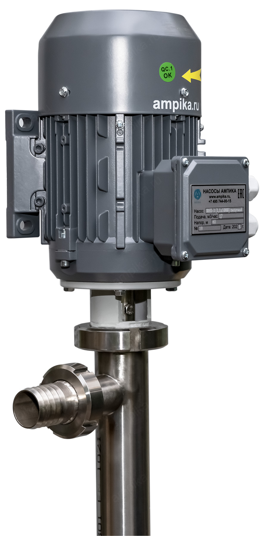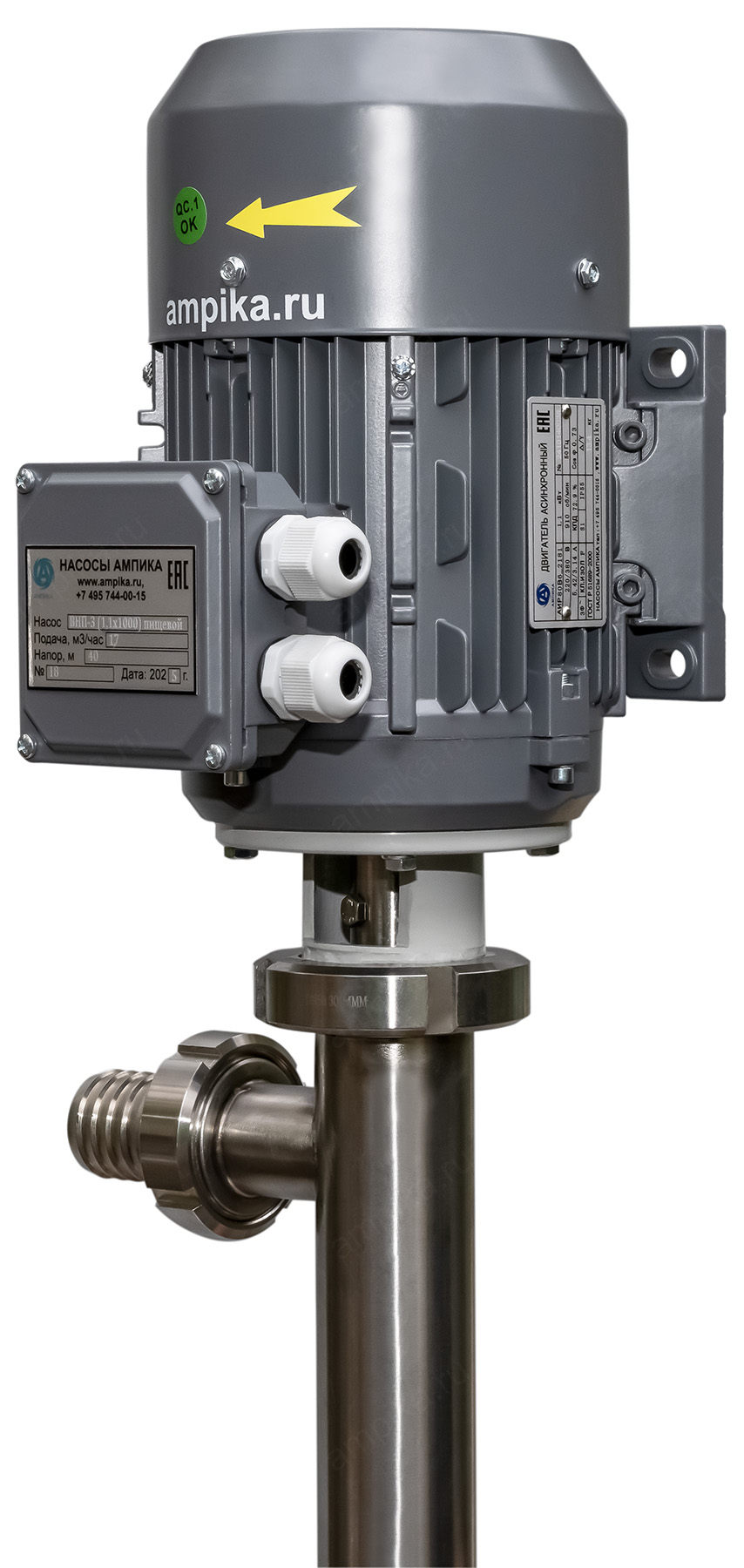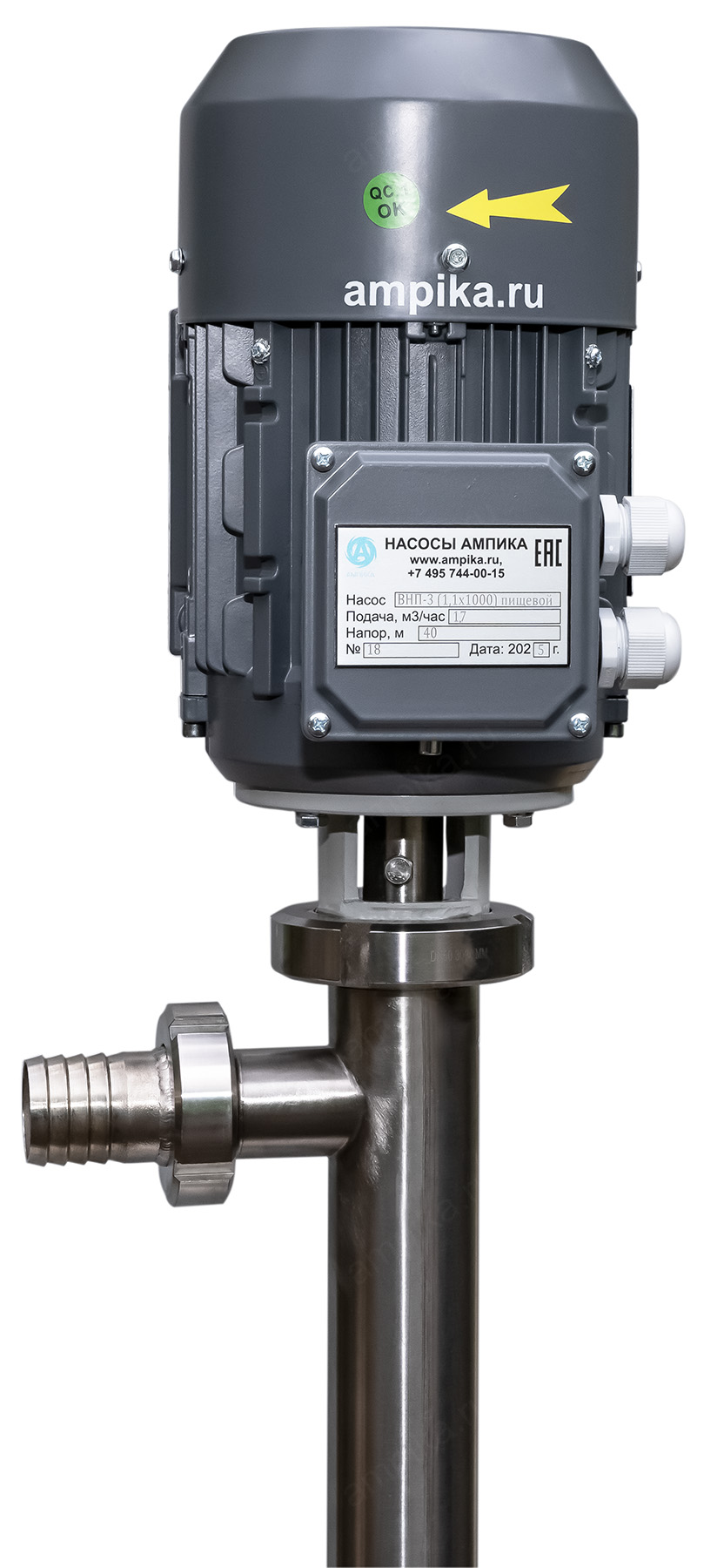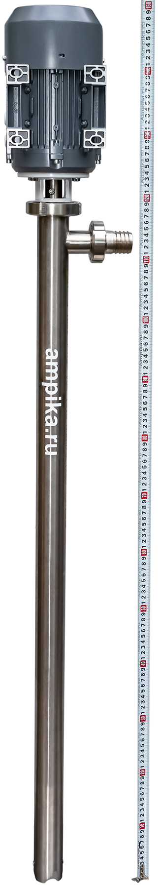 Винтовой полупогружной насос Ампика ВНП-3 (1,1х1000) пищевойНазначение: Универсальный промышленный насос ВНП-3 (1,1х1000) в пищевом исполнении предназначен для выкачивания различных жидких пищевых продуктов с вязкостью до 10000 мПа*с из бочек 200 л, 60 л, фляг. Насос может использоваться для перекачки таких жидкостей как: пищевые масла, жиры, концентраты соков, майонез, сметана, мёд, фруктовые пюре, патока, сиропы, некоторые щелочные жидкости и т.п. вещества, химически не агрессивные к материалам насоса. Примеры непищевых жидкостей, которые может выкачивать этот электрический бочковой насос: глицерин, гель для УЗИ, крема и шампуни, краски на водной основе, герметики, жидкое стекло, изоцианат, пропиленгликоль, полиэтиленгликоль, лапрол, SLES (лауретсульфат натрия). Пищевой винтовой насос для бочек ВНП можно промывать дезрастворами с концентрацией 1-2%. В стандартном исполнении эта модель комплектуется статором из белой пищевой резины NBR (25-25-563) и уплотнением вала из EPDM. Выходной патрубок с ёлочкой под шланг внутренним диаметром 38 мм, которая крепится к корпусу насоса через молочную муфту, что позволяет быстро присоединять/отсоединять шланг. ВНИМАНИЕ! Насосы НЕ ПРЕДНАЗНАЧЕН!!! для полиэфирных смол, отвердителей, кислот, растворителей!!! Уточняйте возможность работы насоса с каждой конкретной жидкостью у наших специалистов!!! Технические характеристики: 1) Производительность - до 30 литров в минуту с напором 40 метров. 2) Максимальная температура перекачиваемой жидкости - +95ºC. 3) Размер пропускаемых частиц - до 3 мм, не более 10% по объёму. 4) Материал проточной части (трубы) и внутренних деталей (винт, торсион, наконечник вала электродвигателя, фланец под торцевое уплотнение): нержавеющая сталь марки AISI304. 5) Уплотнение вала торцевое, с парой из карбида кремния и эластомером из EPDM. Возможна установка уплотнения из витона. 6) Материал обоймы: пищевая резина 25-52-563 (NBR). Возможна установка обойм из: - полиуретана, - витона (фторкаучука), - износостойкой чёрной МБС резины 7-В-14. 7) Максимальная глубина погружения - 1,2 м. Возможно изготовление с глубиной погружения до 2 м под заказ. 8) Наружный диаметр трубы погружной части - 53 мм. 9) Выход насоса – молочная муфта Ду38 DIN 11851 со штуцером под шланг Ду38 мм. 10) Электродвигатель - трёхфазный асинхронный общепромышленный, на 380 вольт, IP55, с возможностью непрерывной работы. Возможна комплектация электродвигателем во взрывозащищённом исполнении. *Насосы ВНП-3 могут изготавливаться с увеличенным давлением нагнетания. ВНП-3 (1,1х1000) - аналог ОНВБ 1-01 Другие модели этого типа