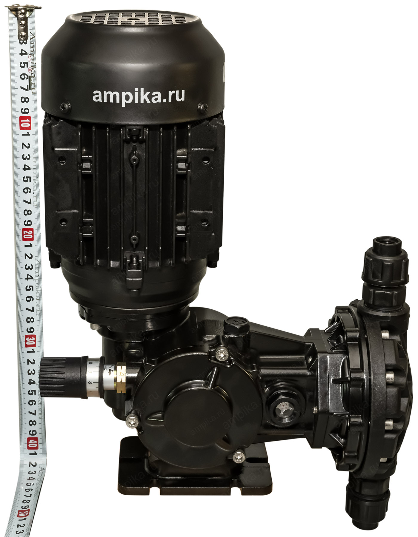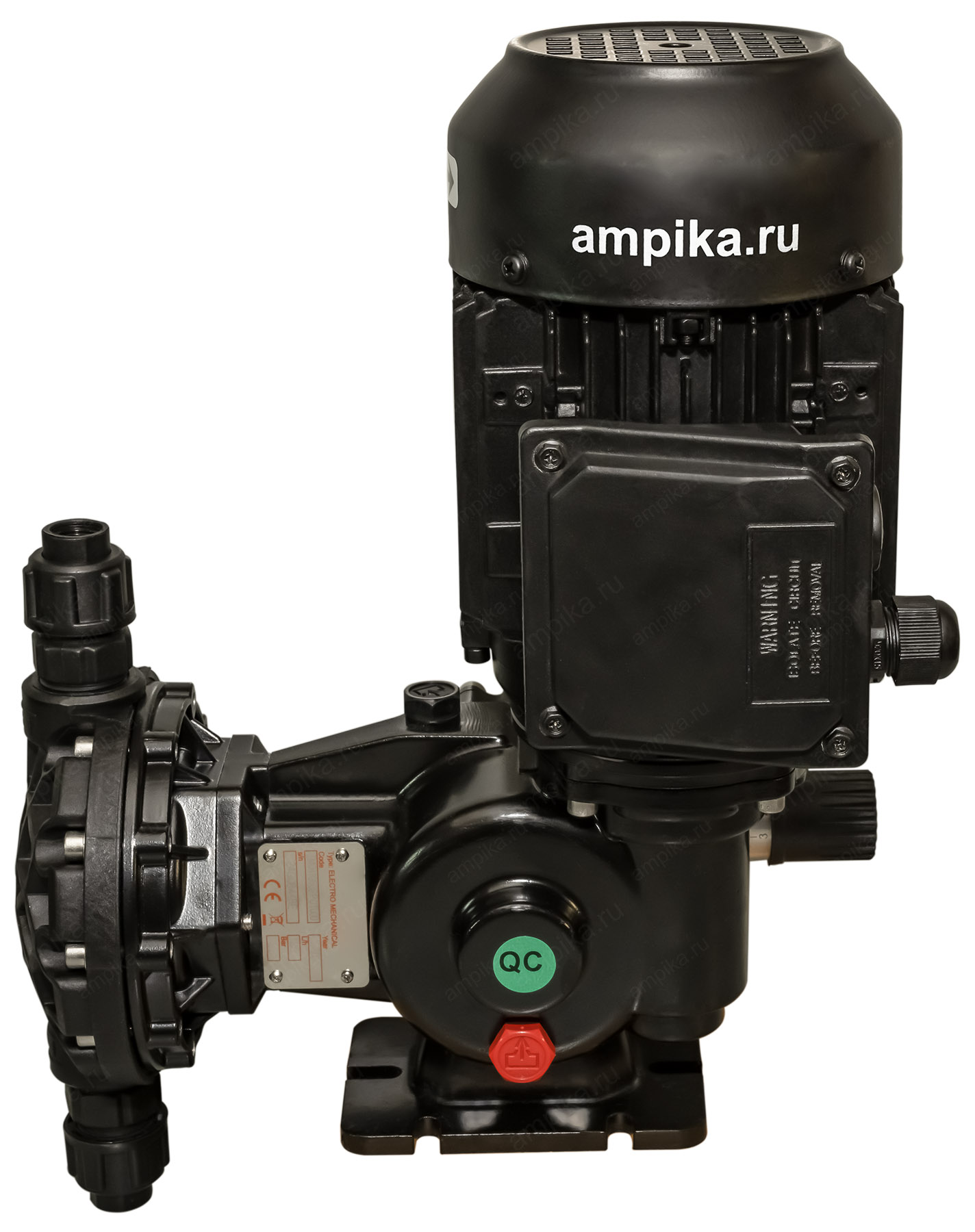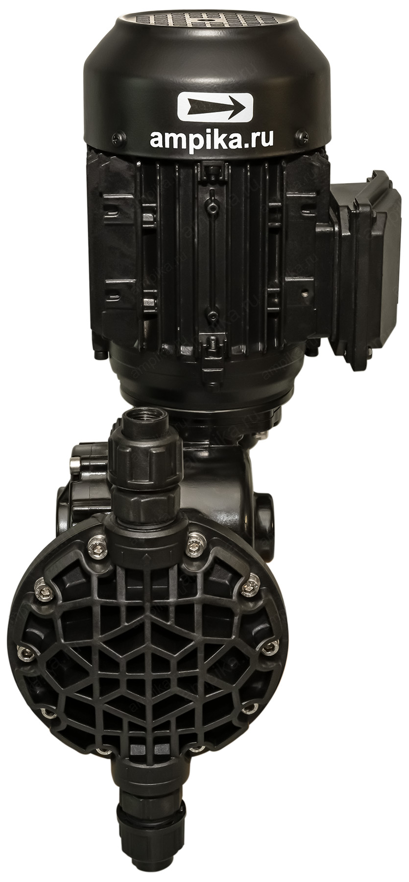 Мембранный дозирующий насос Injecta TM04108C_PPНебольшой промышленный дозатор TM04108C_PP - это мембранный насос с корпусом из полипропилена и регулировкой подачи "на ходу" в диапазоне производительности от 10% до максимума. Рабочая температура - до +45ºC. Материалы проточной части: - головка насоса - полипропилен, - мембрана - тефлон (PTFE), - уплотнительные кольца - FPM, - клапаны - керамика, - сёдла клапанов - тефлон (PTFE). Расшифровка обозначения марки насоса TM04108C_PP: - "TM" - мембранный насос, - "04" - длина хода мембраны в мм, - "108" - диаметр мембраны, - "C" - число ходов мембраны: 116 ходов в минуту, - "PP" - материал корпуса: полипропилен. Электродвигатель: Стандартное исполнение - трёхфазный общепромышленный, на 380 вольт, IP55. Возможна поставка насоса с однофазным электродвигателем на 220 вольт (+15000 рублей к цене), а также с электродвигателем во взрывозащищённом исполнении. В таблице характеристик насоса указаны его вес и размеры в упаковочной коробке. Параметры голого насоса: • длина: 300 мм, • ширина: 220 мм, • высота: 430 мм, • вес: 12 кг. Паспорт (инструкция по эксплуатации насоса) вложен в его упаковочную коробку. В комплекте также идёт бутылочка масла для редуктора. Для управления насосом по сигналу 4-20 mA, можно использовать 2 варианта: 1) Частотный преобразователь. С его помощью можно изменять подачу от 40% до 100% с приемлемой точностью: 1-3%. При снижении подачи частотником ниже 40%, точность дозирования начинает сильно падать, и может составлять 10-20% на подачах в диапазоне 5-20%. Также, при снижении оборотов электродвигателя ниже 600 мин⁻¹, встроенный вентилятор насоса не будет эффективно охлаждать мотор. В этом случае потребуется установка дополнительного внешнего вентилятора (можно приобрести у нас). Тем не менее, это достаточно распространённый вид управления подачей, т.к. это самый дешёвый вариант, да и не всегда требуется снижать подачу ниже 20% от номинала. 2) Специальный блок управления дозированием, который позволяет изменять подачу в диапазоне от 5 до 100%, обеспечивая точность дозирования 1-3%. Другие модели этого типа