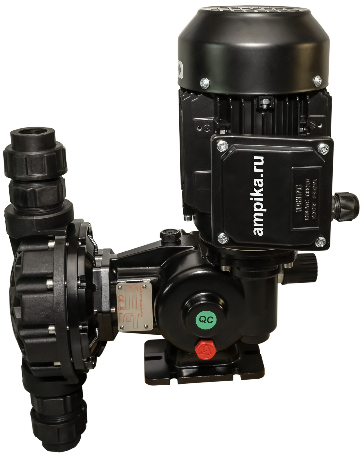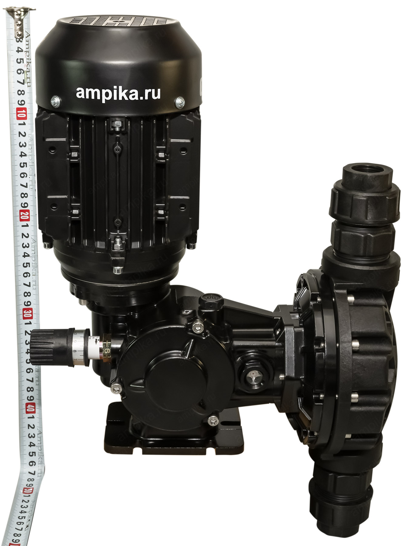 Мембранный дозирующий насос Injecta TM06138B_PPНебольшой промышленный дозатор TM06138B_PP - это мембранный насос с корпусом из полипропилена и регулировкой подачи "на ходу" в диапазоне от 10% до максимума (от 0,35 до 3,5 литров в минуту). Рабочая температура - до +45 ºC. Материалы проточной части: - головка насоса - полипропилен, - мембрана - тефлон (PTFE), - уплотнительные кольца - FPM, - клапаны - керамика, - сёдла клапанов - тефлон (PTFE). Расшифровка обозначения марки насоса TM06138B_PP: - "TM" - мембранный насос, - "06" - длина хода мембраны в мм, - "138" - диаметр мембраны, - "B" - число ходов мембраны: 78 ходов в минуту, - "PP" - материал корпуса: полипропилен. Электродвигатель: Стандартное исполнение - трёхфазный общепромышленный, на 380 вольт, IP55. Возможна поставка насоса с однофазным электродвигателем на 220 вольт (+15000 рублей к цене), а также с электродвигателем во взрывозащищённом исполнении. В таблице характеристик насоса указаны его вес и размеры в упаковочной коробке. Параметры голого насоса: • длина: 320 мм, • ширина: 240 мм, • высота: 470 мм, • вес: 14 кг. Паспорт (инструкция по эксплуатации дозировочного насоса) вложен в его упаковочную коробку. В комплекте также идёт бутылочка трансмиссионного масла для редуктора. Для управления насосом по сигналу 4-20 mA, можно использовать 2 варианта: 1) Частотный преобразователь. С его помощью можно изменять подачу от 40% до 100% с приемлемой точностью: 1-3%. При снижении подачи частотником ниже 40%, точность дозирования начинает сильно падать, и может составлять 10-20% на подачах в диапазоне 5-20%. Также, при снижении оборотов электродвигателя ниже 600 мин⁻¹, встроенный вентилятор насоса не будет эффективно охлаждать мотор. В этом случае потребуется установка дополнительного внешнего вентилятора (можно приобрести у нас). Тем не менее, это достаточно распространённый вид управления подачей, т.к. это самый дешёвый вариант, да и не всегда требуется снижать подачу ниже 20% от номинала. 2) Специальный блок управления дозированием, который позволяет изменять подачу в диапазоне от 5 до 100%, обеспечивая точность дозирования 1-3%. Другие модели этого типа