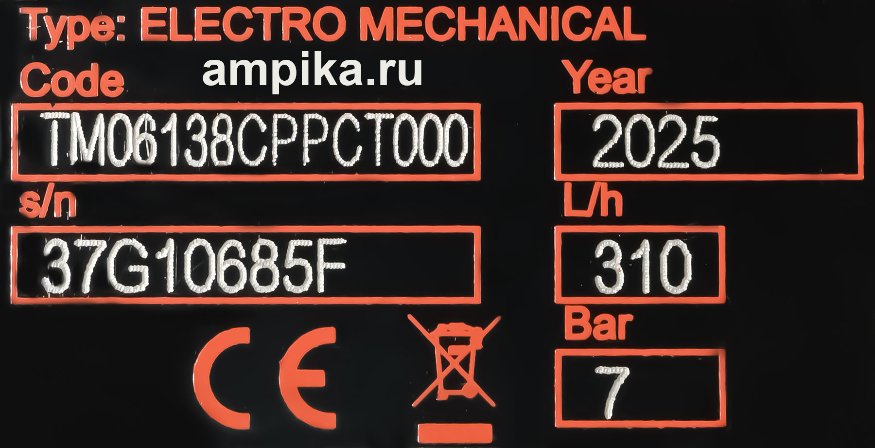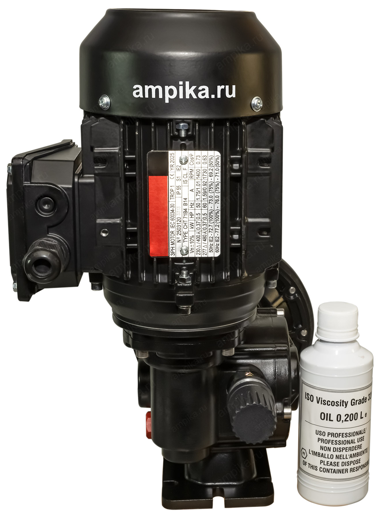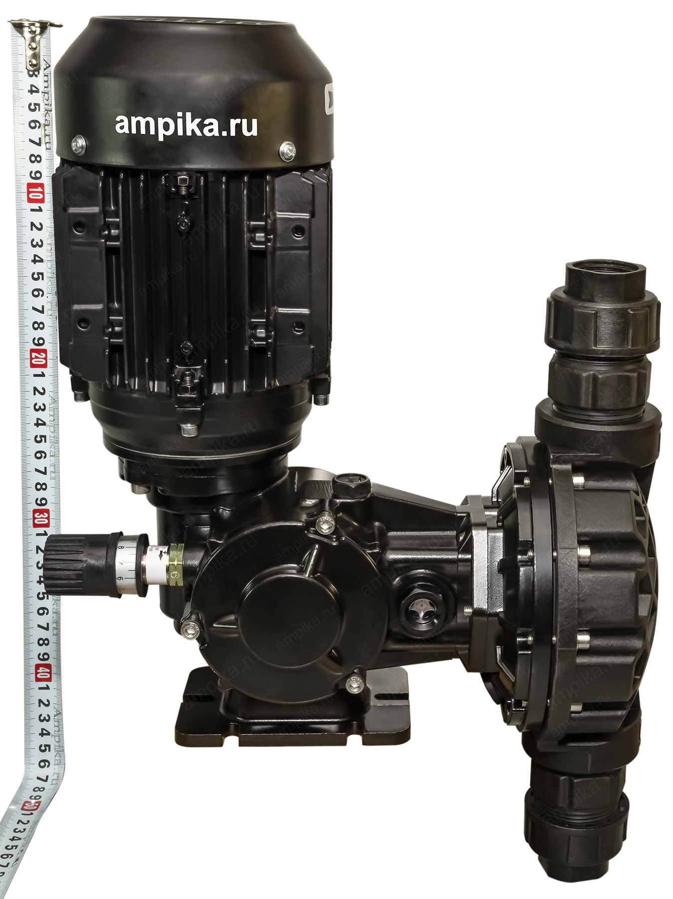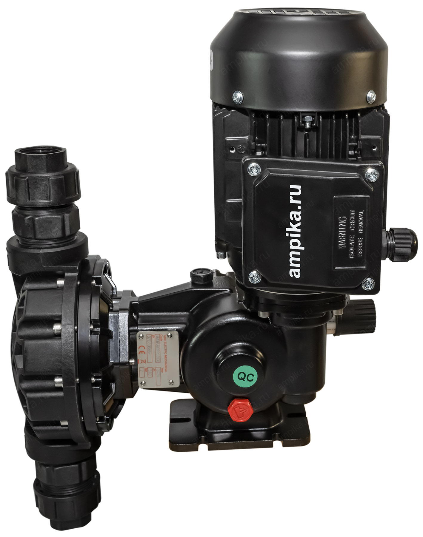 Мембранный дозирующий насос Injecta TM06138C_PPПромышленный дозировочный насос TM06138C_PP - это мембранный насос с корпусом из полипропилена и регулировкой подачи "на ходу" в диапазоне от 10% до максимума (от 0,5 до 5 литров в минуту). Максимальное давление насоса - 7 атмосфер. Рабочая температура - до +45 ºC. Материалы проточной части: - головка насоса - полипропилен, - мембрана - тефлон (PTFE), - уплотнительные кольца - FPM, - клапаны - керамика, - сёдла клапанов - тефлон (PTFE). Расшифровка обозначения марки насоса TM06138C_PP: - "TM" - мембранный насос, - "06" - длина хода мембраны в мм, - "138" - диаметр мембраны, - "C" - число ходов мембраны: 116 ходов в минуту, - "PP" - материал корпуса: полипропилен. Электродвигатель: Стандартное исполнение - трёхфазный общепромышленный, на 380 вольт, IP55. Возможна поставка насоса с однофазным электродвигателем на 220 вольт (+15000 рублей к цене), а также с электродвигателем во взрывозащищённом исполнении. В таблице характеристик насоса указаны его вес и размеры в упаковочной коробке. Параметры голого насоса: • длина: 320 мм, • ширина: 240 мм, • высота: 470 мм, • вес: 14 кг. Паспорт (инструкция по эксплуатации дозировочного насоса) вложен в его упаковочную коробку. В комплекте также идёт бутылочка трансмиссионного масла для редуктора. Для управления насосом по сигналу 4-20 mA, можно использовать 2 варианта: 1) Частотный преобразователь. С его помощью можно изменять подачу от 40% до 100% с приемлемой точностью: 1-3%. При снижении подачи частотником ниже 40%, точность дозирования начинает сильно падать, и может составлять 10-20% на подачах в диапазоне 5-20%. Также, при снижении оборотов электродвигателя ниже 600 мин⁻¹, встроенный вентилятор насоса не будет эффективно охлаждать мотор. В этом случае потребуется установка дополнительного внешнего вентилятора (можно приобрести у нас). Тем не менее, это достаточно распространённый вид управления подачей, т.к. это самый дешёвый вариант, да и не всегда требуется снижать подачу ниже 20% от номинала. 2) Специальный блок управления дозированием, который позволяет изменять подачу в диапазоне от 5 до 100%, обеспечивая точность дозирования 1-3%. Другие модели этого типа
