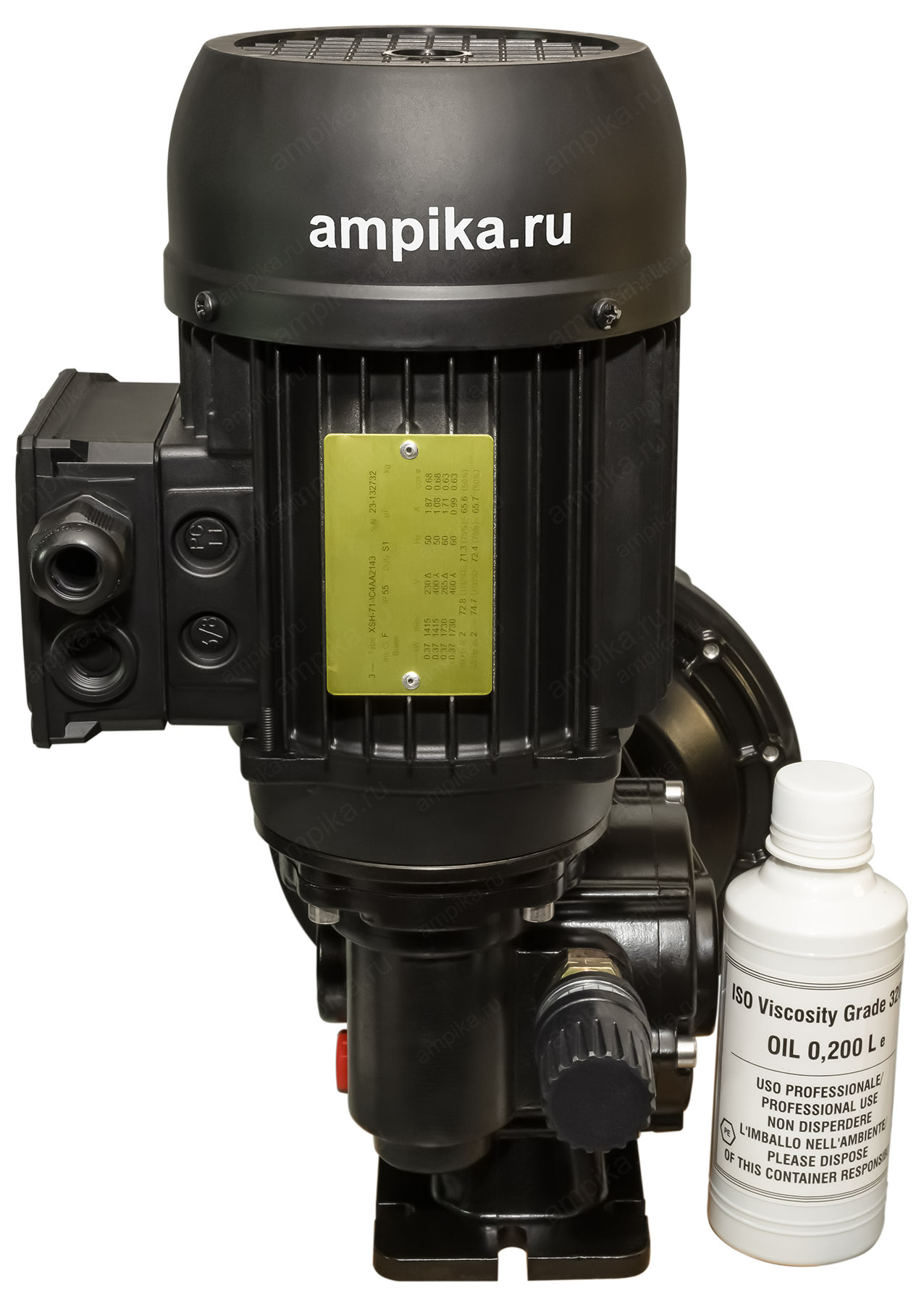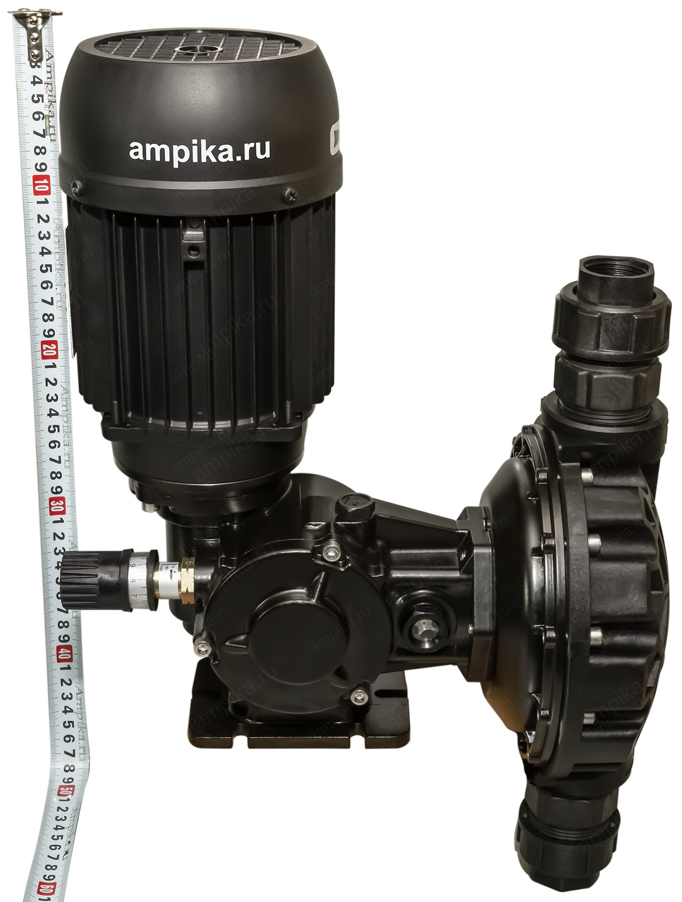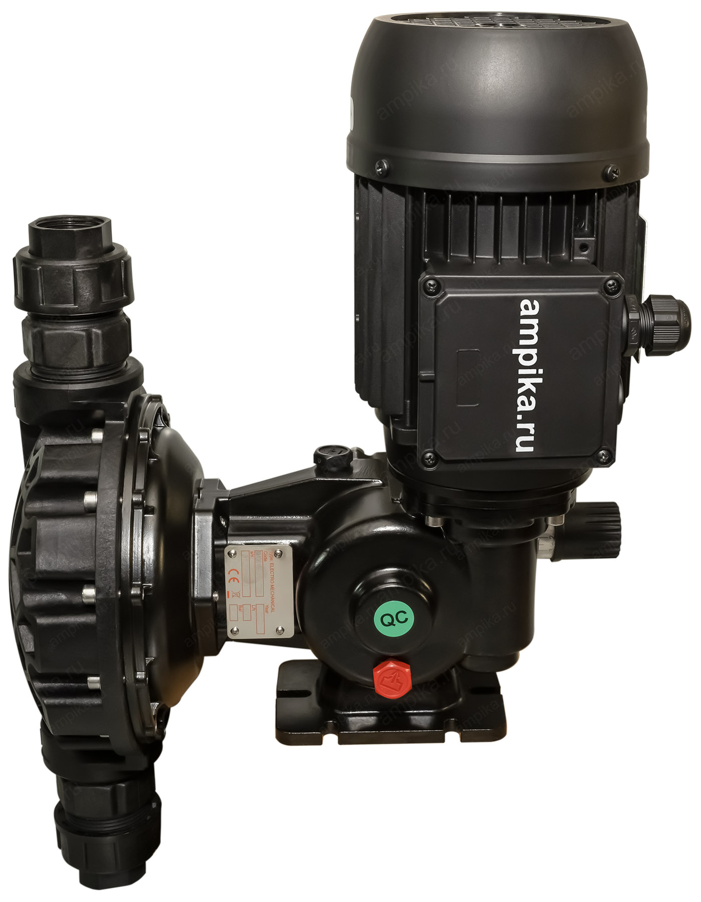 Мембранный дозирующий насос Injecta TM06165C_PPПромышленный насос-дозировщик TM06165C_PP - это мембранный насос с корпусом из полипропилена и регулировкой подачи "на ходу" в диапазоне от 10% до максимума (от 0,75 до 7,5 литров в минуту). Рабочая температура - до +45 ºC. Материалы проточной части: - головка насоса - полипропилен, - мембрана - тефлон (PTFE), - уплотнительные кольца - FPM, - клапаны - керамика, - сёдла клапанов - тефлон (PTFE). Расшифровка обозначения марки насоса TM06165C_PP: - "TM" - мембранный насос, - "06" - длина хода мембраны в мм, - "138" - диаметр мембраны, - "C" - число ходов мембраны: 116 ходов в минуту, - "PP" - материал корпуса: полипропилен. Электродвигатель: Стандартное исполнение - трёхфазный общепромышленный, на 380 вольт, IP55. Возможна поставка насоса с однофазным электродвигателем на 220 вольт (+15000 рублей к цене), а также с электродвигателем во взрывозащищённом исполнении. В таблице характеристик насоса указаны его вес и размеры в упаковочной коробке. Параметры голого насоса: • длина: 330 мм, • ширина: 260 мм, • высота: 500 мм, • вес: 16 кг. Паспорт (инструкция по эксплуатации дозировочного насоса) вложен в его упаковочную коробку. В комплекте также идёт бутылочка трансмиссионного масла для редуктора. Для управления насосом по сигналу 4-20 mA, можно использовать 2 варианта: 1) Частотный преобразователь. С его помощью можно изменять подачу от 40% до 100% с приемлемой точностью: 1-3%. При снижении подачи частотником ниже 40%, точность дозирования начинает сильно падать, и может составлять 10-20% на подачах в диапазоне 5-20%. Также, при снижении оборотов электродвигателя ниже 600 мин⁻¹, встроенный вентилятор насоса не будет эффективно охлаждать мотор. В этом случае потребуется установка дополнительного внешнего вентилятора (можно приобрести у нас). Тем не менее, это достаточно распространённый вид управления подачей, т.к. это самый дешёвый вариант, да и не всегда требуется снижать подачу ниже 20% от номинала. 2) Специальный блок управления дозированием, который позволяет изменять подачу в диапазоне от 5 до 100%, обеспечивая точность дозирования 1-3%. Другие модели этого типа