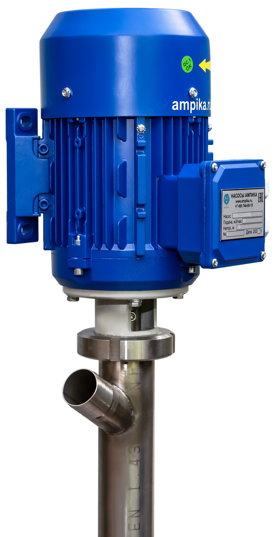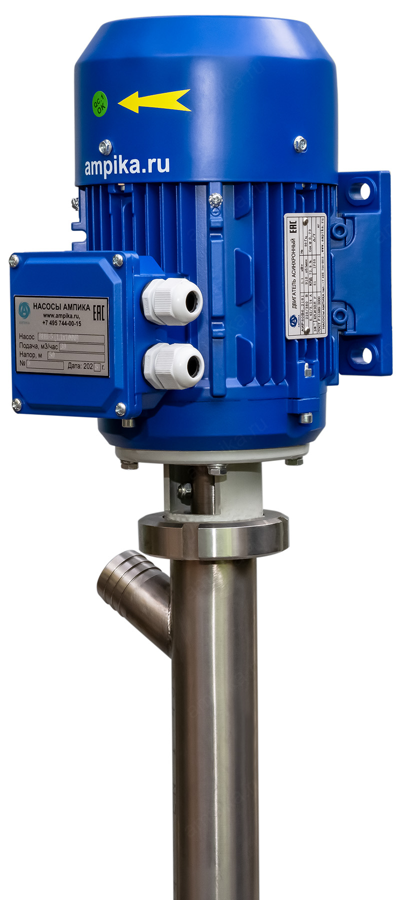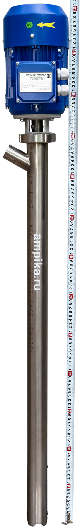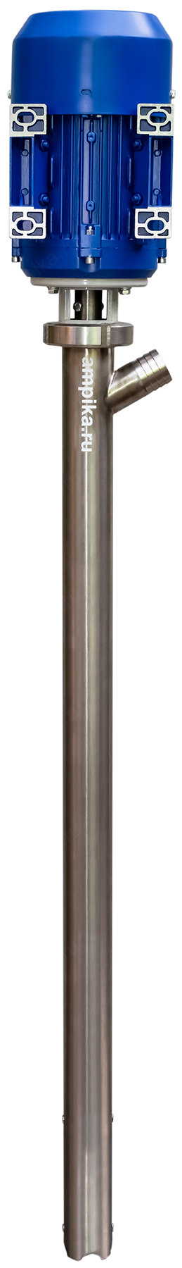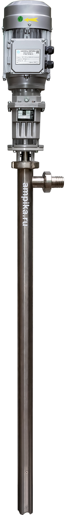 Винтовой полупогружной насос Ампика ВНП-5 (1,1х1000)Промышленный бочковой полупогружной насос ВНП-5 (1,1х1000) предназначен для выкачивания продуктов с вязкостью до 10000 мПа*с из бочек 200 л, 60 л, фляг. Насос называется полупогружным потому, что верхняя часть (электродвигатель) всегда над ёмкостью. Насос может использоваться например перекачки для таких жидкостей, как краски на водной основе, лаки на водной основе, трансмиссионные, моторные и гидравлические масла, дизельное топливо, мазут, клеи на водной основе, этиленгликоль, пропиленгликоль, жидкие эпоксидные смолы и подобных жидкостей, не агрессивных к материалам насоса. В стандартном исполнении эта модель комплектуется статором из полиуретана и уплотнением вала из витона. Размер пропускаемых частиц - до 3 мм, не более 10% по объёму. В качестве привода устанавливается трёхфазный электромотор с оборотами выходного вала 910 мин⁻¹. Это позволяет перекачивать жидкости средней вязкости, например трансмиссионные масла. Рекомендуем запитывать насос через частотный преобразователь, т.к. он позволяет подстраивать обороты ротора в зависимости от вязкости жидкости, которая может меняться. Следует помнить, что чем больше будет вязкость (максимальная - 10000 сПз), тем ниже будет производительность насоса (подача в таблице указана на воде). ВНИМАНИЕ! Этот насос НЕ ПРЕДНАЗНАЧЕН для полиэфирных смол, отвердителей, кислот, щелочей, растворителей!!! Уточняйте возможность работы насоса с конкретной жидкостью у поставщика!!! Технические характеристики: 1) Принцип действия - винтовой (героторный насос). 2) Глубина погружения - 1000 мм (возможно изготовление с глубиной погружения до 2000 мм под заказ). 3) Материал проточной части (трубы) – нержавеющая сталь марки AISI 304. 4) Материалы внутренних деталей (винт, торсион, наконечник вала двигателя, фланец под торцевое уплотнение): 40Х13 (винт закалённый). 5) Уплотнение вала торцевое, с парой трения из карбида кремния и эластомером из витона (фторкаучук). Возможна установка уплотнения из EPDM. 6) Материал обоймы: полиуретан (самый износостойкий материал). Возможна установка обойм из: - пищевой резины 25-52-563 (NBR), - витона (фторкаучука), - износостойкой МБС резины 7-В-14. 7) Диаметр погружной части: 53 мм. 8) Выход насоса – штуцер под шланг 38 мм (возможна установка молочной муфты Ду38 DIN 11851 под заказ). 9) Электродвигатель: общепромышленный, на 380 вольт, 1,1 кВт, IP54, с возможностью постоянной работы. Возможна комплектация электродвигателем во взрывозащищённом исполнении. Другие модели этого типа