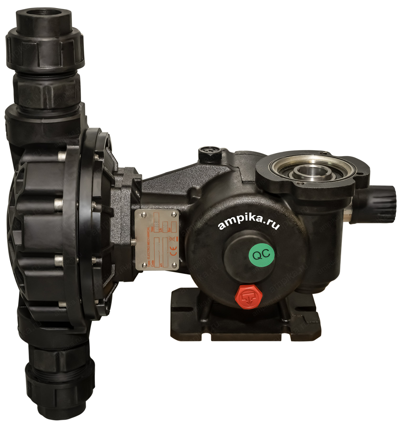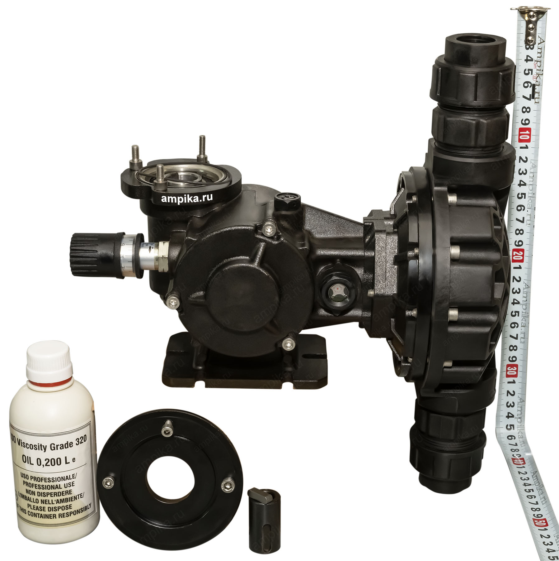 Мембранный дозирующий насос Injecta TM06138B_PP б/дНебольшой промышленный дозатор TM06138B_PP без двигателя - это мембранный насос с корпусом из полипропилена и регулировкой подачи "на ходу" в диапазоне от 10% до максимума. Рабочая температура - до +45 ºC. Материалы проточной части: - головка насоса - полипропилен, - мембрана - тефлон (PTFE), - уплотнительные кольца - FPM, - клапаны - керамика, - сёдла клапанов - тефлон (PTFE). Расшифровка обозначения марки насоса TM06138B_PP: - "TM" - мембранный насос, - "06" - длина хода мембраны в мм, - "138" - диаметр мембраны, - "B" - число ходов мембраны: 78 ходов в минуту, - "PP" - материал корпуса: полипропилен. Электродвигатель: Отсутствует. Ампика может поставить какой угодно. В таблице характеристик насоса указаны его вес и размеры в упаковочной коробке. Параметры голого насоса: • длина: 320 мм, • ширина: 170 мм, • высота: 370 мм, • вес: 7 кг. Паспорт (инструкция по эксплуатации дозировочного насоса) вложен в его упаковочную коробку. В комплекте также идёт бутылочка трансмиссионного масла для редуктора. Другие модели этого типа