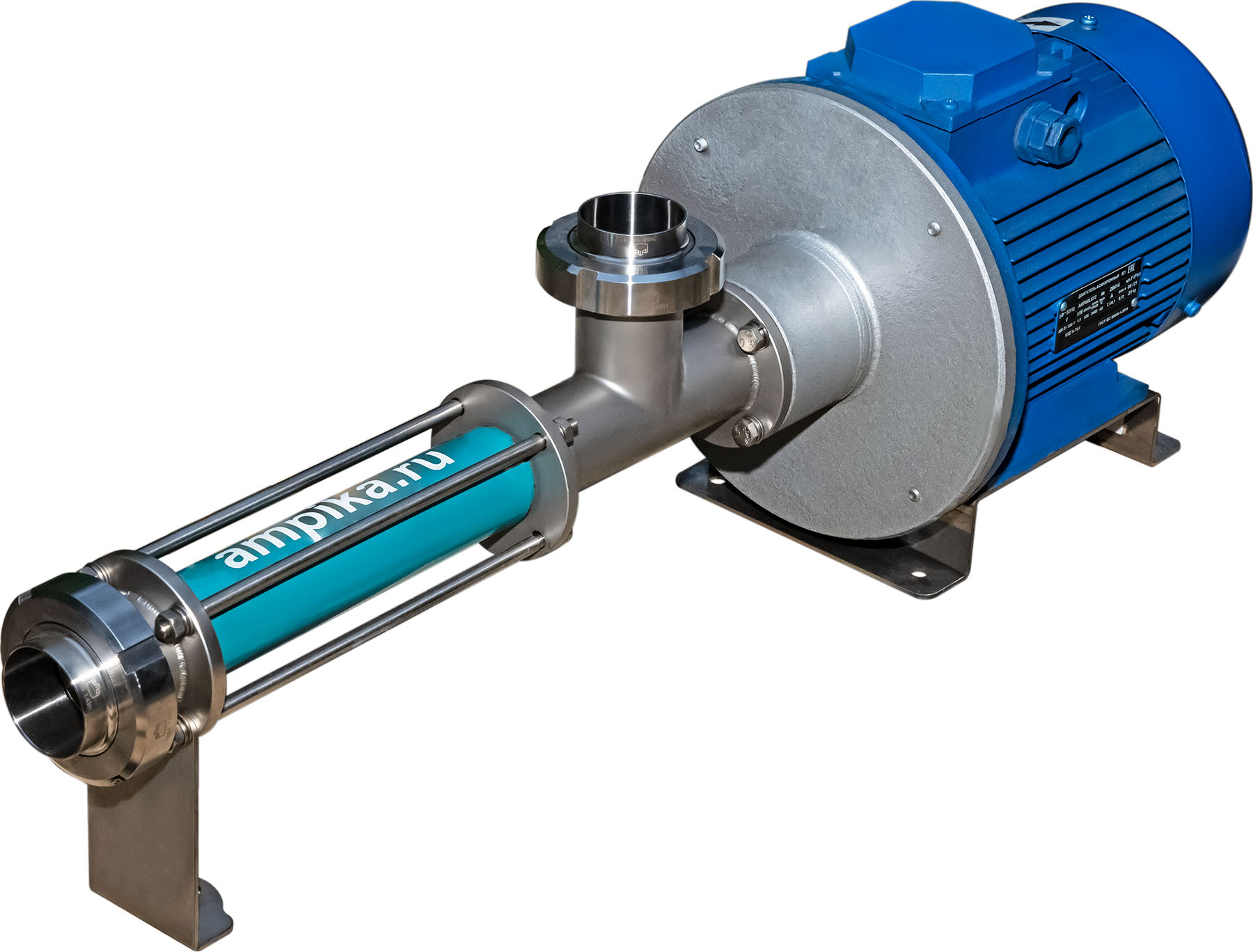 Винтовой насос Ампика ОВН-8-4,0/5Винтовые насосы серии ОВН предназначены для перекачивания вязких жидкостей в пищевой и химической промышленности. Температура перекачиваемой жидкости - до +80ºC в стандартном исполнении. Возможно изготовление насосов с рабочей температурой до +140ºC под заказ. Уплотнение вала - торцевое. Материал проточной части - нержавеющая сталь марки AISI 304. Насосы представляют собой моноблочную конструкцию, что позволило снизить цену по сравнению с традиционным решением, когда используется выносная промежуточная подшипниковая стойка. Допустимый размер частиц в перекачиваемой жидкости: - для ОВН-2 (до 12 атм.), ОВН-4 (до 6 атм.), ОВН-6 (до 6 атм.): твёрдые до 6 мм, мягкие до 9 мм, - для ОВН-8: твёрдые до 8 мм, мягкие до 12 мм, - для ОВН-6 (до 12 атм.), ОВН-12 (до 6 атм.), ОВН-18 (до 6 атм.): твёрдые до 9 мм, мягкие до 13 мм, - для ОВН-18 (до 12 атм.), ОВН-36 (до 6 атм.), ОВН-54 (до 6 атм.): твёрдые до 14 мм, мягкие до 21 мм. Расшифровка обозначения на примере насоса ОВН-4-2,5/5: - "О" - насос для молочной промышленности по советской классификации, - "ВН" - винтовой насос, - "4" - номинальная производительность статора (обоймы) на 100 оборотов винта в литрах, - "2,5" - производительность насоса в м³/час, - "5" - давление насоса в атмосферах. Возможные варианты исполнения: - с байпасом (дает возможность работы на закрытый выход, например, для дозирования), - с дополнительным штуцером для CIP мойки, - во взрывозащищённом исполнении, - со шнековым питателем, - с мотор-редуктором. ВНИМАНИЕ! Если требуется работа с частотным преобразователем, об этом нужно сообщать при заказе, т.к. со стандартным электродвигателем насос может не запускаться от частотника. В этом случае может потребоваться установка более мощного электродвигателя, а также дополнительного внешнего вентилятора, т.к. при снижении оборотов встроенная в э/д крыльчатка может перестать эффективно охлаждать электродвигатель, и это может привести к его перегреву. Частотный регулятор следует выбирать на одну ступень больше, чем мощность электродвигателя, и обязательно использовать частотный преобразователь с векторным управлением. Дополнение к описанию: Винтовой насос для вязких жидкостей средней производительности: 65 литров в минуту при напоре 50 метров. Электродвигатель трёхфазный, мощностью 1500 ватт, совершающий 1000 оборотов в минуту. Относительно низкая скорость вращения винта обеспечивает бережное перекачивание продукта и долговечность героторной пары. Другие модели этого типа
