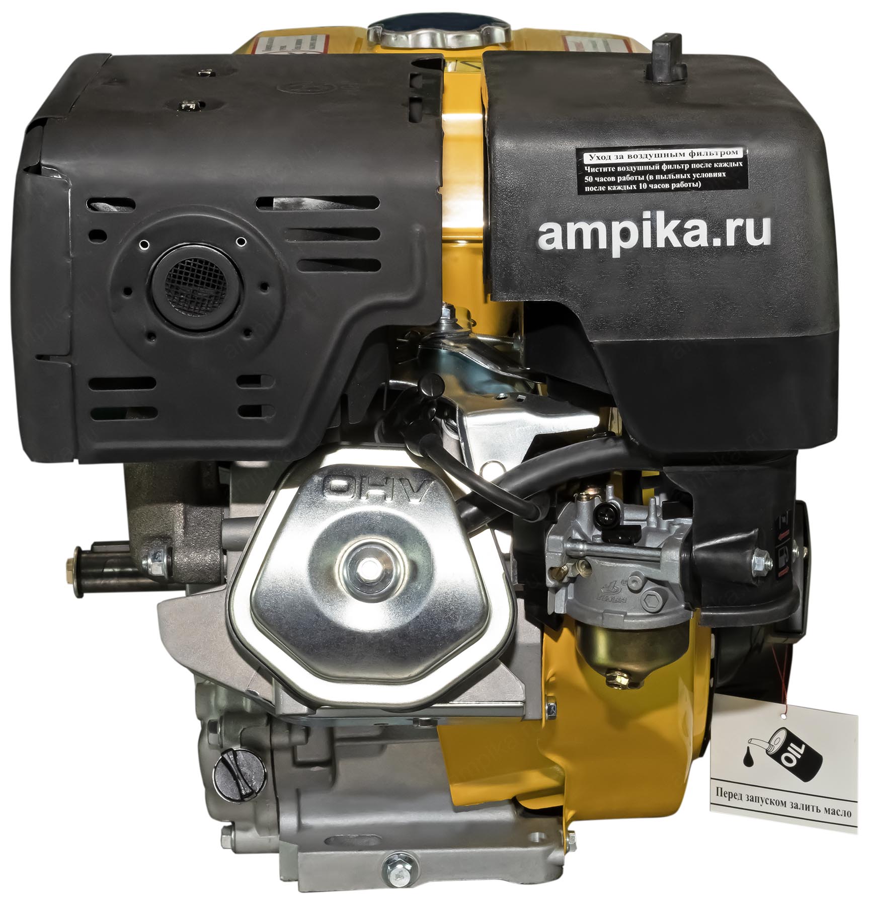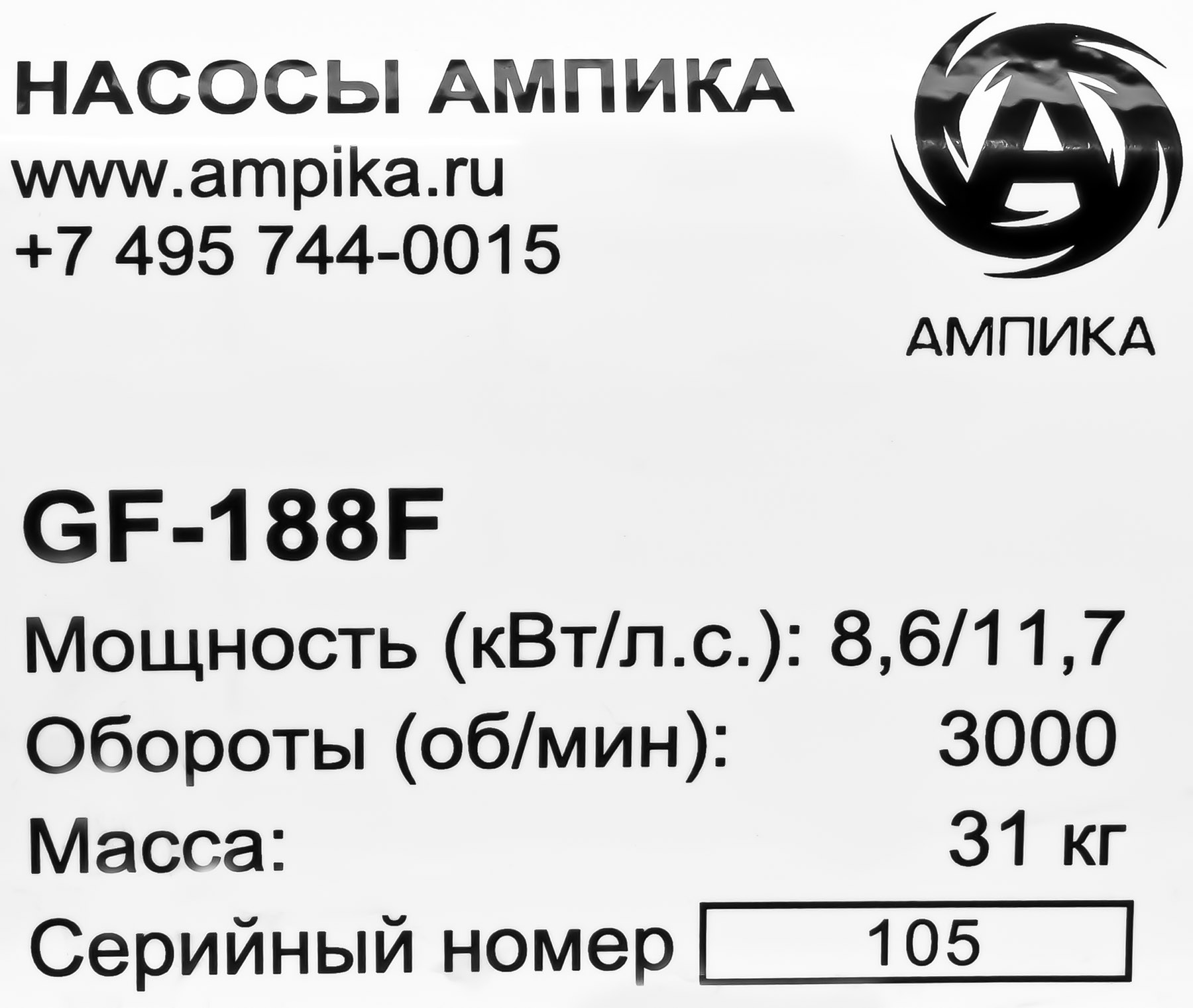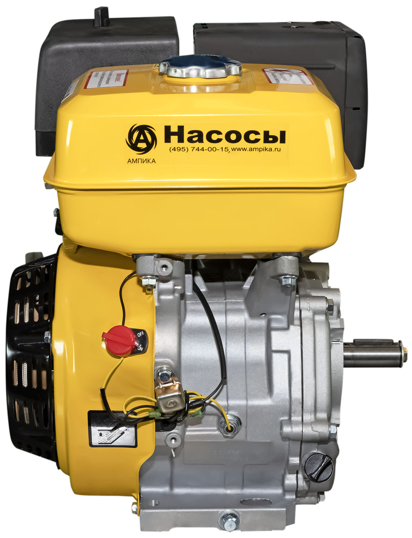 Бензиновый двигатель GF-188FОдноцилиндровый бензиновый мотор GF-188F - универсальный двигатель внутреннего сгорания. Принцип работы бензинового двигателя внутреннего сгорания заключается в сжигании бензо-воздушной смеси и переработке полученной тепловой энергии в энергию механическую, которая в нашем случае приводит в работу самые разные насосы. Бензиновые двигатели внутреннего сгорания находят самое разное применение на производстве и в быту. Их основное достоинство - автономность. Основные преимущества бензиновых двигателей перед дизельными: - морозоустойчивость; - относительная дешевизна и простота технического обслуживания; - высокая мощность; - легко переносят работу на высоких оборотах. Бензиновые двигатели внутреннего сгорания серии GF предназначены прежде всего для установки на мотопомпы. Технические характеристики бензинового двигателя GF-188F: - стартёр: ручной; - рабочий объём: 389 см³; - способ питания: карбюратор; - диаметр цилиндра * ход поршня: 88*64 мм; - ёмкость топливного бака: 5,5 л; - объём заливаемого моторного масла: 1,65 л; - диаметр выходного вала: 25/25, 4 мм; - направление вращения: против часовой стрелки; - номинальная мощность: 8,6 кВт (11,7 л. с.); - максимальная мощность: 9,6 кВт (13 л. с.). В таблице характеристик мотора указаны его вес и размеры в упаковочной коробке. Параметры двигателя без упаковки: • длина: 480 мм, • ширина: 380 мм, • высота: 440 мм, • вес: 29,5 кг. Паспорт (инструкция по эксплуатации бензинового мотора) вложен в его упаковочную коробку. Другие модели этого типа