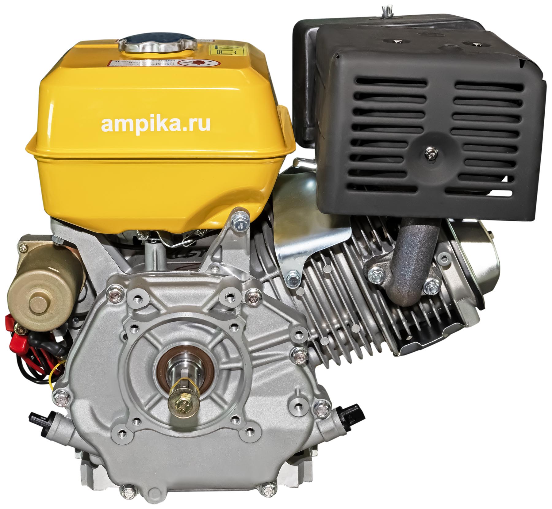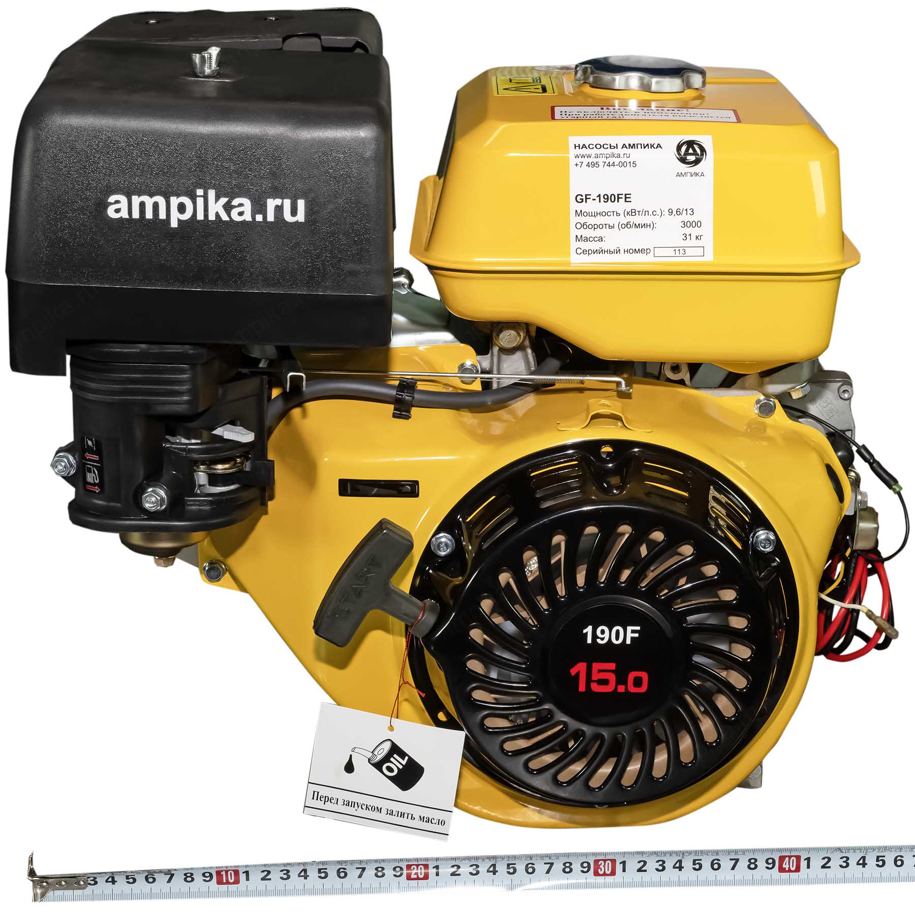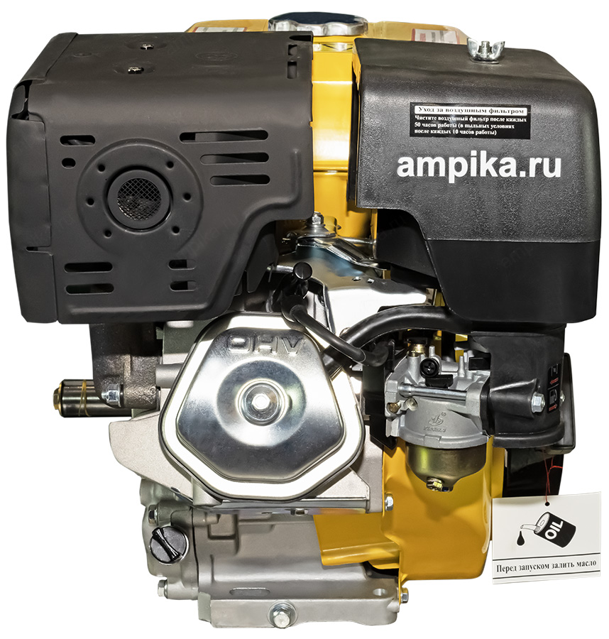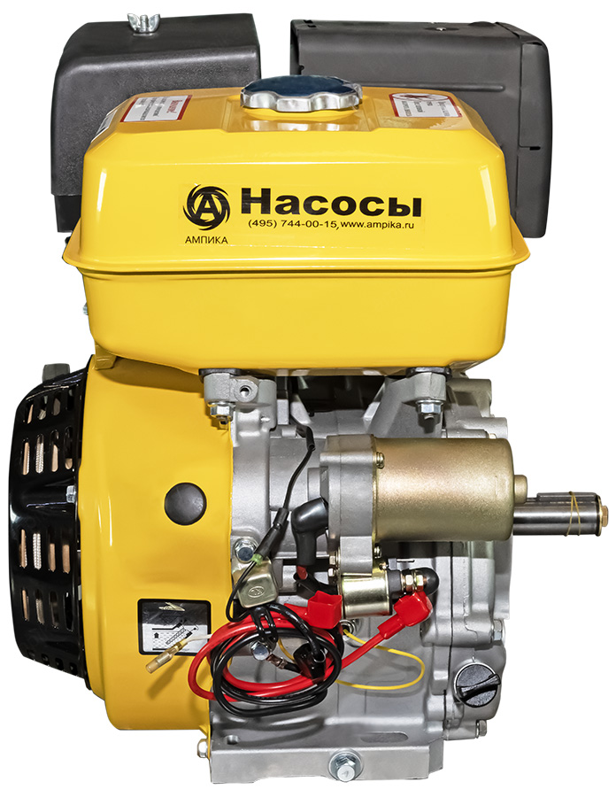 Бензиновый двигатель с электростартером GF-190FEОдноцилиндровый бензиновый мотор GF-190FE - мощный универсальный двигатель внутреннего сгорания. Оснащён электростартером и выносным блоком включения зажигания с ключами. Аккумулятор в комплекте не идёт. Принцип работы бензинового двигателя внутреннего сгорания заключается в сжигании бензо-воздушной смеси и переработке полученной тепловой энергии в энергию механическую, которая в нашем случае приводит в работу самые разные насосы. Бензиновые двигатели внутреннего сгорания находят самое разное применение на производстве и в быту. Их основное достоинство - автономность. Основные преимущества бензиновых двигателей перед дизельными: - морозоустойчивость; - относительная дешевизна и простота технического обслуживания; - высокая мощность; - легко переносят работу на высоких оборотах. Бензиновые двигатели внутреннего сгорания серии GF предназначены прежде всего для установки на мотопомпы. Технические характеристики бензинового двигателя GF-190FE: - стартёр: и электрический, и ручной; - рабочий объём: 407 см³; - способ питания: карбюратор; - диаметр цилиндра * ход поршня: 90*64 мм; - ёмкость топливного бака: 5,5 л; - объём заливаемого моторного масла: 1,65 л; - диаметр выходного вала: 25/25, 4 мм; - направление вращения: против часовой стрелки; - номинальная мощность: 9,6 кВт (13 л. с.); - максимальная мощность: 11 кВт (15 л. с.). В таблице характеристик мотора указаны его вес и размеры в упаковочной коробке. Параметры двигателя без упаковки: • длина: 500 мм, • ширина: 400 мм, • высота: 430 мм, • вес: 32 кг. Паспорт (инструкция по эксплуатации бензинового мотора) вложен в его упаковочную коробку. |