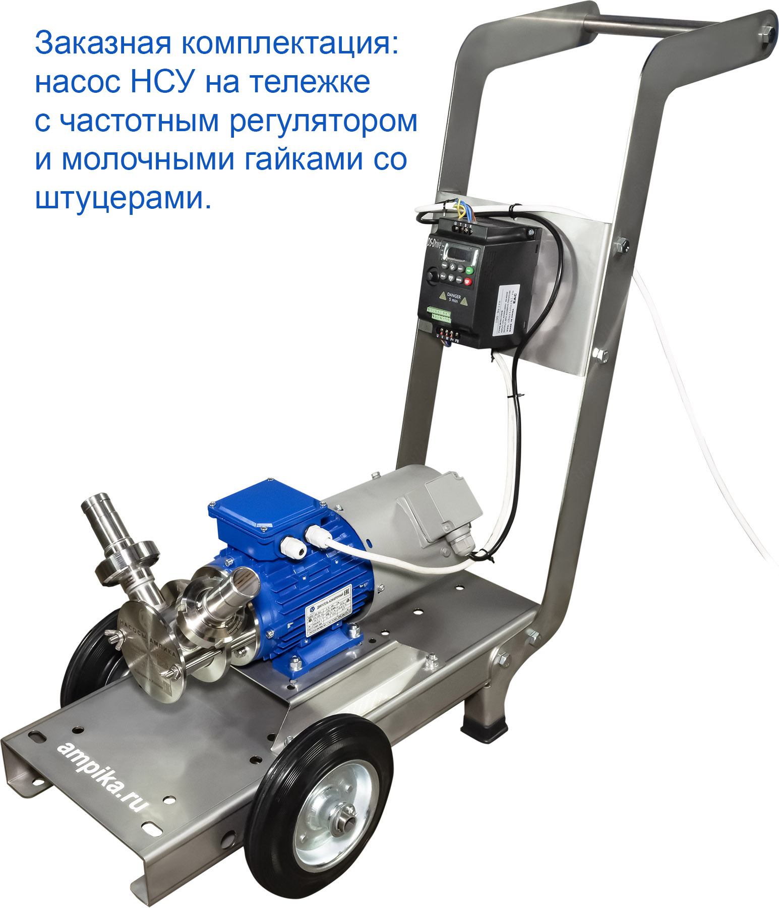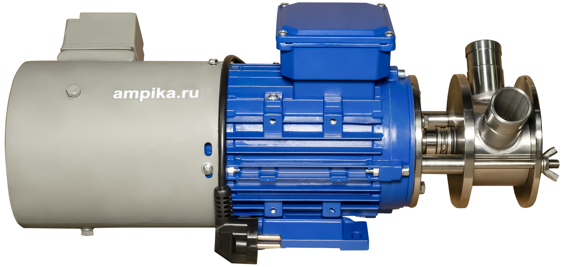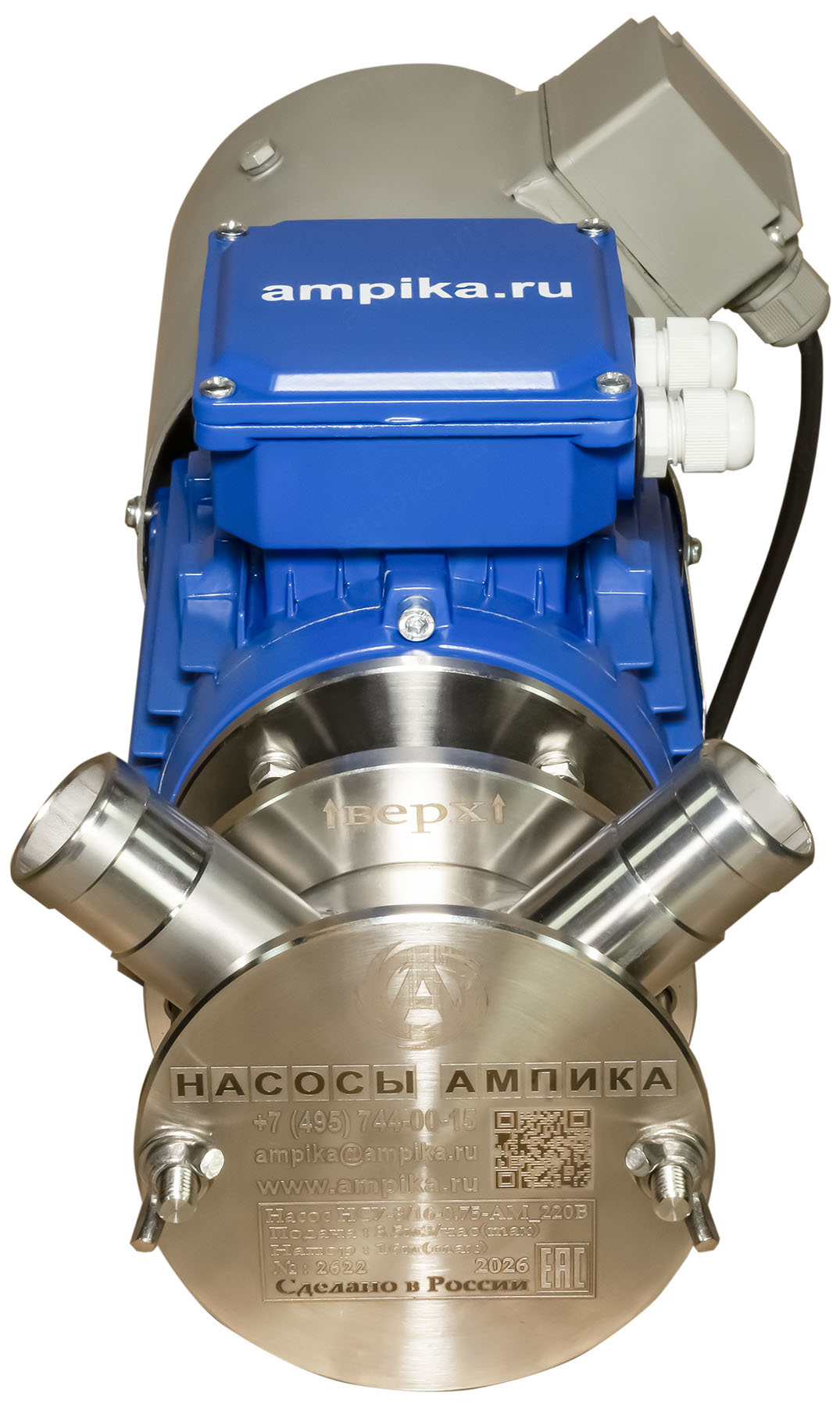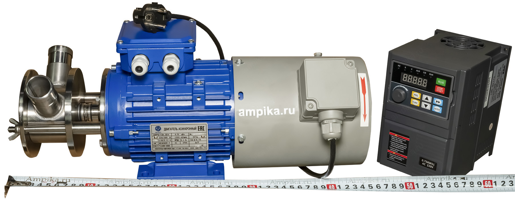 Импеллерный насос Ампика НСУ-3/16-0,75-АМ_220В с ЧРППищевой насос изменяемой производительности НСУ-3-16-0,75-АМ_220В с частотно-регулируемым приводом и дополнительным вентилятором принудительного охлаждения. НАЗНАЧЕНИЕ: Насос импеллерный марки НСУ-АМ предназначен для перекачивания жидких и средневязких веществ, неагрессивных к материалам насоса, содержащих твёрдые включения с размером частиц до 3 мм. Например: молоко, сметана, майонез, соус, яблочное пюре, масло, дизельное топливо и т.п. Можно качать горячие продукты. Основным преимуществом данной марки насосов заключается в том, что при транспортировке продукта целостность структуры не нарушается. Перекачиваемый продукт всасывается без предварительной заливки в камеру насоса. НСУ-АМ надёжен и удобен в обслуживании, его легко разобрать, промыть и собрать обратно. Высота самовсасывания НСУ-АМ - до 2-5 метров, в зависимости от условий и оборотов ротора. Температура перекачиваемой жидкости - до +90 С. Уплотнение вала - одинарное торцевое, материалы зависят от перекачиваемых жидкостей. Возможна установка различных импеллеров: - из маслобензостойкой (МБС) резины, - из пищевой резины, - из щелочестойкой резины. МАРКИРОВКА: НСУ-3/16-0,75-АМ (с ЧРП) - НСУ - насос самовсасывающий универсальный (крыльчатка 74х51 мм), - 3 - производительность в кубометрах в час (номинальная, по воде), - 16 - напор в метрах водяного столба (номинальный, по воде), - 0,75 - мощность электродвигателя, кВт, - АМ - производство Ампика, - 220В - электропитание от одной фазы 220 вольт, - c ЧРП - с частотно-регулируемым приводом и дополнительным вентилятором принудительного охлаждения. (вентилятор нужен, т.к. при снижении оборотов эффективность штатного вентилятора электродвигателя падает и он не может нормально охлаждать двигатель). ПРЕИМУЩЕСТВА НАСОСОВ СЕРИИ НСУ-АМ: - за счет использования малого фланца, уменьшаются габариты насоса, - вал насоса цельный, без наконечников и удлинителей, - насосная часть разбирается путем откручивания просто руками двух гаек-барашков на 5 частей (2 фланца, импеллер, торцевое уплотнение и корпус насоса), что позволяет быстро разбирать насос для промывки, - проточная часть изготовлена из нержавеющей стали 12Х18Н10Т, - импеллер (крыльчатка) имеет металлическую втулку со шлицевым соединением, что увеличивает его ресурс (в отличии от импеллеров без втулки), а также позволяет его снимать без использования специального инструмента, - на фланце, который крепится к э/д, установлено дополнительное манжетное уплотнение, что исключает попадание продукта в электродвигатель при выходе из строя основного торцевого уплотнения вала, - российское производство (Насосы Ампика), что гарантирует поставки любых запчастей и сервисное обслуживание в Москве, - минимальные сроки изготовления и поставки, складское наличие, - возможность изготовления по техническим условиям заказчика. В стандартном исполнении насосы НСУ поставляются со штуцерами под шланг Ду32 мм, расположенными по схеме "V" (как на фотографиях). Возможно изготовление с расположением патрубков по схеме "L" (один вверх, другой вбок). Также возможно изготовление с пищевыми (молочными) гайками различных диаметров. На последней фотографии - специальное заказное исполнение для пивоварни: этот насос установлен на тележке из нержавеющей стали, оснащён частотным регулятором и молочными г