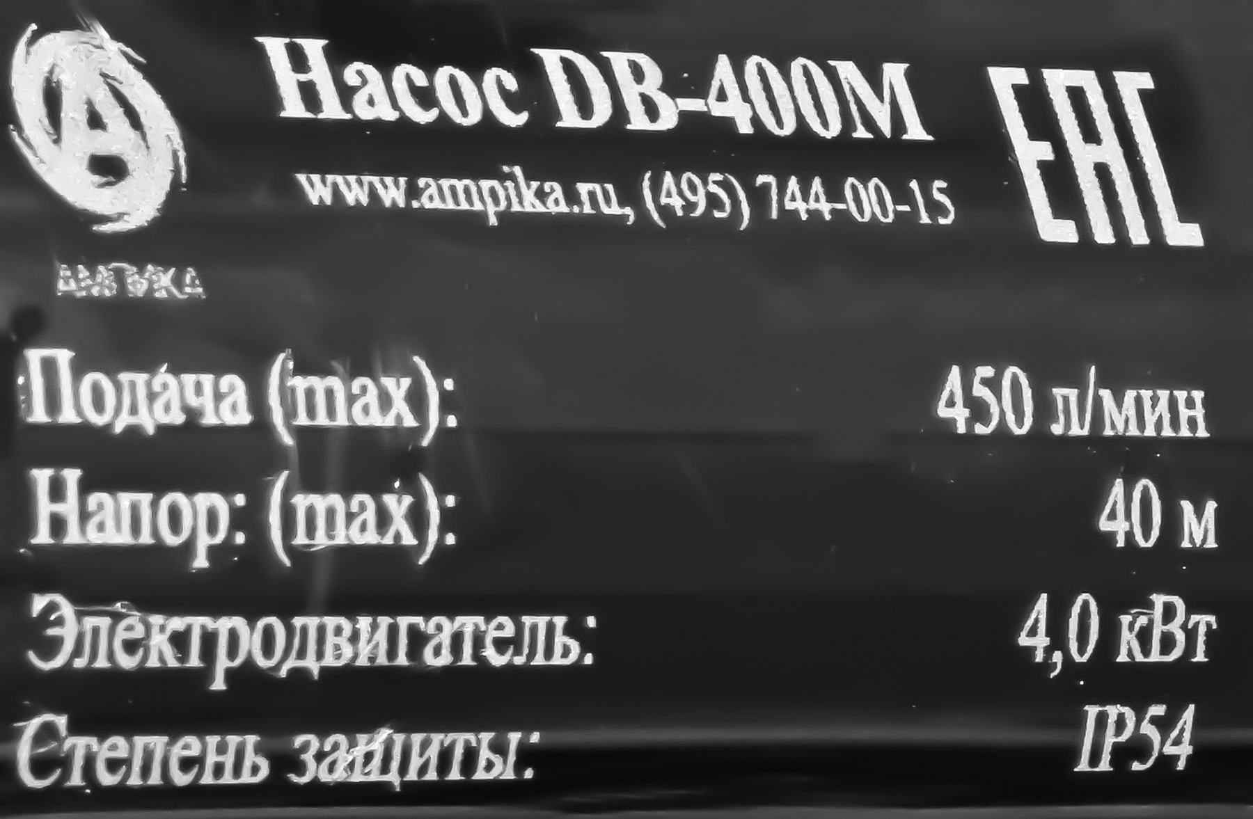 Это новая модель, производится с 2017 года, после модернизации (об этом говорит буква М в названии). Насос DB 400 имеет самые высокие рабочие характеристики среди линейки шиберных топливных насосов DB. Трёхфазный электродвигатель мощностью 4 кВт обеспечивает ему производительность до 450 литров в минуту и давление на выходе до 4 атмосфер. Насосы самовсасывающий, то есть может всасывать "насухую", без предварительного заполнения насосной части перекачиваемой жидкостью. Высота самовсасывания - до 4,5 метров. DB-400 имеет встроенный перепускной клапан (байпасс), что позволяет ему без вреда для себя работать на закрытую задвижку (в стену). Технические характеристики: • принцип действия насоса - шиберный, • максимальная подача - 27 м³/час, • максимальное создаваемое давление насоса - 4 атм. • материал проточной части - чугун, • уплотнение вала - торцевое, • электродвигатель взрывозащищённый, на 380 вольт. Присоединительные патрубки насоса DB-400M предназначены для подключения быстроразъемного соединения типа "камлок-мама" размером 3 дюйма (Камлок C-75 мм или Камлок D-75 мм). ВНИМАНИЕ! С конца 2013 года изменились размеры лопаток в насосах. При заказе обращайте внимание на их цвет и размеры!!! В старых насосах лопатки черные и гладкие, в новых - коричневые и с пазами. Тип лопаток можно определить, посмотрев во всасывающий патрубок насоса. Если лопатки не видны, нужно прокрутить ротор за вентилятор электродвигателя. ВНИМАНИЕ! Насос не имеет российского сертификата взрывозащиты!!! Тележка в комплекте с насосом не идёт, поставляется отдельно по заказу. В таблице характеристик насоса указаны его вес и размеры в упаковочном ящике. Параметры голого насоса: • длина: 620 мм, • ширина: 460 мм, • высота: 370 мм, • вес: 100 кг. Паспорт (инструкция по эксплуатации насоса) вложен в его упаковочную коробку. Другие модели этого типа
