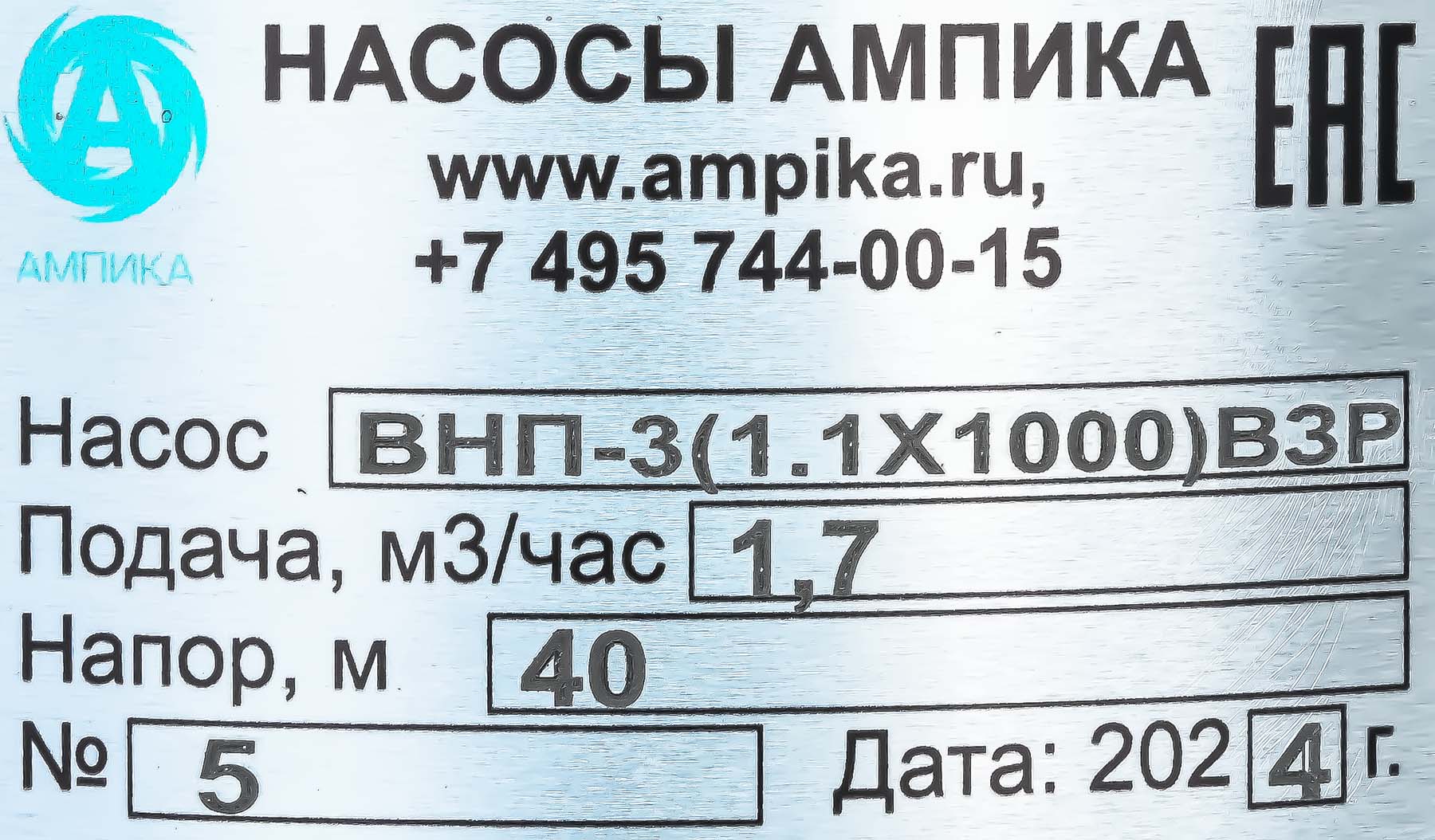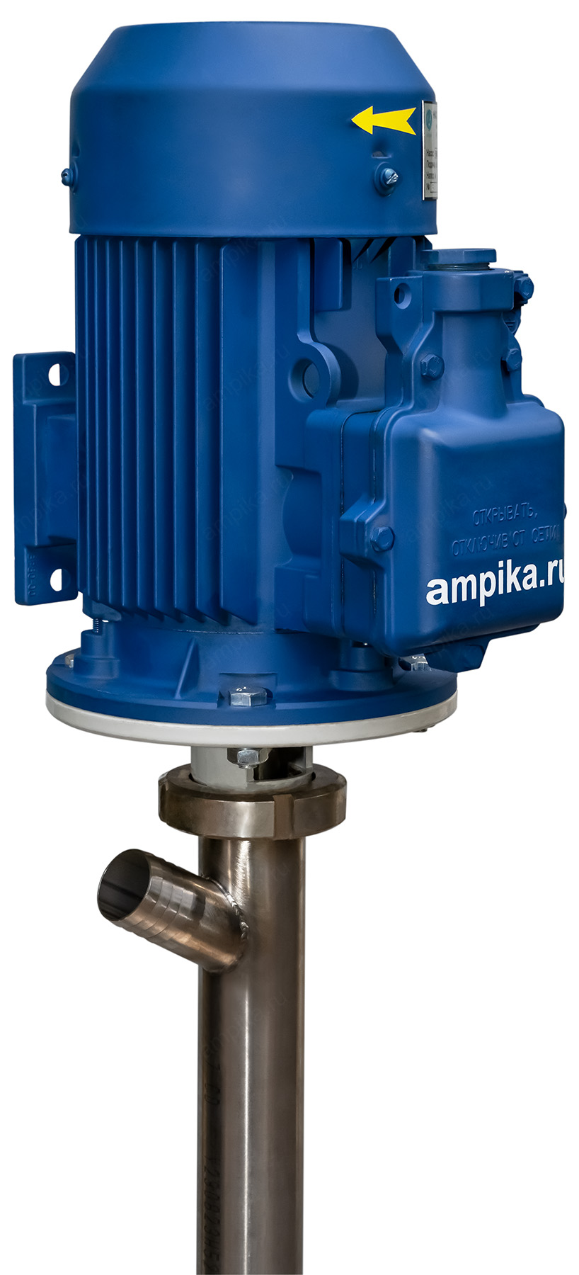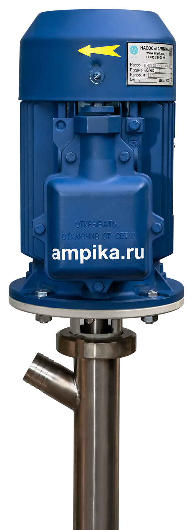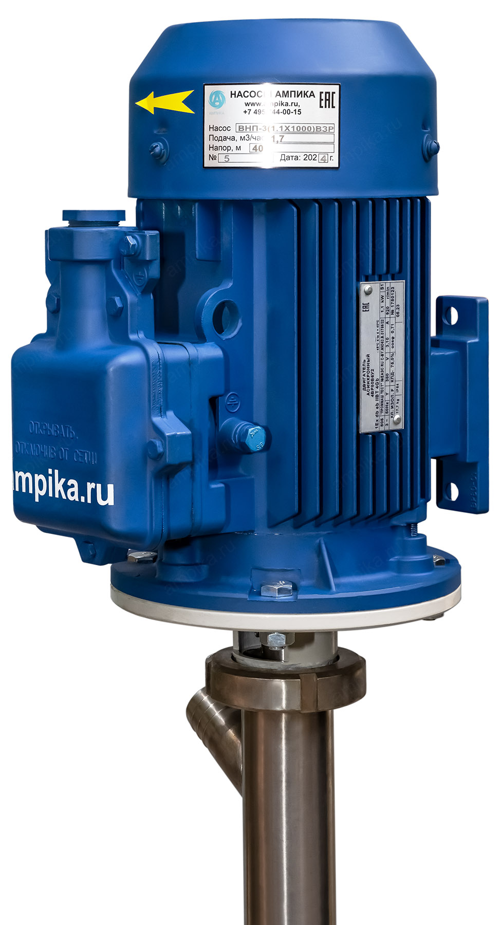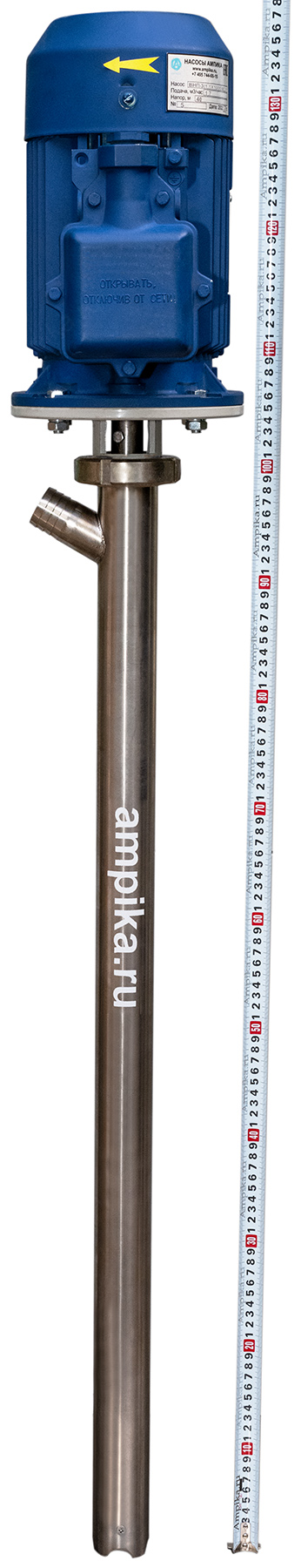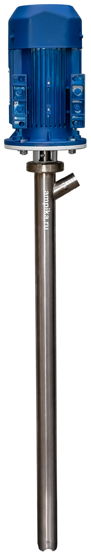 Винтовой полупогружной насос Ампика ВНП-3 (1,1х1000) ВЗРПромышленный взрывозащищённый бочковой полупогружной насос ВНП-3 (1,1х1000) ВЗР предназначен для выкачивания жидких веществ с вязкостью до 10000 мПа*с из бочек 200 литров, 60-литровых, фляг и любых других емкостей глубиной до 1 метра. Насос называется полупогружным потому, что верхняя часть (электродвигатель) всегда над ёмкостью. Особенностью данного насоса является применение электродвигателя во взрывозащищенном исполнении, что позволяет использовать его во взрывоопасных зонах, а также даёт возможность работать с некоторыми ЛВЖ. Насос может использоваться например перекачки для таких жидкостей, как краски, лаки, клеи, турбинные, трансмиссионные, моторные и гидравлические масла, дизельное топливо, бензин, мазут, этиленгликоль, пропиленгликоль, жидкие эпоксидные смолы и подобных жидкостей, не агрессивных к материалам насоса. В стандартном исполнении эта модель комплектуется статором из полиуретана и уплотнением вала из витона. Размер пропускаемых частиц - до 3 мм, не более 10% по объёму. В качестве привода устанавливается трёхфазный электромотор с оборотами выходного вала 920 мин⁻¹. Это позволяет перекачивать жидкости средней вязкости, например трансмиссионные масла. Рекомендуем запитывать насос через частотный преобразователь, т.к. он позволяет подстраивать обороты ротора в зависимости от вязкости жидкости, которая может меняться. Следует помнить, что чем больше будет вязкость (максимальная - 10000 сПз), тем ниже будет производительность насоса (подача в таблице указана на воде). ВНИМАНИЕ! Этот насос НЕ ПРЕДНАЗНАЧЕН для полиэфирных смол, отвердителей, кислот, щелочей, растворителей!!! Уточняйте возможность работы насоса с конкретной жидкостью у поставщика!!! Технические характеристики: 1) Принцип действия - винтовой (героторный насос). 2) Глубина погружения - 1000 мм (возможно изготовление с глубиной погружения до 2000 мм под заказ). 3) Материал проточной части (трубы) – нержавеющая сталь марки AISI 304. 4) Материалы внутренних деталей (винт, торсион, наконечник вала двигателя, фланец под торцевое уплотнение): 40Х13 (винт закалённый). 5) Уплотнение вала торцевое, с парой трения из карбида кремния и эластомером из витона (фторкаучук). Возможна установка уплотнения из EPDM. 6) Материал обоймы: полиуретан (самый износостойкий материал). Возможна установка обойм из: - пищевой резины 25-52-563 (NBR), - витона (фторкаучука), - износостойкой МБС резины 7-В-14. 7) Диаметр погружной части: 53 мм. 8) Выход насоса – штуцер под шланг 32 мм (возможна установка молочной муфты Ду32 под заказ). 9) Электродвигатель: взрывозащищённый, на 380 вольт, 1,1 кВт, степень защиты 1ExdIIBT4, с возможностью постоянной работы. ВНИМАНИЕ! Разрешение на применение во взрывоопасных зонах ТР ТС 012/2011 есть только на электродвигатель. На сам насос есть только декларация соответствия ТР ТС 010/2011. Другие модели этого типа