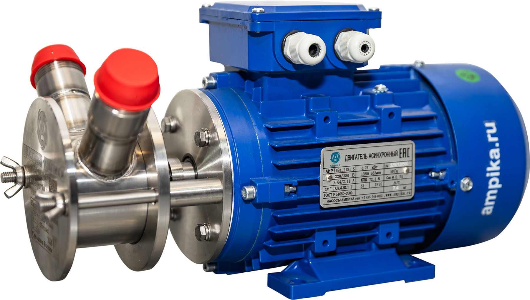 Молочные муфты Ду32 мм (2 шт, с приваркой)Насос импеллерный марки НСУ-АМ предназначен для перекачивания жидких и средневязких веществ, неагрессивных к материалам насоса, а также веществ, содержащих твердые включения с размером частиц до 3 мм. Например: молоко, кефир, йогурт, жидкая сметана, майонез, соус, яблочное пюре, масло, дизельное топливо, бензин, нефть, и т.п. Основным преимуществом данной марки насосов заключается в том, что при транспортировке продукта целостность структуры не нарушается. Перекачиваемый продукт всасывается без предварительной заливки в камеру насоса. НСУ-АМ надёжен и удобен в обслуживании, его легко разобрать, промыть и собрать обратно. Высота самовсасывания НСУ-АМ - до 2-5 метров, в зависимости от условий и оборотов ротора. Температура перекачиваемой жидкости - до +90С. Уплотнение вала - одинарное торцевое (в стандартном исполнении - витон. Не обозначается в маркировке). Материалы зависят от конкретного исполнения. Для жидкостей со взвешенными частицами и липких веществ возможно исполнение с сальниковым уплотнением. Стандартное исполнение - со штуцерами под шланг внутренним диаметром 32 мм, возможно изготовление с пищевыми гайками. Возможна установка различных импеллеров: - из маслобензостойкой, кислотостойкой резины (витон), - из пищевой резины неопрен (стандартное исполнение, не обозначается в маркировке), - из щелочестойкой резины EPDM. МАРКИРОВКА: НСУ-1,8/12-0,25-АМ (крыльчатка, уплотнение EPDM)(с ЧРП) - НСУ - Насос Самовсасывающий Универсальный (крыльчатка 74х51 мм), - 1,8 - производительность в кубометрах в час (номинальная, по воде), - 12 - напор в метрах водяного столба (номинальный, по воде), - 0,25 - мощность электродвигателя, кВт, - АМ - производство Ампика, - (крыльчатка, уплотнение EPDM) - материалы крыльчатки и уплотнения вала - EPDM. Без обозначения: крыльчатка неопрен, уплотнение вала - витон. - взр. - взрывозащищенный электродвигатель, - МВ - с механическим вариатором, - c ЧРП - с частотно-регулируемым приводом и дополнительным вентилятором принудительного охлаждения, (вентилятор нужен, т.к. при снижении оборотов эффективность встроенного вентилятора падает и он не может нормально охлаждать двигатель), - большой фланец - фланец выполнен по ГОСТ исполнение IM2081, с наконечником вала. ПРЕИМУЩЕСТВА: - за счет использования малого фланца, уменьшаются габариты насоса (только в общепромышленном исполнении, 71 высоты), - вал насоса цельный, без наконечников и удлинителей, что положительно сказывается на долговечности, - насосная часть разбирается путём откручивания просто руками двух гаек-барашков на 5 частей (2 фланца, импеллер, торцевое уплотнение и корпус насоса), что позволяет быстро разбирать насос для промывки, - проточная часть изготовлена из нержавеющей стали 12Х18Н10Т, - импеллер (крыльчатка) имеет металлическую втулку со шлицевым соединением, что увеличивает его ресурс (в отличии от импеллеров без втулки), а также позволяет его снимать без использования специального инструмента, - на фланце, который крепится к э/д, установлено дополнительное манжетное уплотнение, что исключает попадание продукта в электродвигатель при выходе из строя основного торцевого уплотнения вала, - российское производство (производитель - фирма Насосы Ампика), что гарантирует поставки любых запчастей и сервисное обслуживание в Москве, - минимальные сроки из