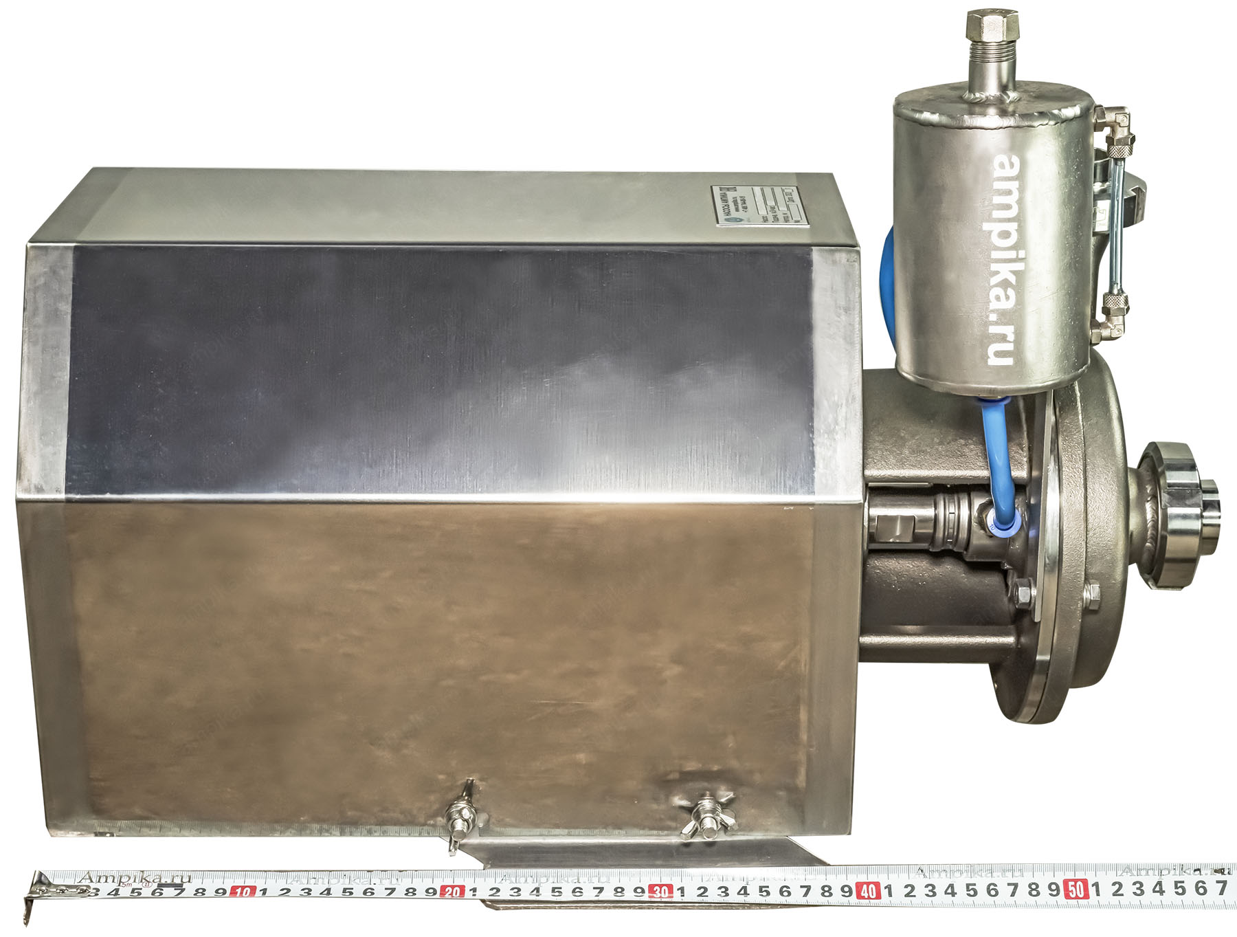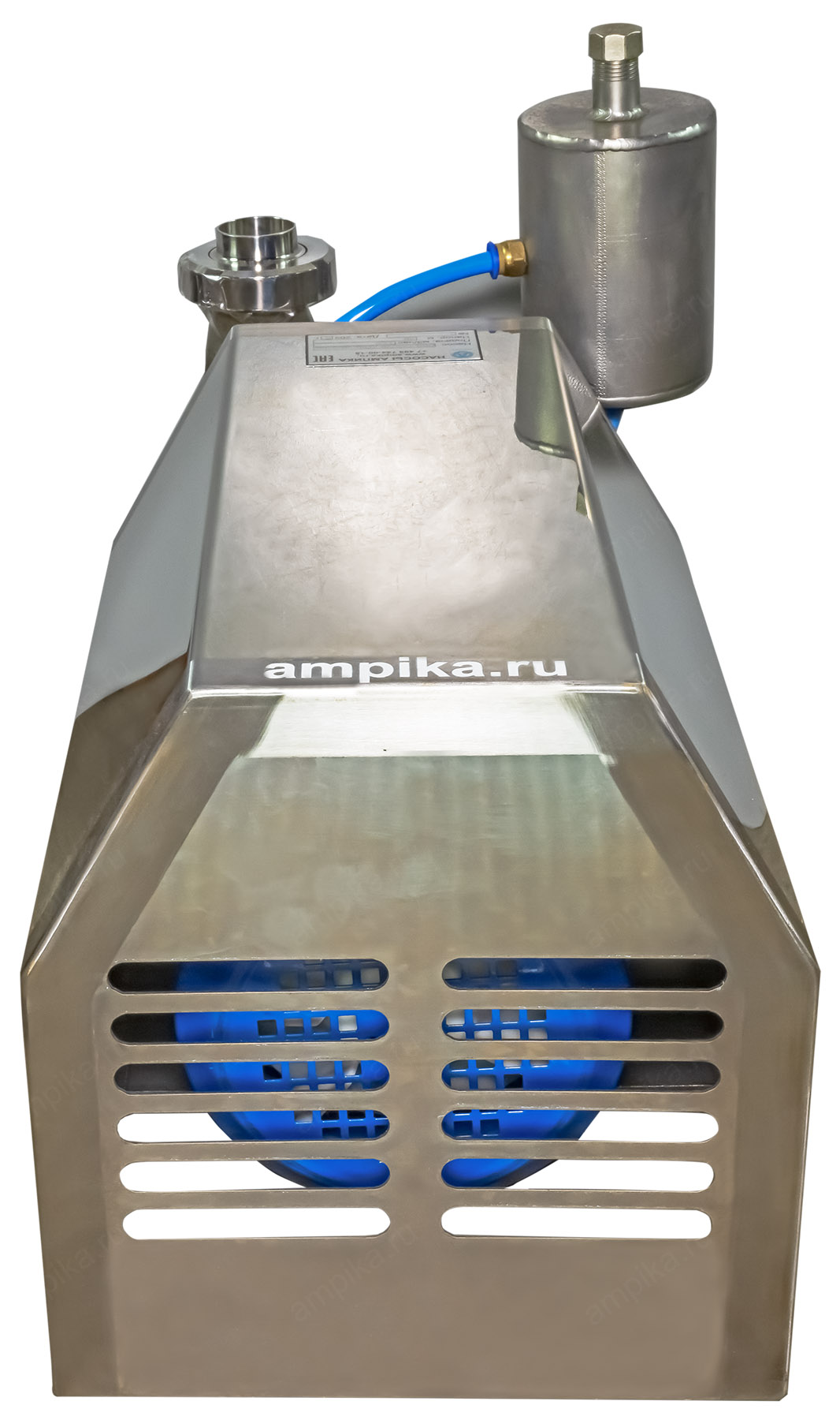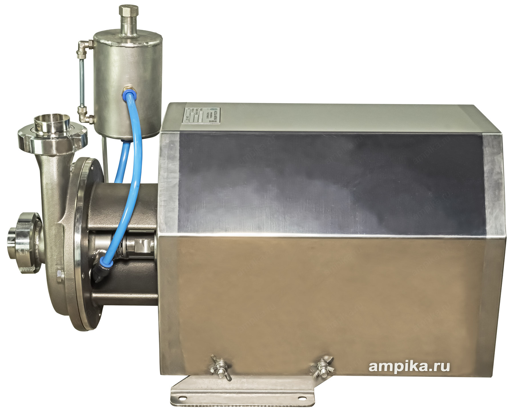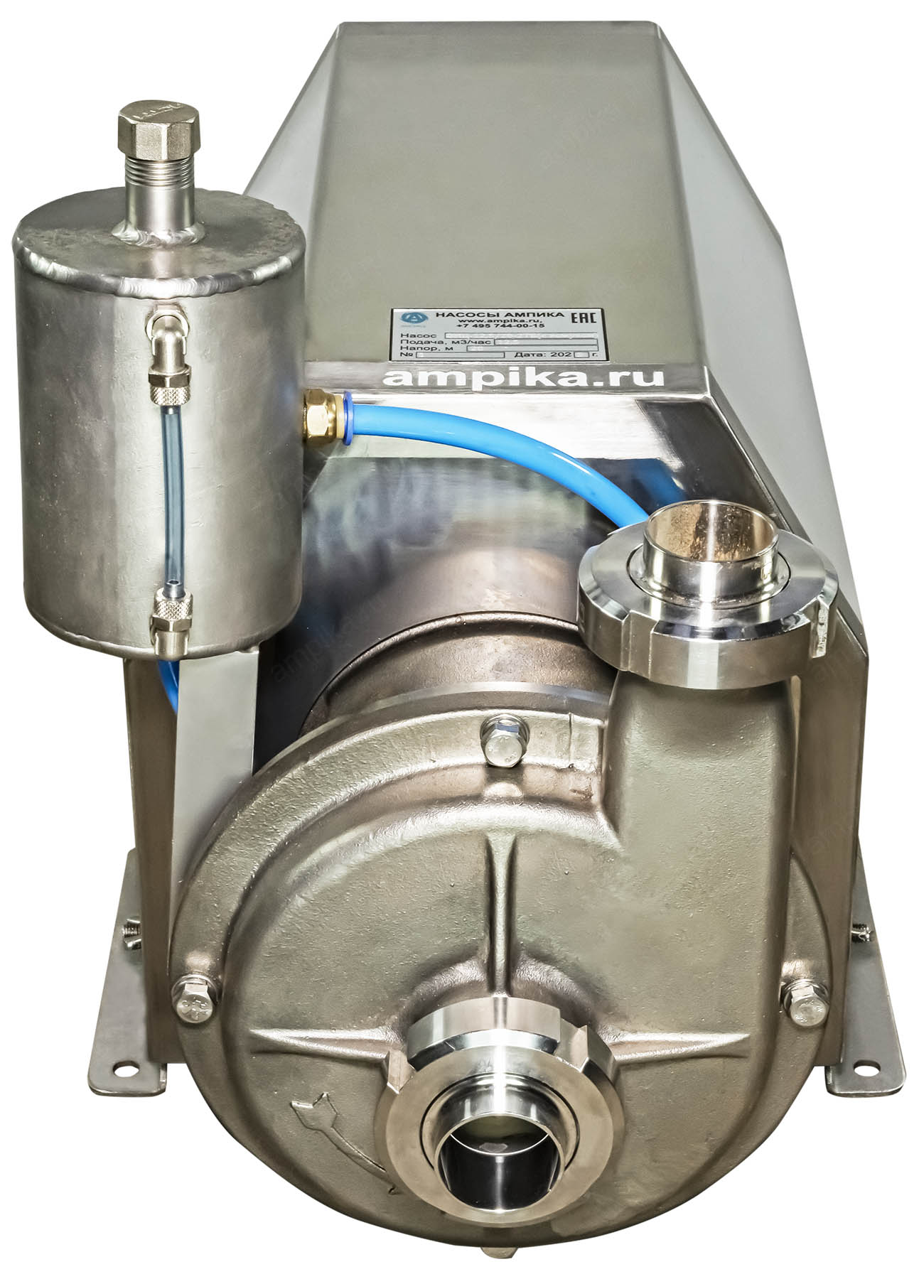 Пищевой насос Ампика ОНЦ-12,5/20-2ТБ (с кожухом)Рабочее колесо открытого типа позволяет перекачивать жидкости с частицами до 10 мм, такие как: пивной затор, барда, пивное сусло и т.п. При комплектации взрывозащищенным электродвигателем (по запросу), возможна перекачка взрывоопасных жидкостей, например различных спиртов, коньяка, водки и т.п. Максимальная вязкость жидкости - до 300 мПа*с. Корпус проточной части насоса и рабочее колесо изготовлены методом литья из стали 12Х18Н10Т и имеют повышенный ресурс, т.к. у них больше толщина стенки по сравнению с насосами, выполненными штамповкой. Вход/выход - молочные муфты Ду40, DIN 11851. Все насосы укомплектованы нержавеющим кожухом, который защищает электродвигатель от возможного попадания жидкости при мытье оборудования. Температура жидкости: до +95 ºC при установке одинарного торцевого уплотнения (-Т) и до +140 ºC, при установке двойного торцевого уплотнения (-2Т). Возможно изготовление насосов ОНЦ как с проточным охлаждением узла торцевого уплотнения (-2Т), так и с автономным гидрозатвором: с бачком (-2ТБ). Расшифровка условного обозначения на примере насоса ОНЦ-12,5/20-Т: - ОНЦ - насос центробежный для пищевой промышленности, - 12,5 - подача в м³/час, - 20 - напор в метрах, - Т - одинарное торцевое уплотнение, - 2Т - двойное торцевое уплотнение, - Б - бачок (автономный гидрозатвор). Дополнение к описанию: Небольшой промышленный центробежный пищевой насос из нержавеющей стали ОНЦ 12,5/20-2ТБ (с кожухом) - с системой промывки узла двойного торцевого уплотнения. В своём оптимальном режиме работы перекачивает 200 литров продукта за минуту, создавая давление 2 атмосферы. Электродвигатель общепромышленного исполнения, трёхфазный, мощностью 3000 ватт, находится под кожухом из нержавеющей стали. На заднем торце кожуха сделаны вентиляционные прорези для охлаждения электромотора. Другие модели этого типа