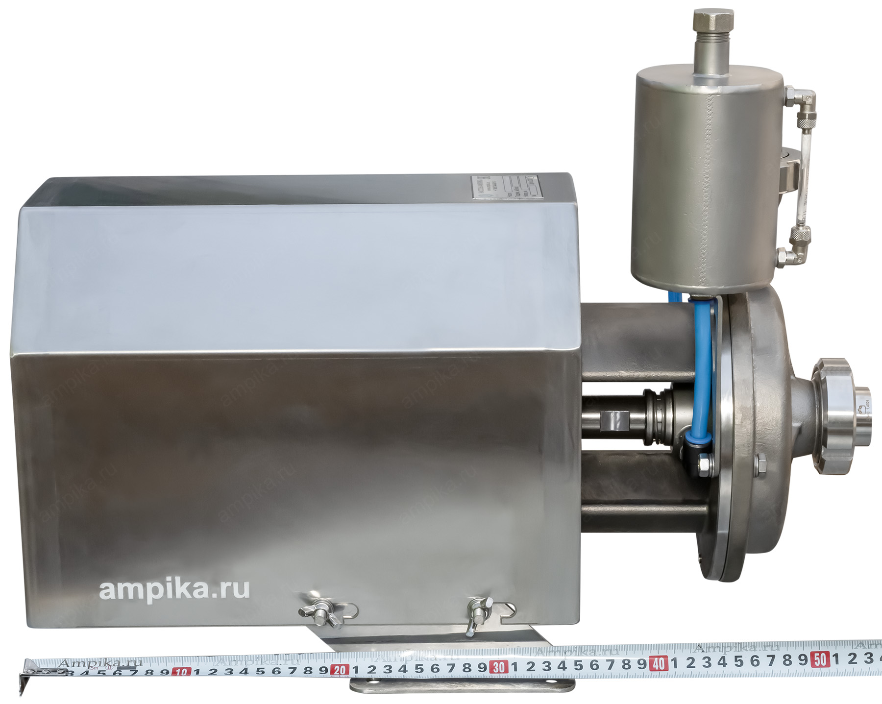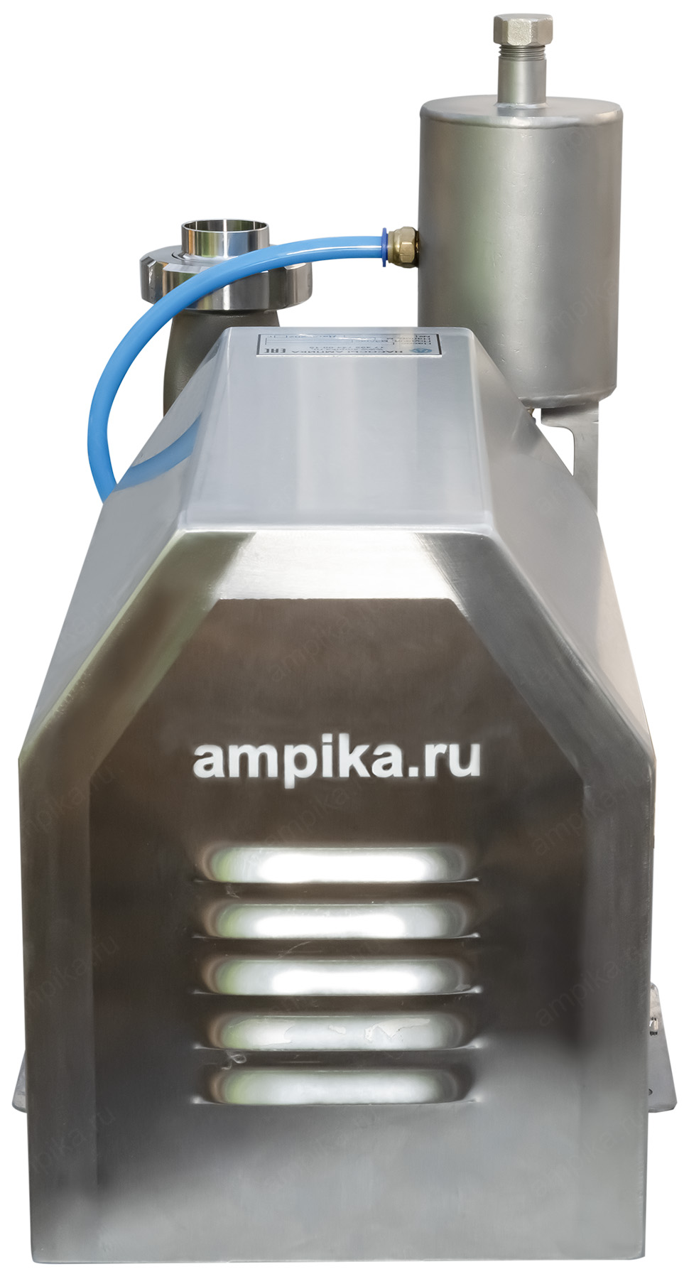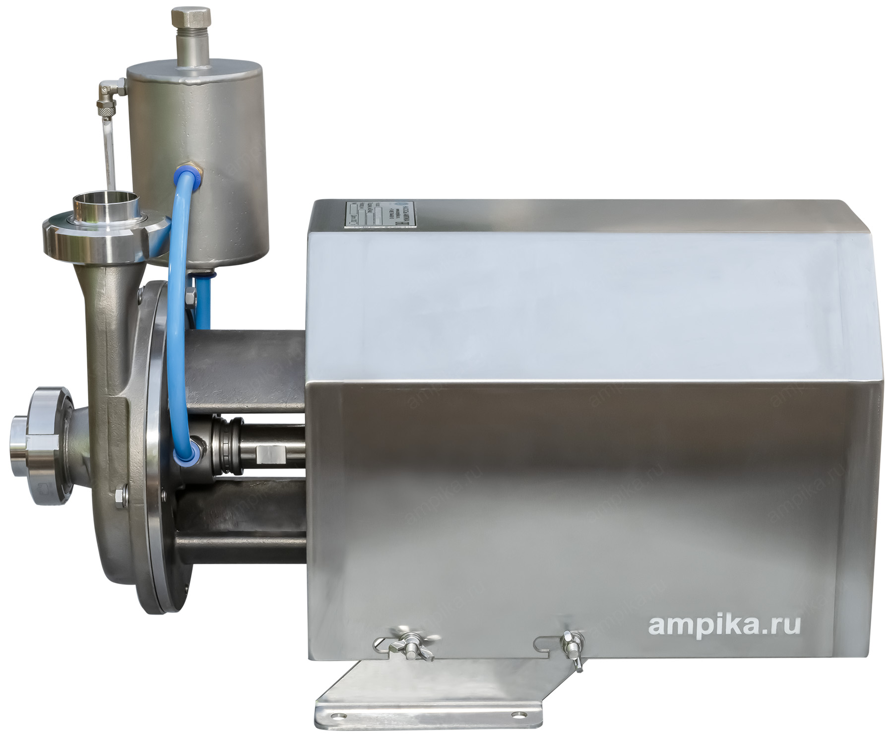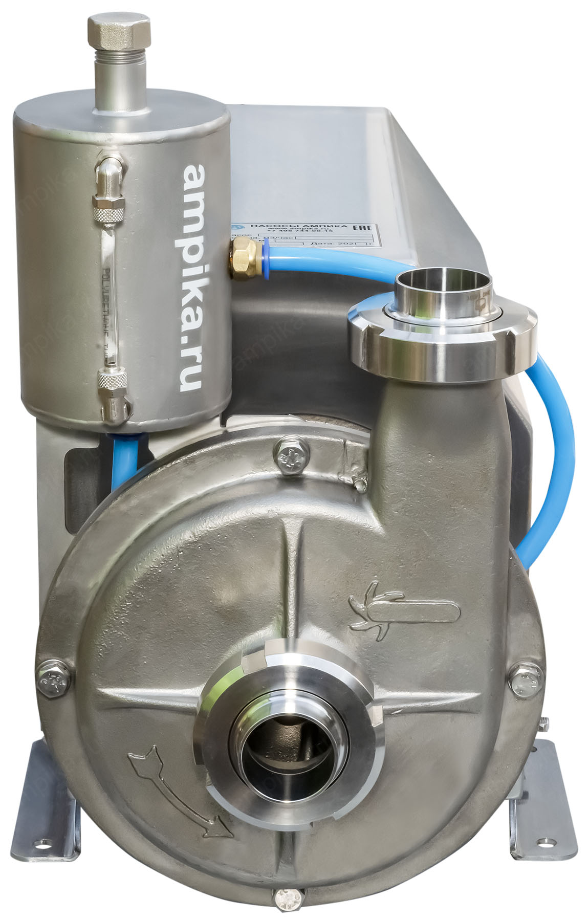 Пищевой насос Ампика ОНЦ-6,3/20-2ТБ (с кожухом)Рабочее колесо открытого типа позволяет перекачивать жидкости с частицами до 10 мм, такие как: пивной затор, барда, пивное сусло и т.п. При комплектации взрывозащищенным электродвигателем (по запросу), возможна перекачка взрывоопасных жидкостей, например различных спиртов, коньяка, водки и т.п. Максимальная вязкость жидкости - до 300 мПа*с. Корпус проточной части насоса и рабочее колесо изготовлены методом литья из стали 12Х18Н10Т и имеют повышенный ресурс, т.к. у них больше толщина стенки по сравнению с насосами, выполненными штамповкой. Вход/выход - молочные муфты Ду40, DIN 11851. Все насосы укомплектованы нержавеющим кожухом, который защищает электродвигатель от возможного попадания жидкости при мытье оборудования. Температура жидкости: до +95 ºC при установке одинарного торцевого уплотнения (-Т) и до +140 ºC, при установке двойного торцевого уплотнения (-2Т). Возможно изготовление насосов ОНЦ как с проточным охлаждением узла торцевого уплотнения (-2Т), так и с автономным гидрозатвором: с бачком (-2ТБ). Расшифровка условного обозначения на примере насоса ОНЦ-12,5/20-Т: - ОНЦ - насос центробежный для пищевой промышленности, - 12,5 - подача в м³/час, - 20 - напор в метрах, - Т - одинарное торцевое уплотнение, - 2Т - двойное торцевое уплотнение, - Б - бачок (автономный гидрозатвор). Дополнение к описанию: Небольшой промышленный центробежный пищевой насос из нержавеющей стали ОНЦ 6,3/20-2ТБ (с кожухом) - с системой промывки узла двойного торцевого уплотнения. В своём оптимальном режиме работы перекачивает 100 литров продукта за минуту, создавая давление 2 атмосферы. Электродвигатель общепромышленного исполнения, трёхфазный, мощностью 1500 ватт, находится под кожухом из нержавеющей стали. На заднем торце кожуха сделаны вентиляционные прорези для охлаждения электромотора. Другие модели этого типа