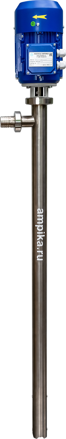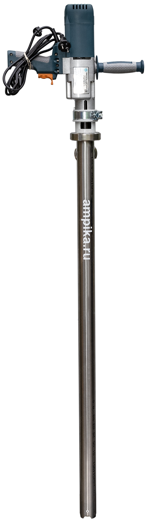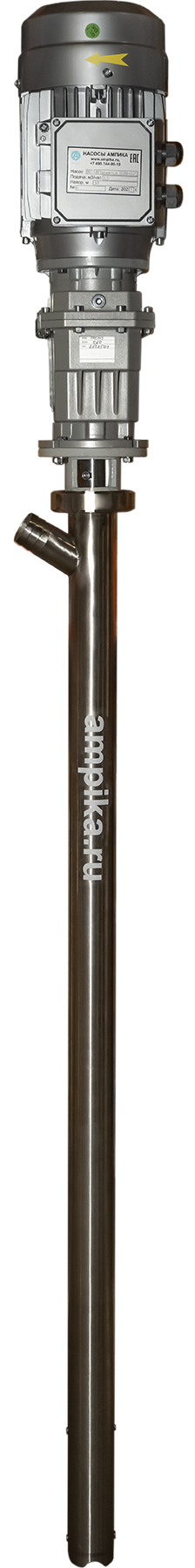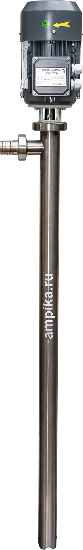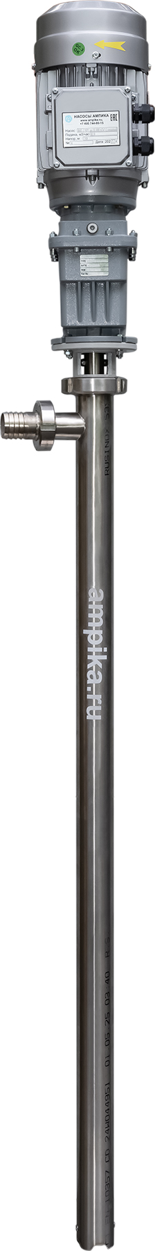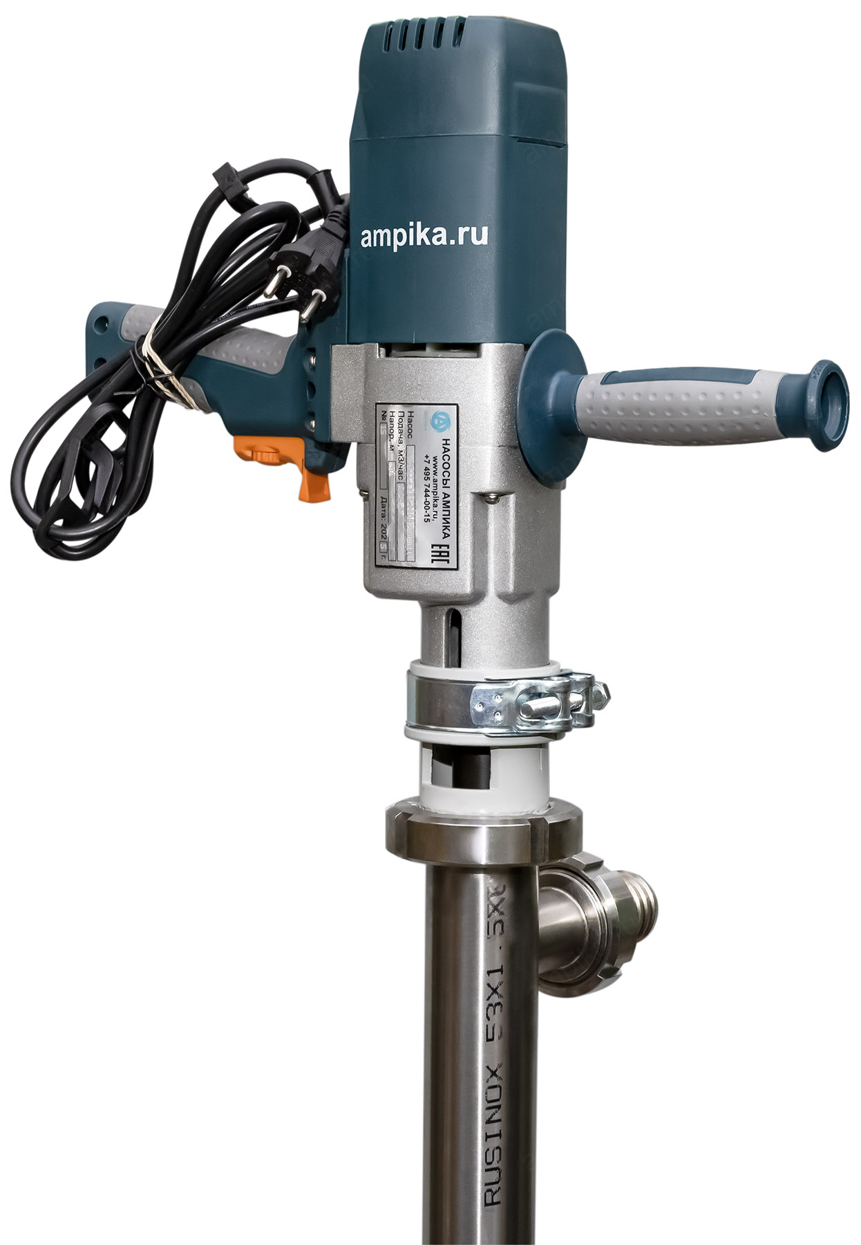Винтовой полупогружной насос Ампика ВНП-3 (1,3 кВт_220В) пищевойЛёгкий электрический бочковой полупогружной насос ВНП-3 (1,3 кВт_220В) предназначен для выкачивания жидких пищевых продуктов с вязкостью до 10000 мПа*с из бочек 200 литров, 60-литровых бочонков, фляг и любых других емкостей глубиной до 1,2 метра. Насос называется полупогружным потому, что верхняя часть (электродвигатель) всегда над ёмкостью. В качестве привода устанавливается однофазный электромотор от дрели с регулируемыми оборотами выходного вала 650-1000 мин⁻¹, питающийся от обычной бытовой розетки. Тихоходность позволяет перекачивать жидкости средней вязкости, например растительные масла. В стандартном исполнении эта модель комплектуется обоймой (статором) из белой пищевой резины и уплотнением вала из витона. Такой насос может использоваться например перекачки для таких жидкостей, как пищевые масла, концентраты соков, майонез, сметана, мёд, ягодные и фруктовые пюре, молочные продукты (кефир, ряженка, сметана, сгущёное молоко), томатная паста, для некоторых щелочных жидкостей и любых других химически неагрессивных к материалам насоса. Примеры непищевых жидкостей, которые может качать этот насос: косметическое сырьё, глицерин, шампунь, жидкое мыло, лауретсульфат натрия, бутилгликоль, жидкое стекло, различные ПАВы. ВНИМАНИЕ! Этот насос НЕ ПРЕДНАЗНАЧЕН для полиэфирных смол, отвердителей, кислот, щелочей, растворителей!!! Уточняйте возможность работы насоса с конкретной жидкостью у наших менеджеров!!! Следует также помнить, что чем больше будет вязкость перекачиваемой жидкости (максимальная - 10000 сПз), тем ниже будет производительность насоса (подача в таблице указана на воде). Максимальная температура перекачиваемой жидкости: +80ºC. Размер пропускаемых частиц - до 3 мм, не более 10% по объёму. Насос можно промывать дезрастворами с концентрацией 1-2%. Технические характеристики: 1) Принцип действия - винтовой (героторный насос). 2) Глубина погружения - 1200 мм (возможно изготовление с глубиной погружения до 2000 мм под заказ). 3) Материал проточной части (трубы) – нержавеющая сталь марки AISI 304. 4) Материалы внутренних деталей (винт, торсион, наконечник вала двигателя, фланец под торцевое уплотнение): 40Х13 (винт закалённый). 5) Уплотнение вала торцевое, с парой трения из карбида кремния и эластомером из витона (фторкаучук). Возможна установка уплотнения из EPDM. 6) Материал обоймы - пищевая резина 25-52-563 (NBR). Возможна установка обойм из: - полиуретана (самый износостойкий материал), - витона (фторкаучука), - износостойкой МБС резины 7-В-14. 7) Диаметр погружной части: 53 мм. 8) Выход насоса – с ёлочкой под шланг внутренним диаметром 38 мм, крепится к корпусу насоса через молочную муфту, что позволяет быстро отсоединять шланг при необходимости.. 9) Электродвигатель: коллекторный, 2-х скоростной, с возможностью регулировки оборотов. Мощность 1,3 кВт, напряжение питания 220 вольт (стандартный электродвигатель от профессиональной дрели). Режим работы периодический: 10-15 минут работа, затем остановка до полного остывания щёточного мотора. Другие модели этого типа