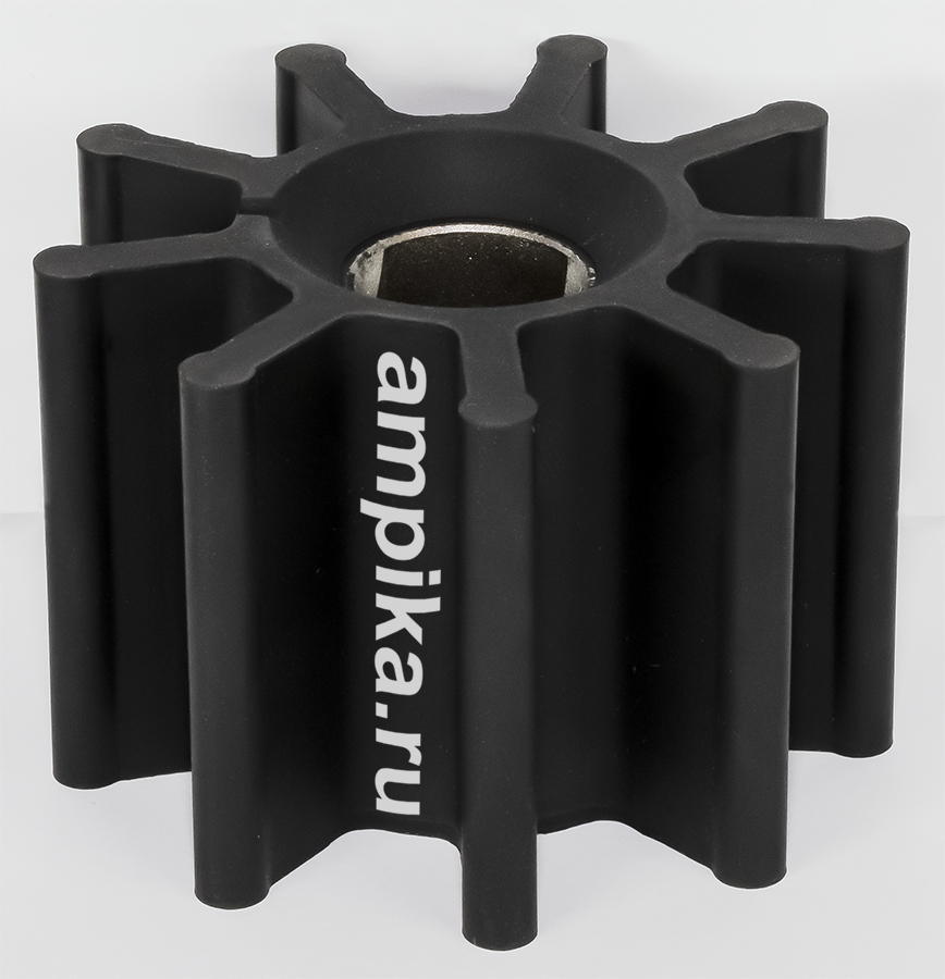 Крыльчатка 2НСУ (FIP40, EPDM)Крыльчатка для импеллерных насосов 2НСУ из резины EPDM (этилен-пропиленовая резина). EPDM - это сокращение от ethylene propylene diene monomer. Вставка (центральная втулка) изготовлена из нержавеющей стали марки AISI 316, для предотвращения проворачивания на ведущем валу на ней сделаны два шлица. Насос с этим импеллером может использоваться для перекачивания щелочных жидкостей. Рабочая температура от -40ºC до +120ºC. На фотографиях видны точки на концах лучей шестерёнки - это технологические литники. Рядом с центральной втулкой в резине сделано углубление для подвода жидкости внутрь крыльчатки для смазки и охлаждения. Другие модели этого типа