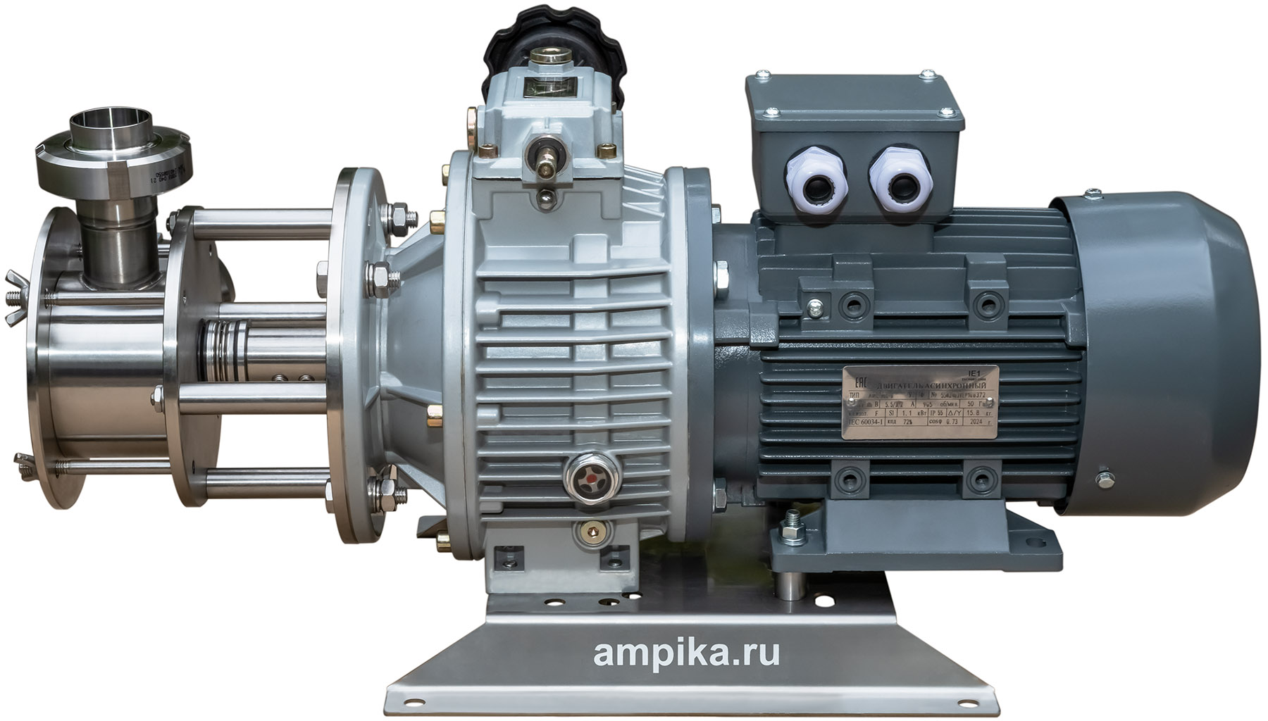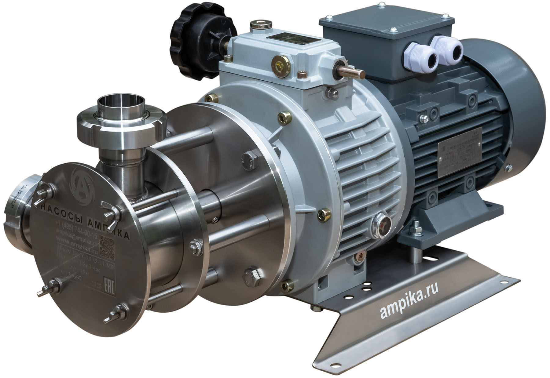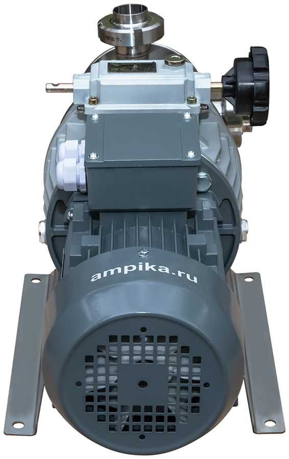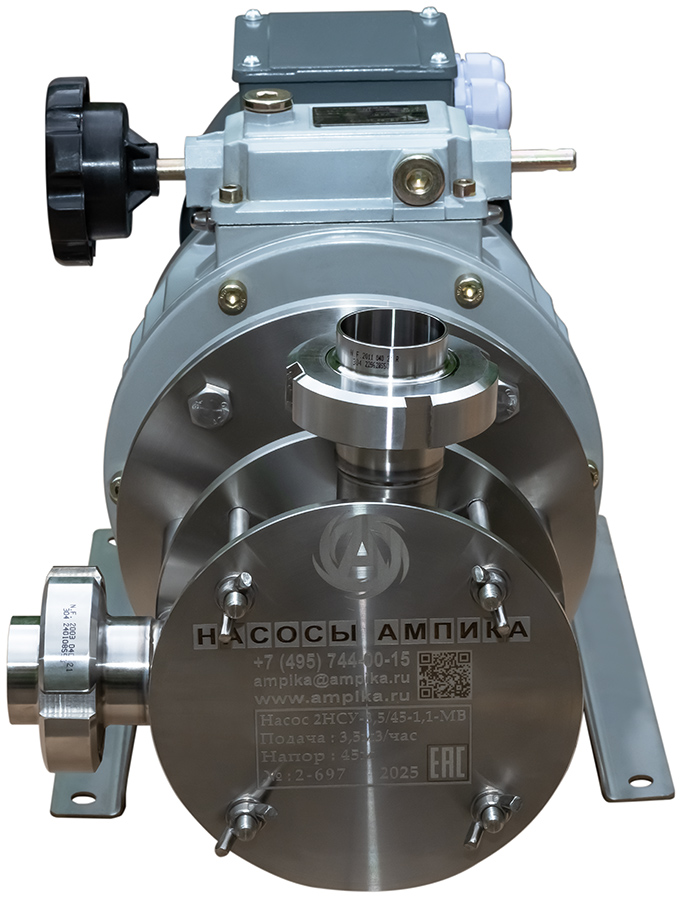 Самовсасывающий насос Ампика 2НСУ-3,5/45-1,1-МВ (с вариатором)Пищевой насос с мягким резиновым ротором 2НСУ-3,5/45-1,1-МВ позволяет механически регулировать производительность. Он даёт сравнительно высокое для подобного типа насосов давление - до 4,5 атмосфер. Двигатель приводит крыльчатку через вариатор. Вариатор позволяет механическим образом плавно изменять обороты вала насоса от 200 до 1000 об./мин., что обеспечивает соответствующее изменение подачи от 0,7 до 3,5 м³/час. Насос с мотором 1,1 кВт предназначается главным образом для перекачки жидких пищевых продуктов, в том числе горячих. Для перекачивания относительно густых и вязких жидкостей в нашей линейке насосов НСУ есть модификация этой модели с электродвигателем мощностью 1,5 кВт. Этот насос с мягким ротором предназначен для перекачки пищевых продуктов, таких как: сметана, майонез, кетчуп, соки, молоко, масла, пивной затор, пивное сусло и схожих с ними нейтральных непищевых жидкостей (например: пенообразователь, глицерин, крахмальный клейстер, жидкое мыло...) при температуре до +90ºC. Возможно перекачивание жидкостей с частицами размером до 5 мм. Насос самовсасывающий, высота самовсасывания - до 3-4 метров (зависит от оборотов). Проточная часть выполнена из нержавейки 12Х18Н10Т. Уплотнение вала - одинарное торцевое. Насос является аналогом насосов FIP40 компании Jonson Pumps, но при этом имеет гораздо более приятную цену вследствие импортозамещения. Производитель - Ампика. Расшифровки маркировки насоса 2НСУ-3,5/45-1,1-МВ: - 2 - типоразмер крыльчатки увеличен (FIP40, диаметр 95 мм, высота 63 мм), - НСУ - насос самовсасывающий универсальный, - 3,5 - максимальная производительность в кубометрах в час (по воде, при свободном изливе), - 45 - максимальный напор в метрах водяного столба (по воде), - 1,1 - мощность трёхфазного (на 380 вольт) электродвигателя, кВт, - МВ - насос с механическим вариатором скорости вращения вала. Стандартное исполнение вход-выход: молочные муфты Ду38 мм. Возможно изготовление с молочными муфтами Ду50 мм, либо со штуцерами под шланг. ВНИМАНИЕ! Если требуется работа насоса с частотным преобразователем, ОБЯЗАТЕЛЬНО нужно сообщить об этом при заказе насоса! В этом случае устанавливается более мощный электродвигатель, т.к. на низкой частоте у стандартного электродвигателя не хватает пускового момента. Другие модели этого типа