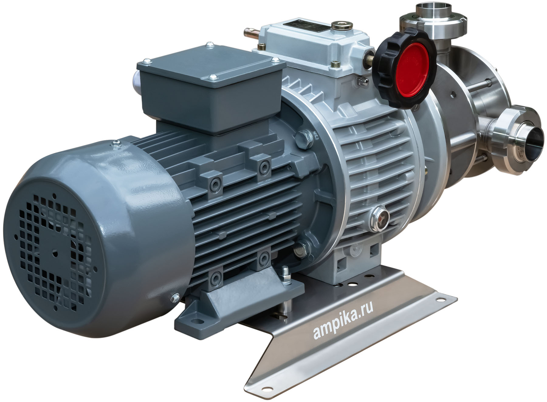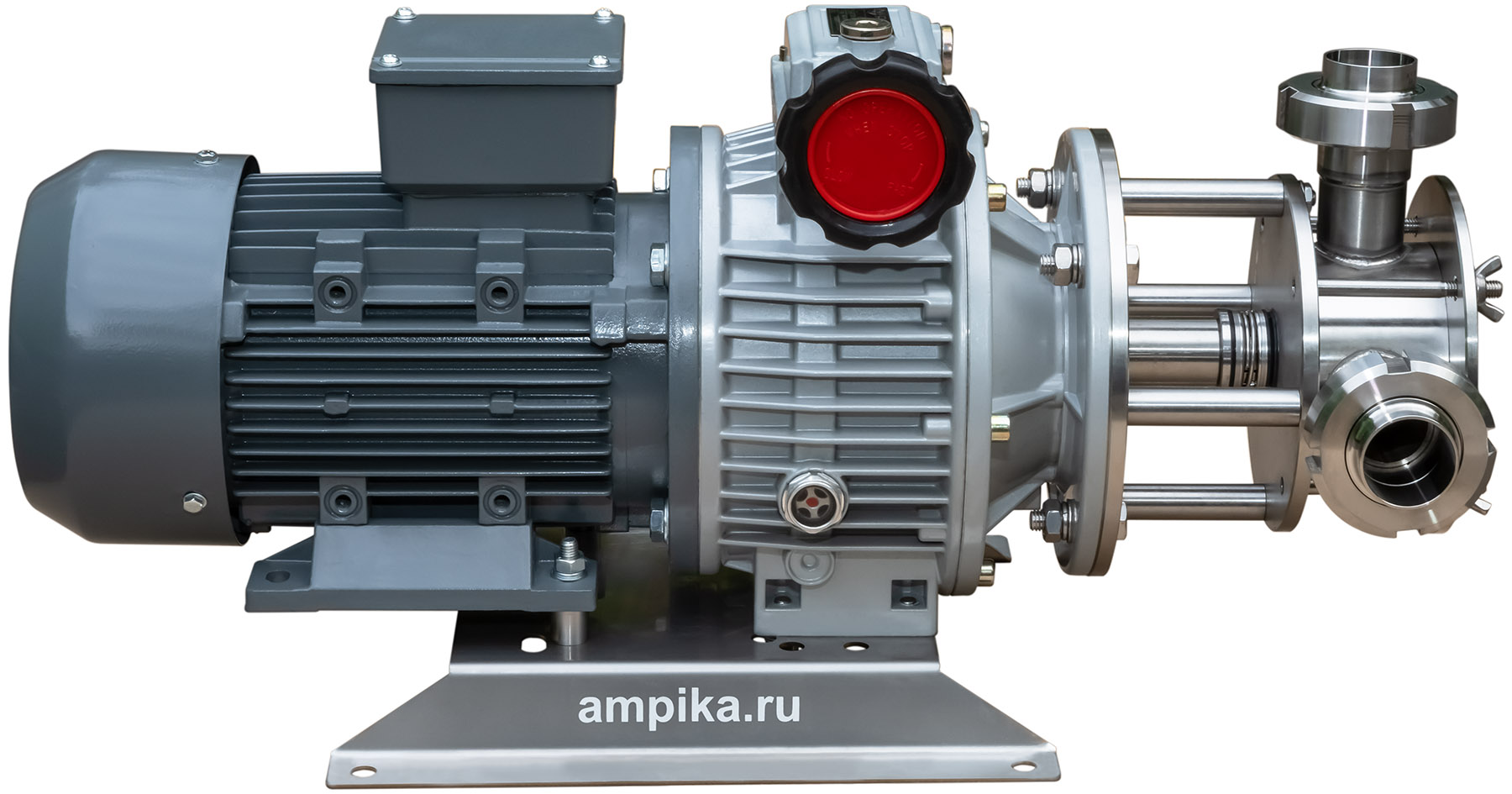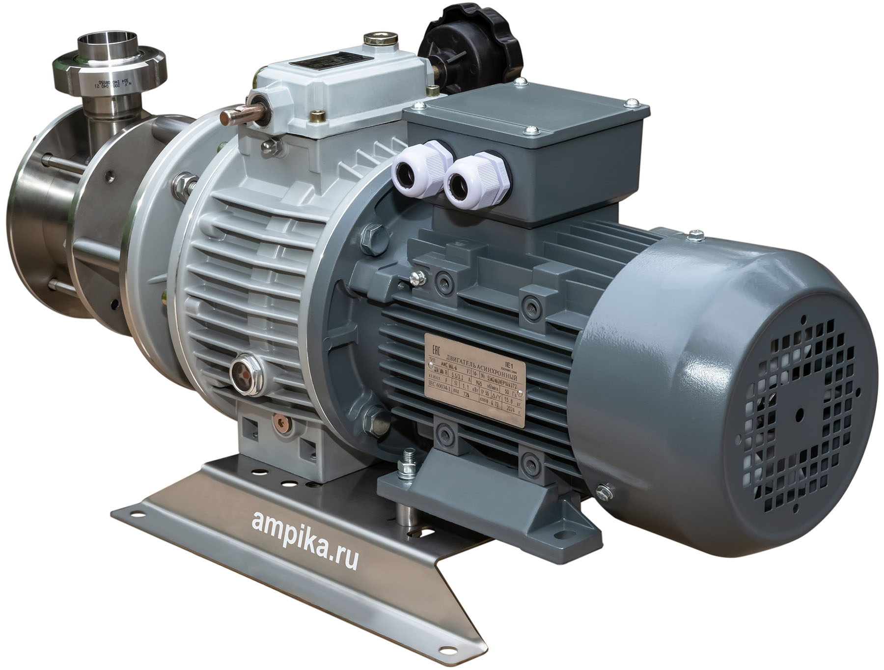 Самовсасывающий насос Ампика 2НСУ-3,5/45-1,1-МВ (с вариатором)Пищевой насос с мягким резиновым ротором 2НСУ-3,5/45-1,1-МВ позволяет механически регулировать производительность. Он даёт сравнительно высокое для подобного типа насосов давление - до 4,5 атмосфер. Двигатель приводит крыльчатку через вариатор. Вариатор позволяет механическим образом плавно изменять обороты вала насоса от 200 до 1000 об./мин., что обеспечивает соответствующее изменение подачи от 0,7 до 3,5 м³/час. Насос с мотором 1,1 кВт предназначается главным образом для перекачки жидких пищевых продуктов, в том числе горячих. Для перекачивания относительно густых и вязких жидкостей в нашей линейке насосов НСУ есть модификация этой модели с электродвигателем мощностью 1,5 кВт. Этот насос с мягким ротором предназначен для перекачки пищевых продуктов, таких как: сметана, майонез, кетчуп, соки, молоко, масла, пивной затор, пивное сусло и схожих с ними нейтральных непищевых жидкостей (например: пенообразователь, глицерин, крахмальный клейстер, жидкое мыло...) при температуре до +90ºC. Возможно перекачивание жидкостей с частицами размером до 5 мм. Насос самовсасывающий, высота самовсасывания - до 3-4 метров (зависит от оборотов). Проточная часть выполнена из нержавейки 12Х18Н10Т. Уплотнение вала - одинарное торцевое. Насос является аналогом насосов FIP40 компании Jonson Pumps, но при этом имеет гораздо более приятную цену вследствие импортозамещения. Производитель - Ампика. Расшифровки маркировки насоса 2НСУ-3,5/45-1,1-МВ: - 2 - типоразмер крыльчатки увеличен (FIP40, диаметр 95 мм, высота 63 мм), - НСУ - насос самовсасывающий универсальный, - 3,5 - максимальная производительность в кубометрах в час (по воде, при свободном изливе), - 45 - максимальный напор в метрах водяного столба (по воде), - 1,1 - мощность трёхфазного (на 380 вольт) электродвигателя, кВт, - МВ - насос с механическим вариатором скорости вращения вала. Стандартное исполнение вход-выход: молочные муфты Ду38 мм. Возможно изготовление с молочными муфтами Ду50 мм, либо со штуцерами под шланг. ВНИМАНИЕ! Если требуется работа насоса с частотным преобразователем, ОБЯЗАТЕЛЬНО нужно сообщить об этом при заказе насоса! В этом случае устанавливается более мощный электродвигатель, т.к. на низкой частоте у стандартного электродвигателя не хватает пускового момента. Другие модели этого типа