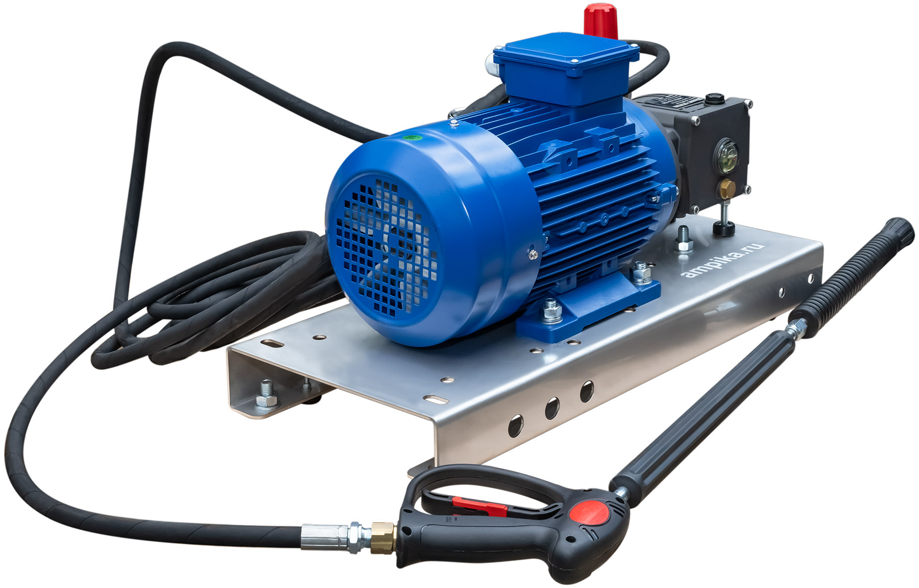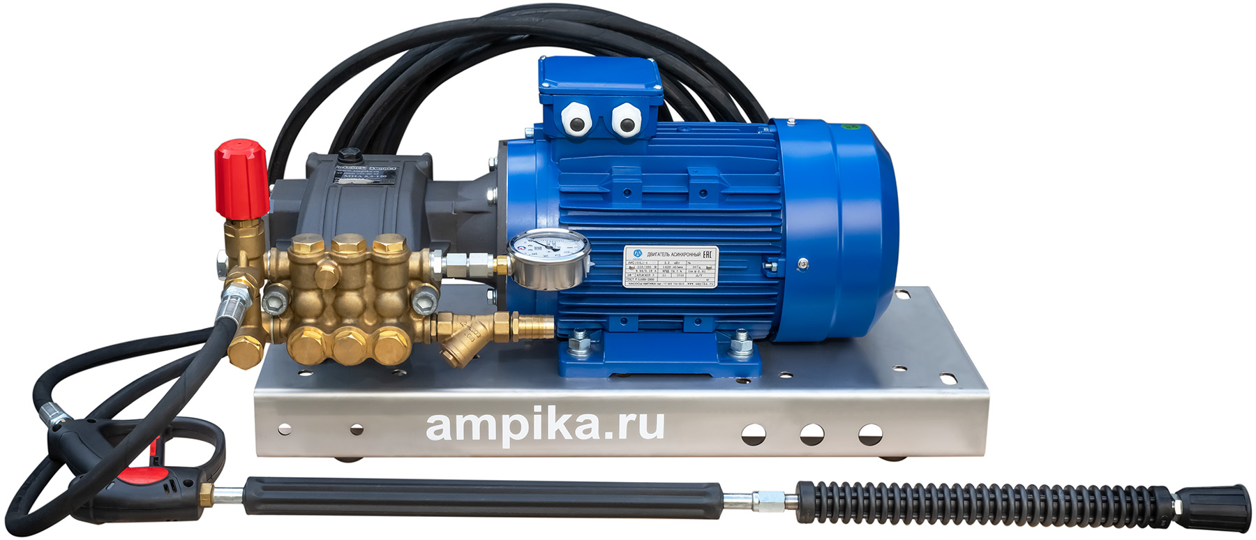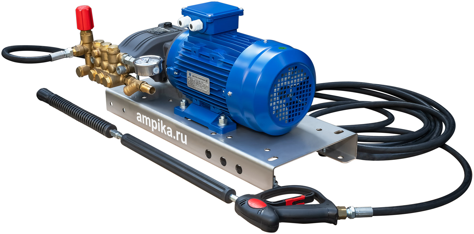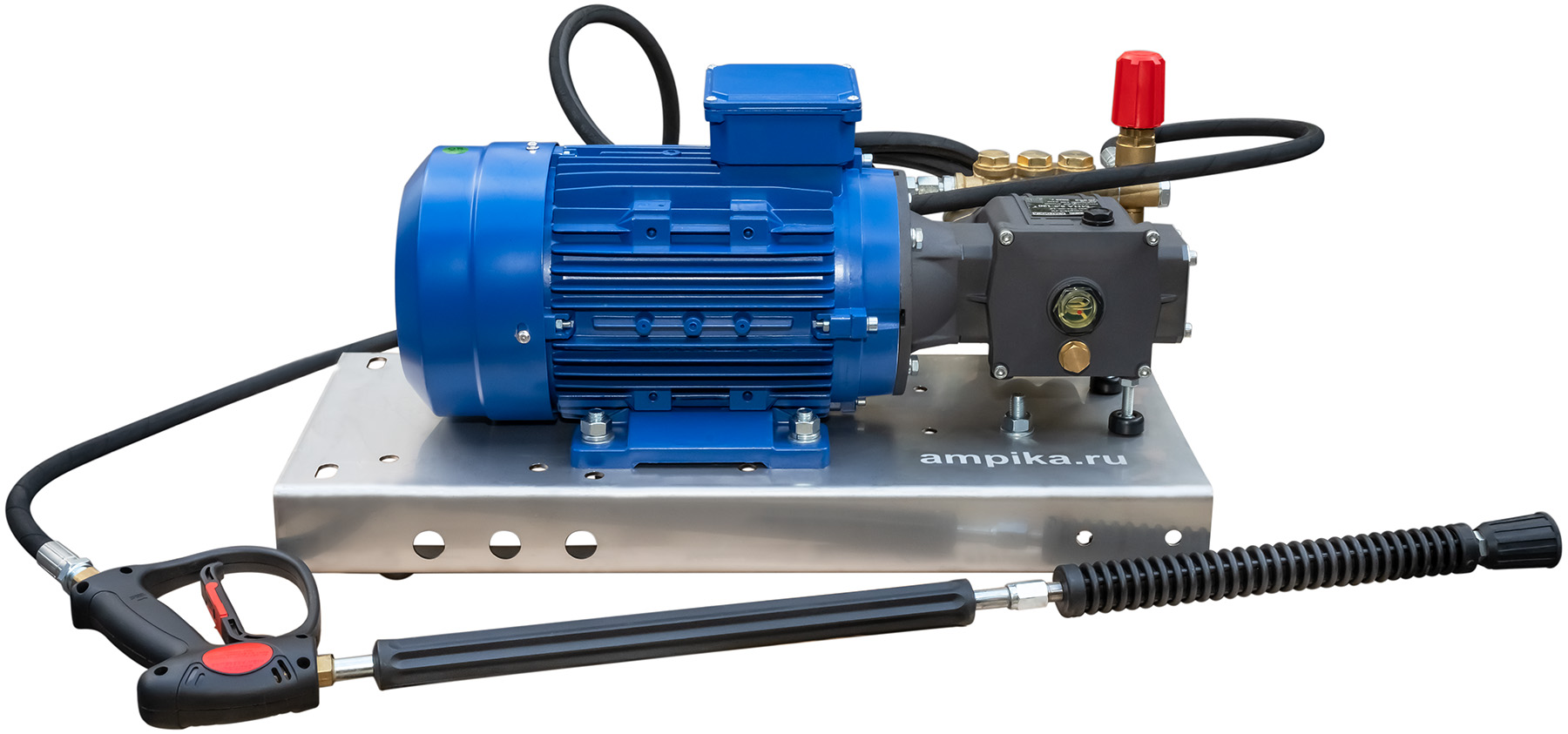 Мойка МНА 8,5-120_380ВКомпактный промышленный моечный агрегат большого давления МНА-8,5-120_380 выдаёт честные 120 атмосфер напора в шланге (в отличие от маркетингового "давления струи" в рекламе обычных моек). Питается от трёхфазной электросети на 380 вольт. Предназначен для организации мойки промышленных изделий и оборудования на производстве, автомойки, мойки колёс грузовиков на выезде со стройки и т.п. Установка состоит из трёхплунжерного насоса высокого давления, электродвигателя, переходного фланца, регулятора давления (возможна регулировка напора в диапазоне от 30 до 120 атм.), манометра на насосе, шланга высокого давления длиной 10 метров с моечным пистолетом-распылителем. Насосы МНА способны стартовать под давлением (преодолевать противодавление), что важно при перерывах: не нужно сбрасывать давление для запуска насоса, можно докачивать. Это разумный выбор для организации локальной автомойки: по нашему опыту параметров этого насоса вполне достаточно для хорошей мойки, и при этом они не избыточны, струя воды не портит детали. Проточная часть выполнена из латуни, поршни - из керамики. Для работы с морской водой (соленой), а также c деминерализованной водой, существует исполнение насосной части из никелированной бронзы. В этом исполнении насос комплектуется перепускным клапаном из нержавеющей стали. Расшифровка условного обозначения марки МНА 8,5-120_380: МНА - серия электрических промышленных моек Ампика, 8,5 - скорость подачи воды, литров в минуту, 120 - давление насоса, атмосфер, 380 - напряжение питания трёхфазного асинхронного электродвигателя, вольт. Мощность электродвигателя: 2,2 кВт. Максимальная температура нагнетаемой воды: +65 ºC. На каждый насос на складе Ампики имеется комплект запасных частей (ЗИП), который может быть поставлен с насосом за отдельную плату. Дополнительную комплектацию можно посмотреть здесь. В таблице характеристик насоса указаны его вес и размеры в упаковочной коробке. Параметры голого насоса: • длина: 620 мм, • ширина: 340 мм, • высота: 320 мм, • вес: 40 кг. Паспорт (инструкция по эксплуатации насоса) вложен в его упаковочную коробку (фанерный ящик). Другие модели этого типа