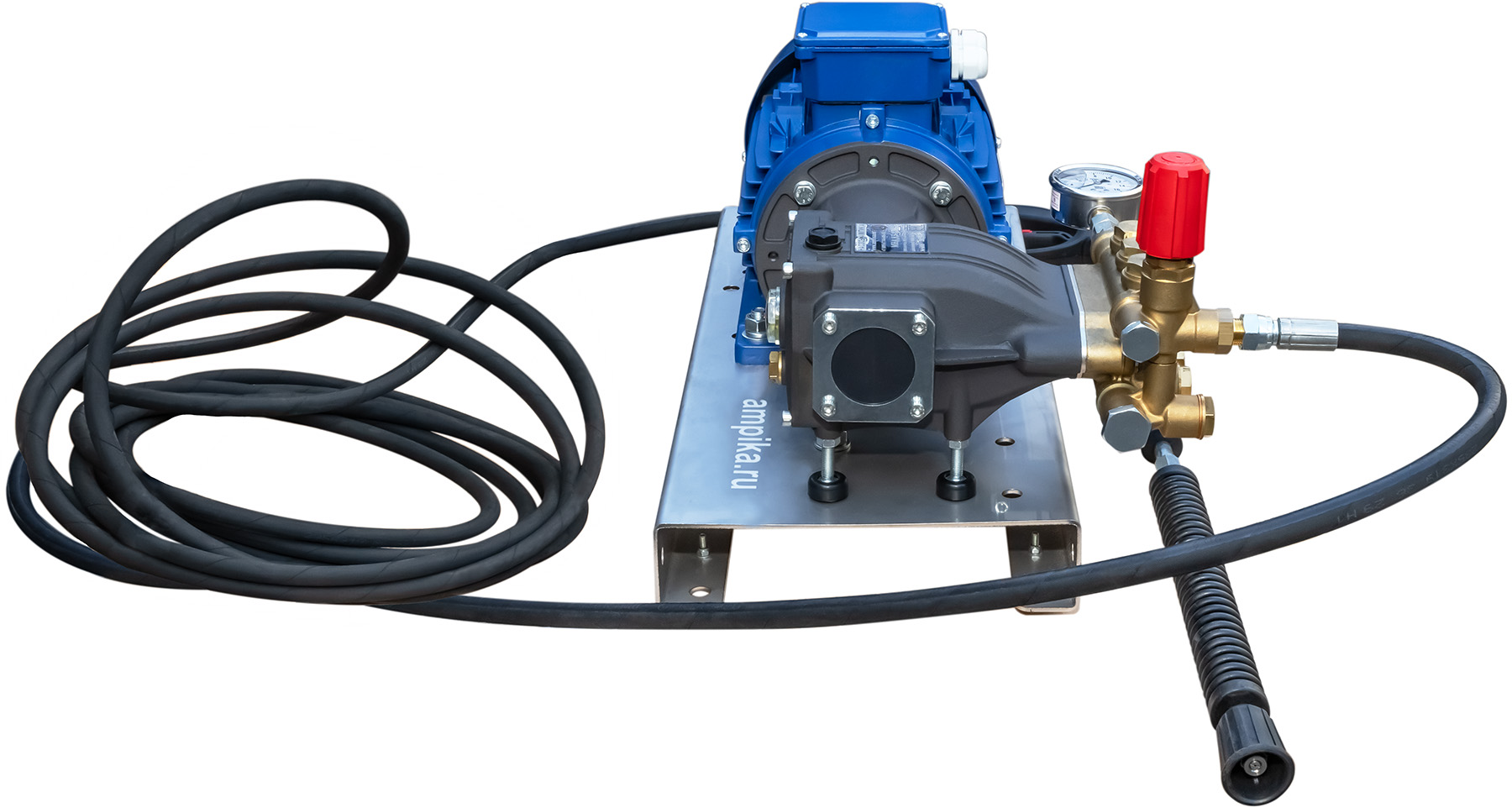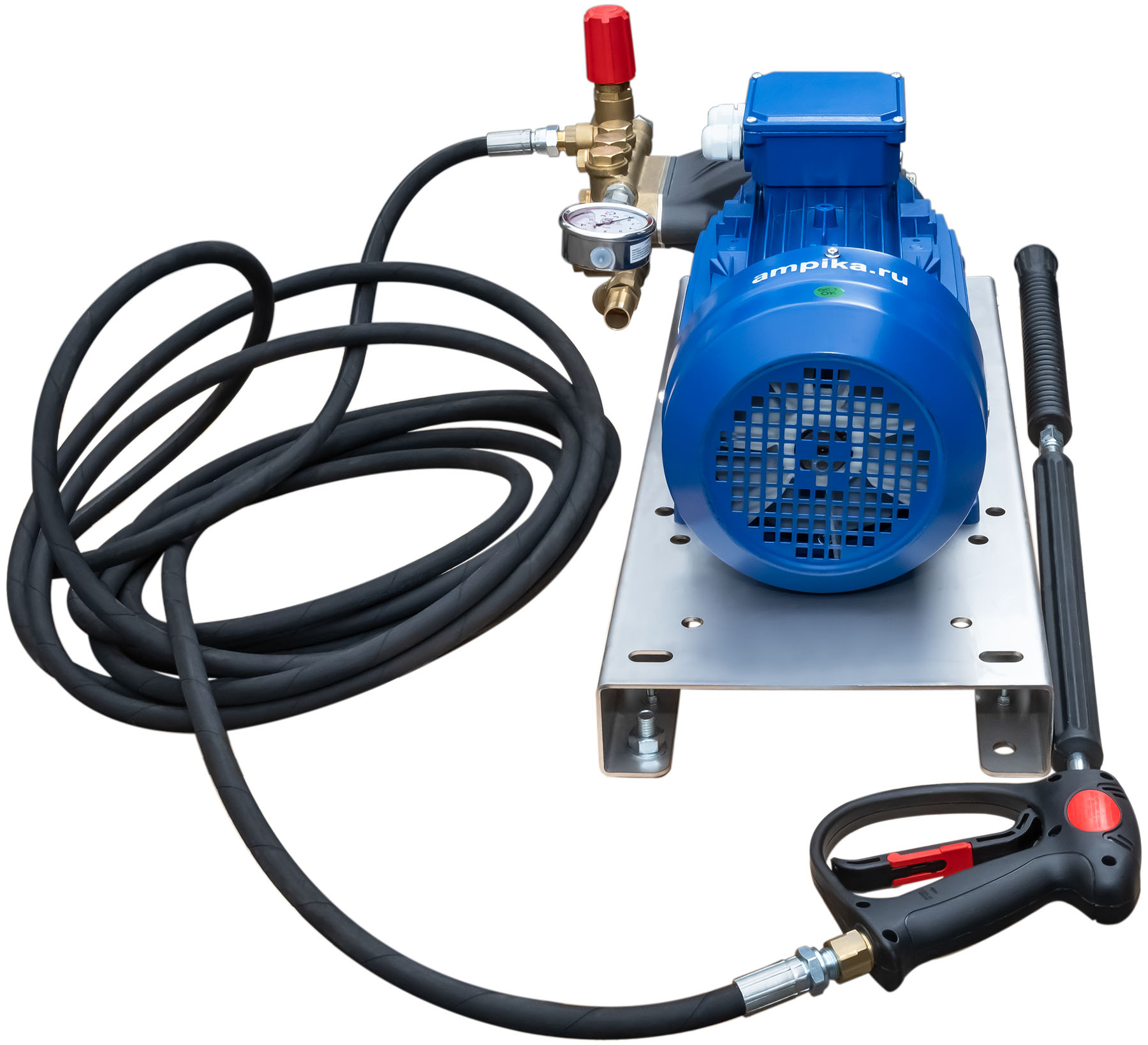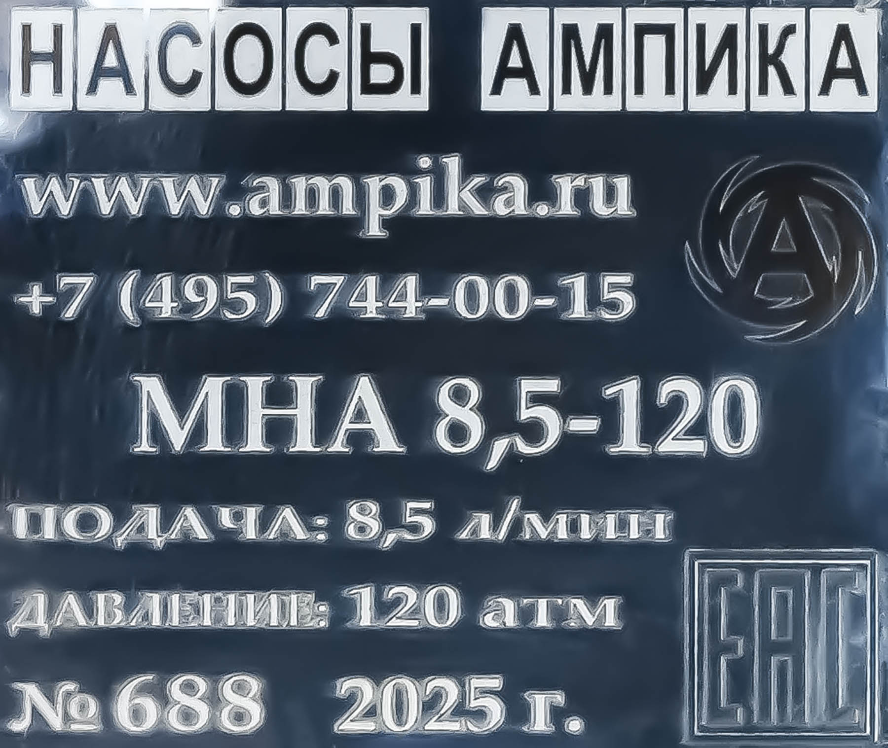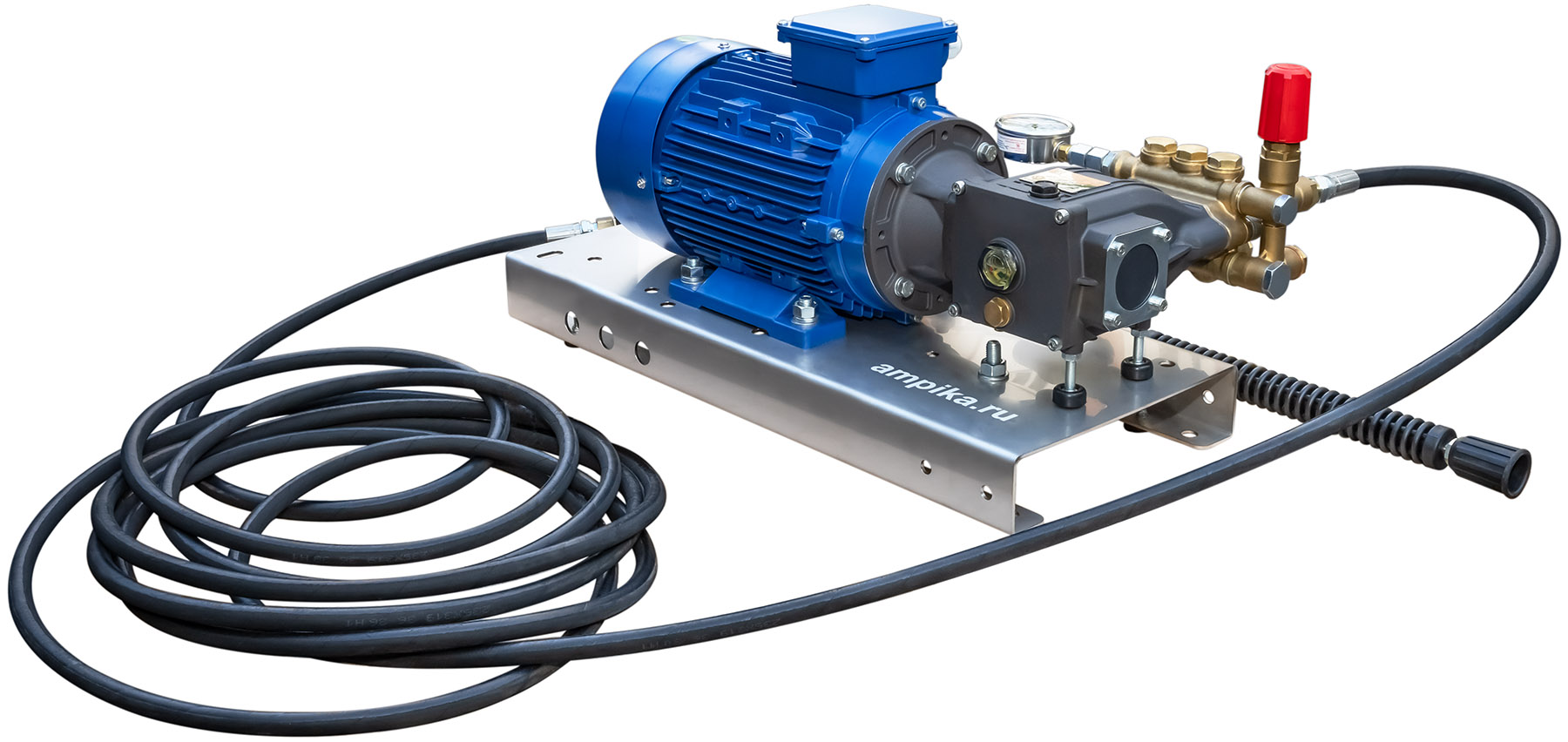 Мойка МНА 8,5-120_380ВКомпактный промышленный моечный агрегат большого давления МНА-8,5-120_380 выдаёт честные 120 атмосфер напора в шланге (в отличие от маркетингового "давления струи" в рекламе обычных моек). Питается от трёхфазной электросети на 380 вольт. Предназначен для организации мойки промышленных изделий и оборудования на производстве, автомойки, мойки колёс грузовиков на выезде со стройки и т.п. Установка состоит из трёхплунжерного насоса высокого давления, электродвигателя, переходного фланца, регулятора давления (возможна регулировка напора в диапазоне от 30 до 120 атм.), манометра на насосе, шланга высокого давления длиной 10 метров с моечным пистолетом-распылителем. Насосы МНА способны стартовать под давлением (преодолевать противодавление), что важно при перерывах: не нужно сбрасывать давление для запуска насоса, можно докачивать. Это разумный выбор для организации локальной автомойки: по нашему опыту параметров этого насоса вполне достаточно для хорошей мойки, и при этом они не избыточны, струя воды не портит детали. Проточная часть выполнена из латуни, поршни - из керамики. Для работы с морской водой (соленой), а также c деминерализованной водой, существует исполнение насосной части из никелированной бронзы. В этом исполнении насос комплектуется перепускным клапаном из нержавеющей стали. Расшифровка условного обозначения марки МНА 8,5-120_380: МНА - серия электрических промышленных моек Ампика, 8,5 - скорость подачи воды, литров в минуту, 120 - давление насоса, атмосфер, 380 - напряжение питания трёхфазного асинхронного электродвигателя, вольт. Мощность электродвигателя: 2,2 кВт. Максимальная температура нагнетаемой воды: +65 ºC. На каждый насос на складе Ампики имеется комплект запасных частей (ЗИП), который может быть поставлен с насосом за отдельную плату. Дополнительную комплектацию можно посмотреть здесь. В таблице характеристик насоса указаны его вес и размеры в упаковочной коробке. Параметры голого насоса: • длина: 620 мм, • ширина: 340 мм, • высота: 320 мм, • вес: 40 кг. Паспорт (инструкция по эксплуатации насоса) вложен в его упаковочную коробку (фанерный ящик). Другие модели этого типа
