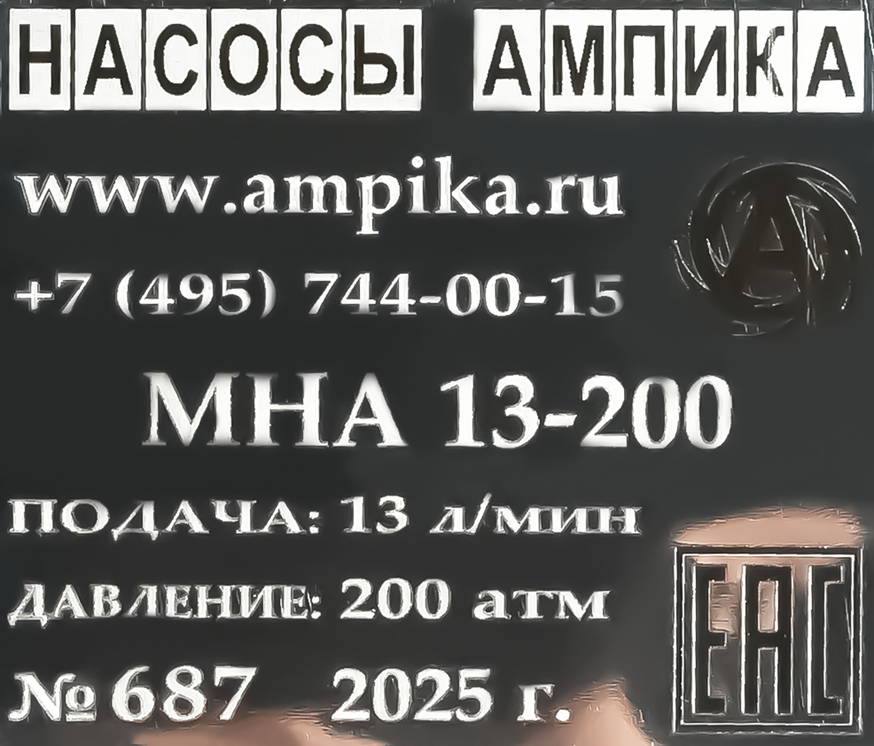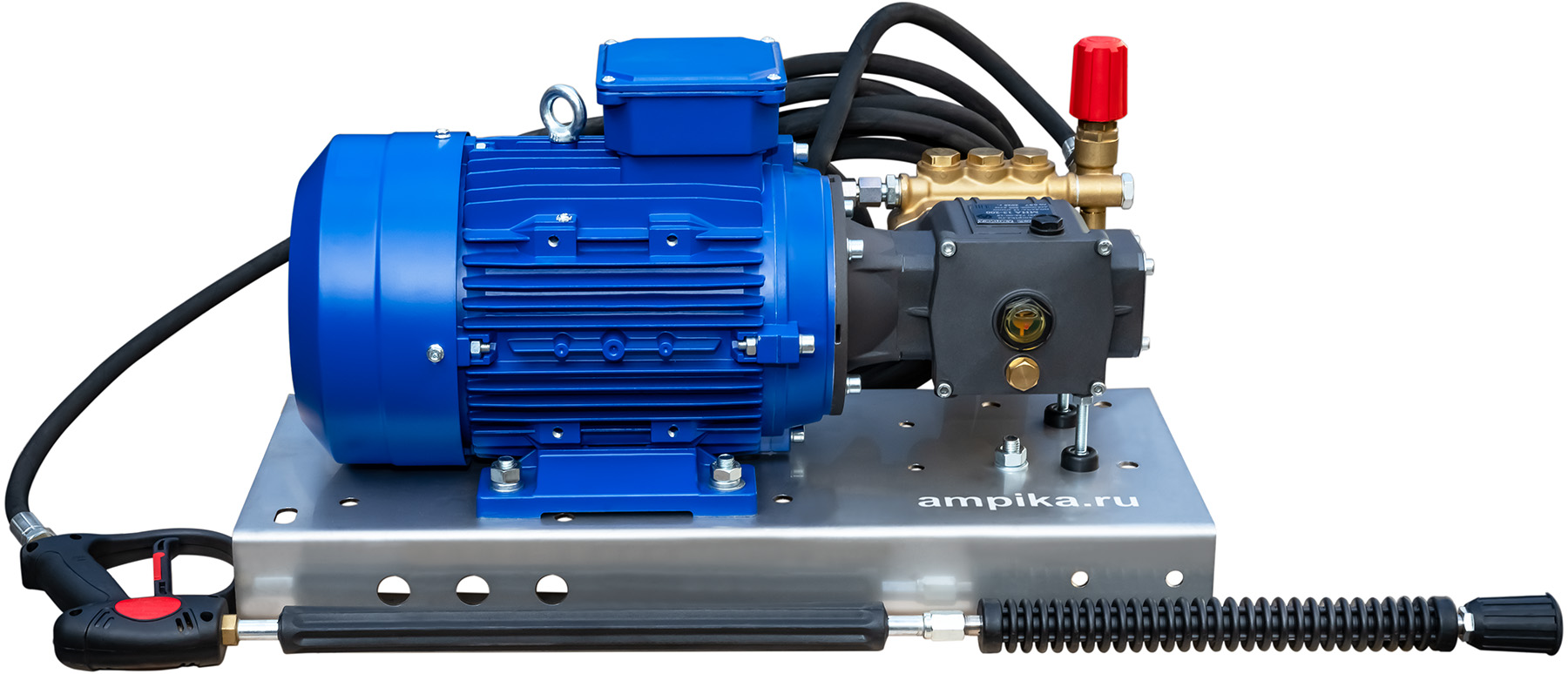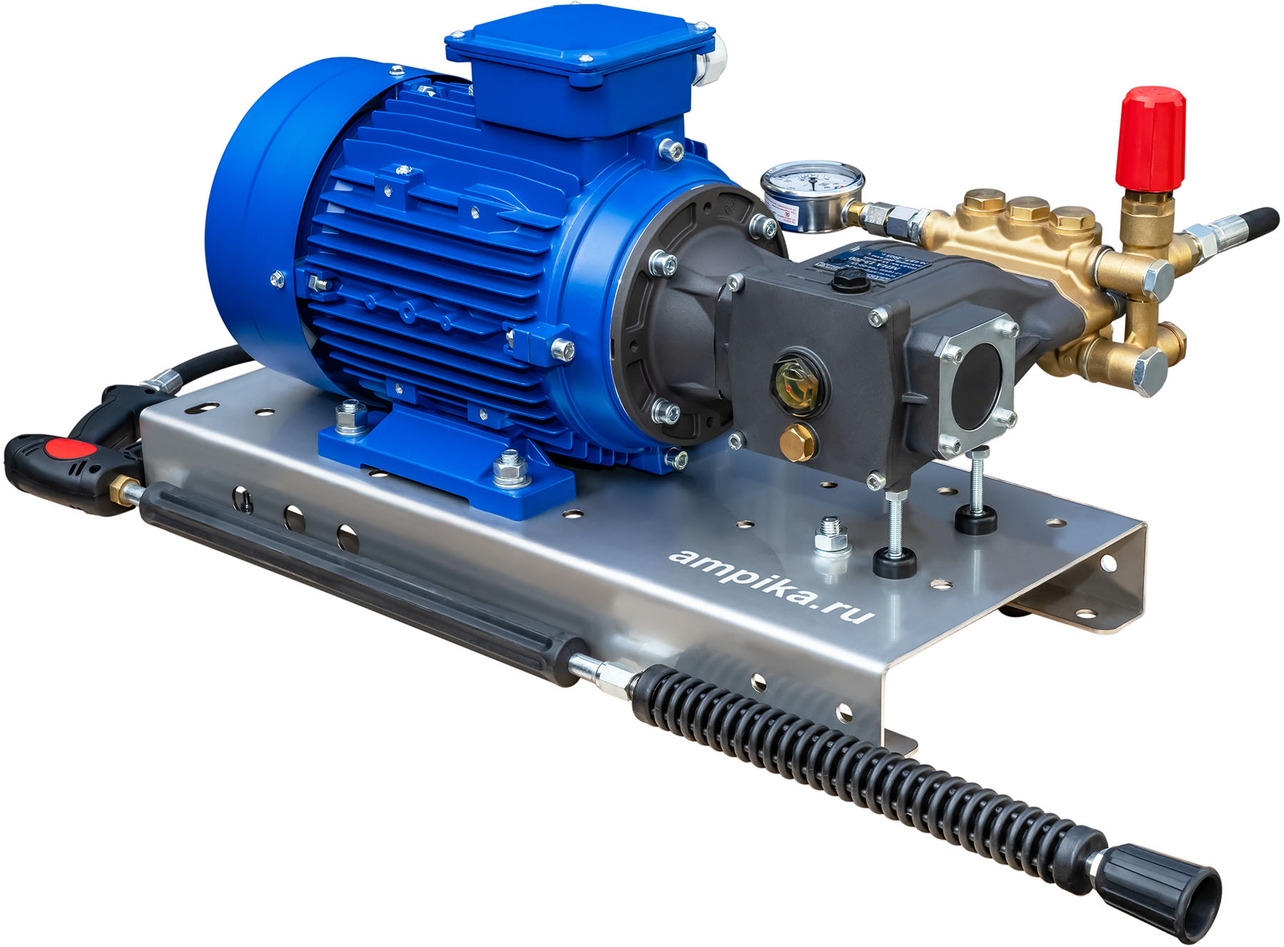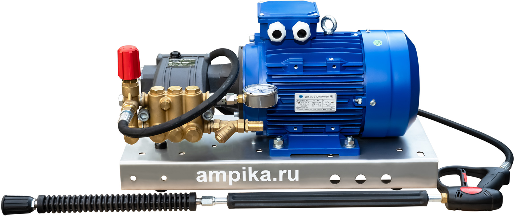 Мойка МНА 13-200Стационарный промышленный моечный агрегат высокого давления МНА-13-200 выдаёт честные 200 атмосфер напора в шланге (в отличие от маркетингового "давления струи" в рекламе обычных моек). Предназначен для организации мойки промышленных изделий и оборудования на производстве, автомойки, мойки колёс грузовиков на выезде со стройки и т.п. Мы на нашем складе для мойки своих машин используем именно эту модель. Установка состоит из трёхплунжерного насоса высокого давления, электродвигателя, переходного фланца, регулятора давления (возможна регулировка напора в диапазоне от 30 до 200 атм.), манометра на насосе, шланга высокого давления длиной 10 метров с моечным пистолетом-распылителем. Насосы МНА способны стартовать под давлением (преодолевать противодавление), что важно при перерывах: не нужно сбрасывать давление для запуска насоса, можно докачивать. Проточная часть выполнена из латуни, поршни - из керамики. Для работы с морской водой (соленой), а также c деминерализованной водой, существует исполнение насосной части из никелированной бронзы. В этом исполнении насос комплектуется перепускным клапаном из нержавеющей стали. Условное обозначение на примере насоса МНА 13-200: МНА - серия электрических промышленных моек Ампика, 13 - подача, литров в минуту, 200 - давление насоса, атмосфер. Максимальная температура воды: +65 ºC. Электропитание: трёхфазное, 380 вольт. Мощность электродвигателя: 5,5 кВт. На каждый насос на складе Ампики имеется комплект запасных частей (ЗИП), который может быть поставлен с насосом за отдельную плату. Дополнительную комплектацию можно посмотреть здесь. В таблице характеристик насоса указаны его вес и размеры в упаковочной коробке. Параметры голого насоса: • длина: 620 мм, • ширина: 340 мм, • высота: 350 мм, • вес: 56,5 кг. Паспорт (инструкция по эксплуатации насоса) вложен в его упаковочную коробку (фанерный ящик). Другие модели этого типа