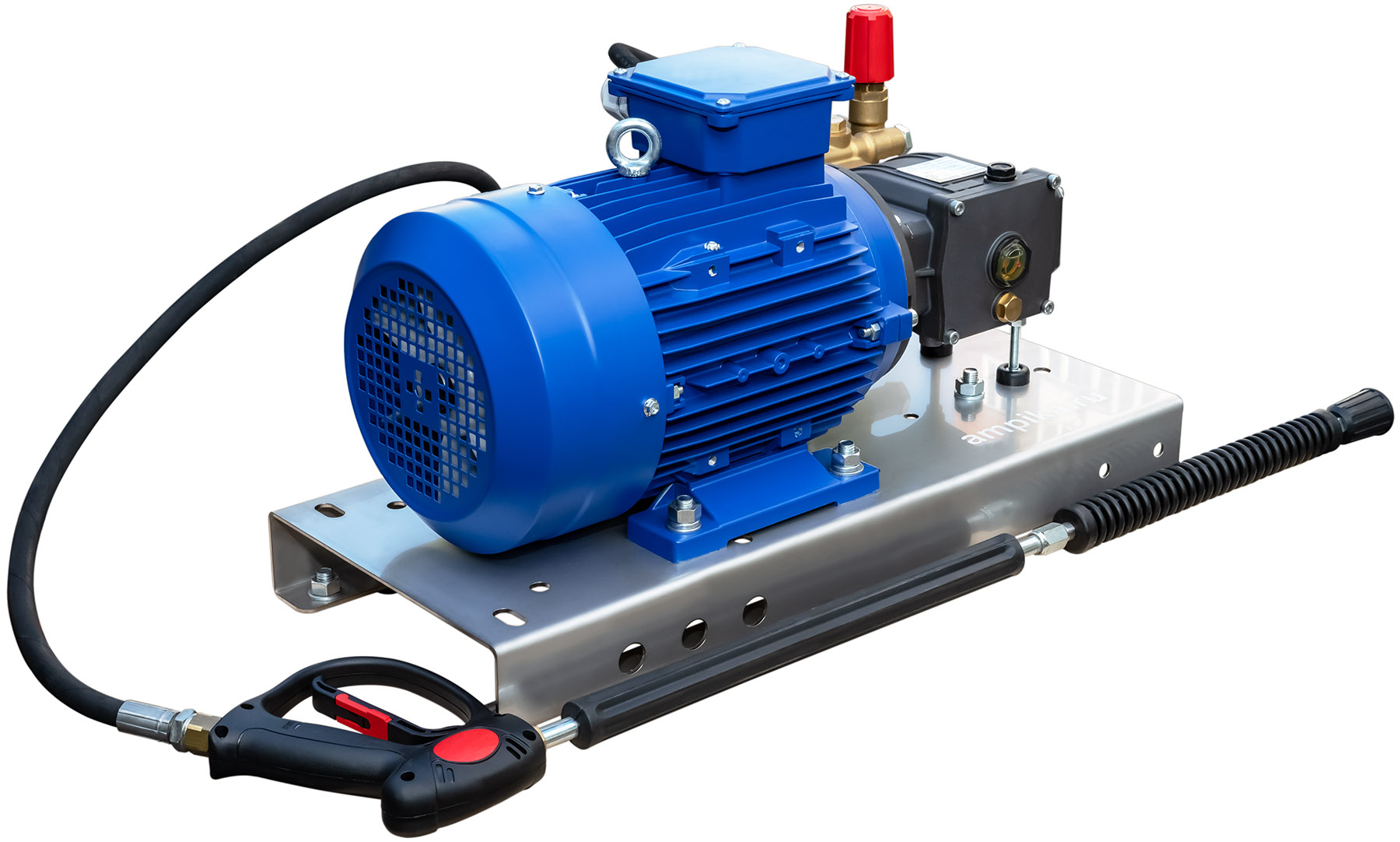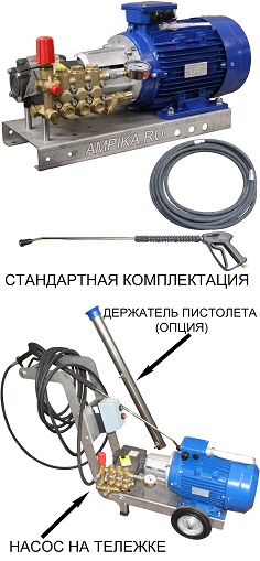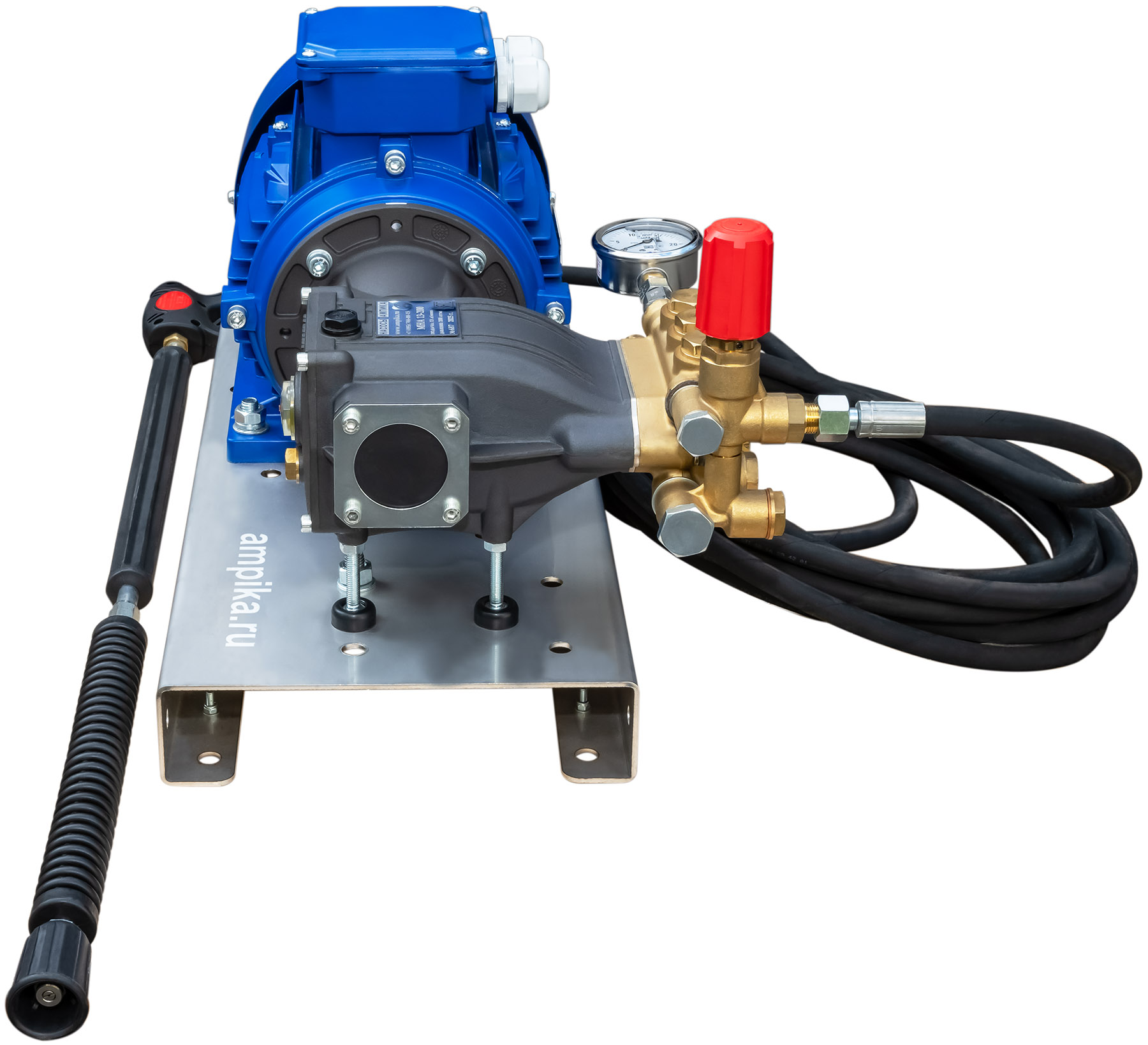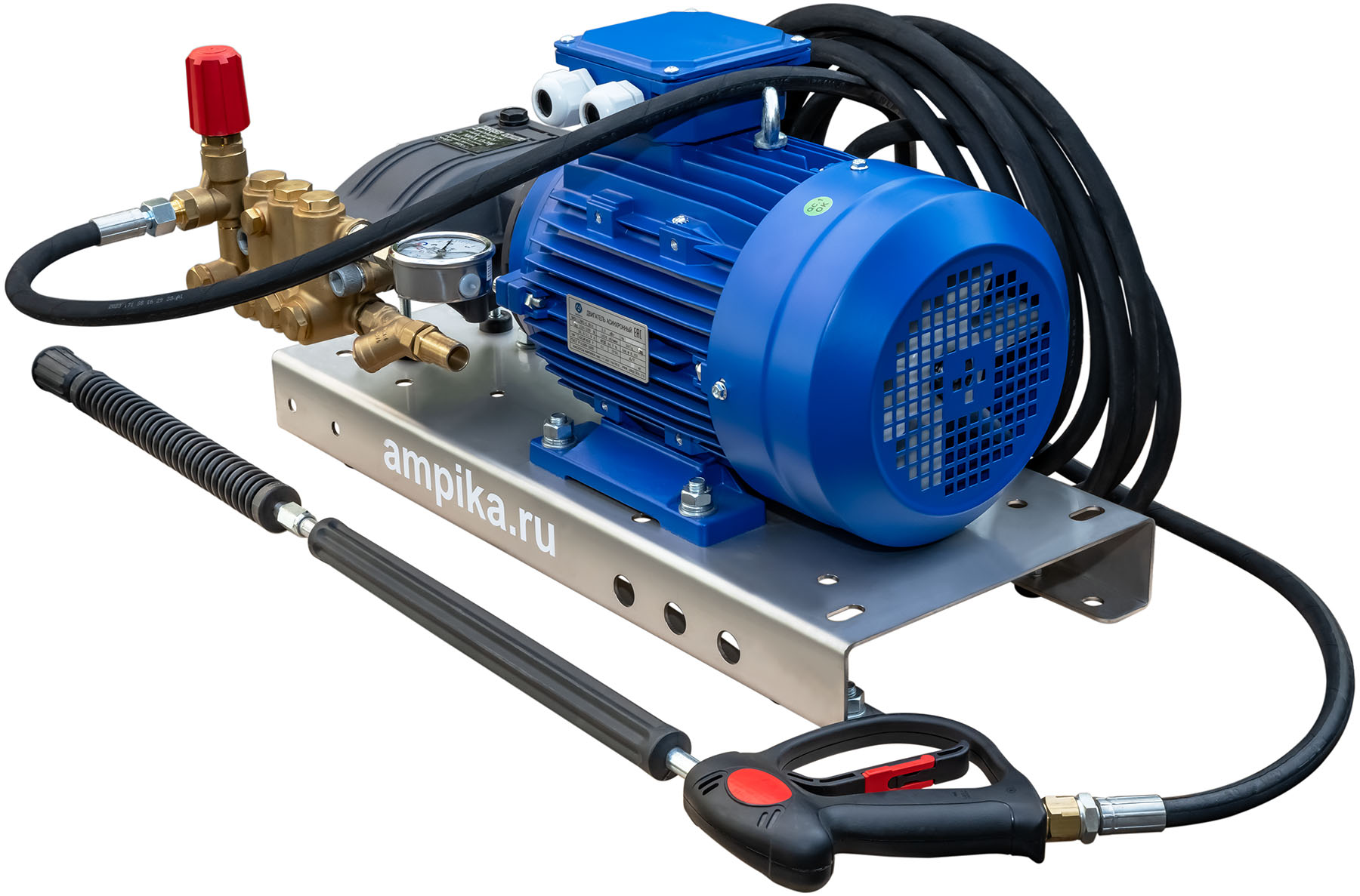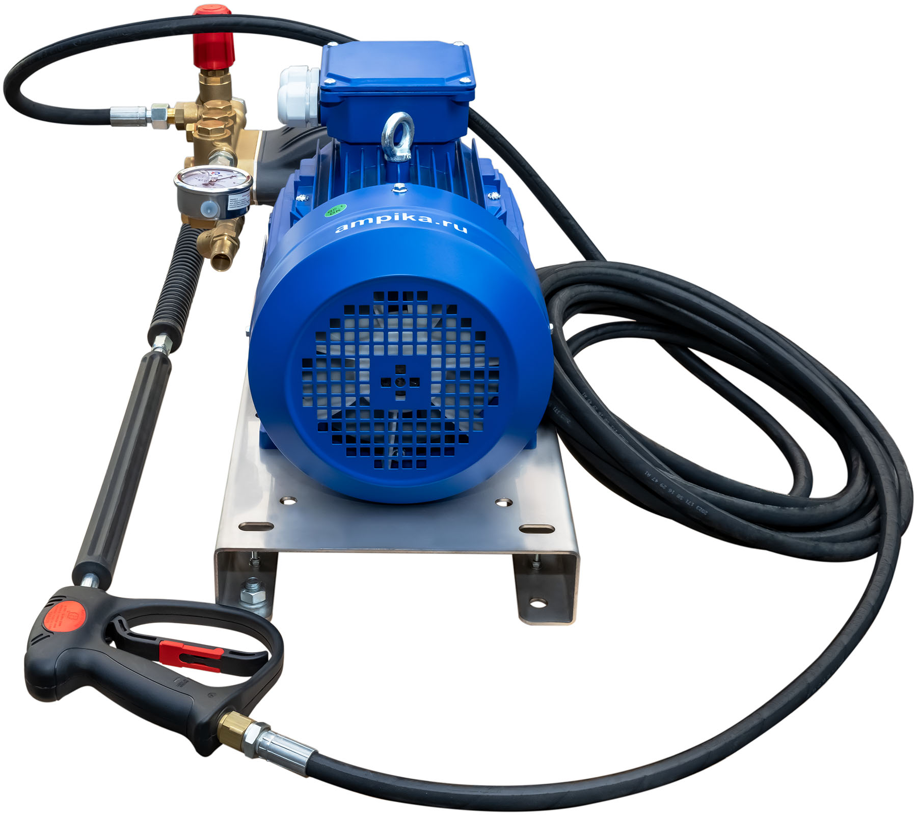 Мойка МНА 13-200Стационарный промышленный моечный агрегат высокого давления МНА-13-200 выдаёт честные 200 атмосфер напора в шланге (в отличие от маркетингового "давления струи" в рекламе обычных моек). Предназначен для организации мойки промышленных изделий и оборудования на производстве, автомойки, мойки колёс грузовиков на выезде со стройки и т.п. Мы на нашем складе для мойки своих машин используем именно эту модель. Установка состоит из трёхплунжерного насоса высокого давления, электродвигателя, переходного фланца, регулятора давления (возможна регулировка напора в диапазоне от 30 до 200 атм.), манометра на насосе, шланга высокого давления длиной 10 метров с моечным пистолетом-распылителем. Насосы МНА способны стартовать под давлением (преодолевать противодавление), что важно при перерывах: не нужно сбрасывать давление для запуска насоса, можно докачивать. Проточная часть выполнена из латуни, поршни - из керамики. Для работы с морской водой (соленой), а также c деминерализованной водой, существует исполнение насосной части из никелированной бронзы. В этом исполнении насос комплектуется перепускным клапаном из нержавеющей стали. Условное обозначение на примере насоса МНА 13-200: МНА - серия электрических промышленных моек Ампика, 13 - подача, литров в минуту, 200 - давление насоса, атмосфер. Максимальная температура воды: +65 ºC. Электропитание: трёхфазное, 380 вольт. Мощность электродвигателя: 5,5 кВт. На каждый насос на складе Ампики имеется комплект запасных частей (ЗИП), который может быть поставлен с насосом за отдельную плату. Дополнительную комплектацию можно посмотреть здесь. В таблице характеристик насоса указаны его вес и размеры в упаковочной коробке. Параметры голого насоса: • длина: 620 мм, • ширина: 340 мм, • высота: 350 мм, • вес: 56,5 кг. Паспорт (инструкция по эксплуатации насоса) вложен в его упаковочную коробку (фанерный ящик). Другие модели этого типа