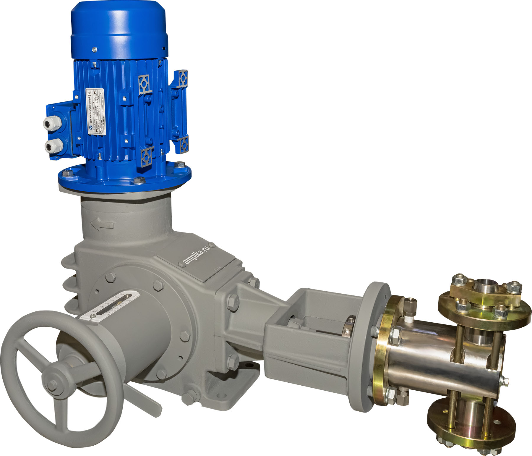 Дозировочные насосы могут использоваться не только для дозирования жидкостей, но и как насосы высокого давления, и как насосы маленькой подачи, и как химические насосы. Диапазон подачи при механической регулировке: от 25% до 100%. При снижении подачи ниже 5% при механической регулировке, будет сильно падать точность дозирования. Если требуется подача на значениях ниже 25% от максимальной подачи, то нужна электронная регулировка (см. ниже). Допустимая концентрация твёрдой неабразивной фазы по массе: - до 0,2 % – для агрегатов с номинальным диаметром присоединительных патрубков DN 5; - до 2 % – для агрегатов с номинальным диаметром присоединительных патрубков DN от 8 до 15; - до 10 % – для агрегатов с номинальным диаметром присоединительных патрубков DN от 25; - плотность твёрдых неабразивных частиц: до 2300 кг/м³; - величина твёрдых неабразивных частиц: не более 1 % от номинального диаметра присоединительных патрубков. Материал деталей проточной части обозначен буквой в маркировке: К - хромоникелевая сталь 12Х18Н9Т, Д - хромистая сталь 20Х13, Е - 10Х17Н13М3Т, И - 06ХН28МДТ, Т - титан. Расшифровка условного обозначения насосов НД на примере агрегата: НД1,0Р-40/25-К13А (Ар): Н - насос, Д - дозировочный, 1,0 - точность дозирования в %, Р - с возможностью регулирования подачи вручную и на ходу, и при остановленном насосе, 40 - подача насоса в л/час, 25 - давление в атмосферах, К - материал проточной части ("К" - нержавеющая сталь 12Х18Н10Т, "Д" - сталь 12Х13), 1 - шевронные манжеты, 2 - сальниковая набивка, 4 - подвод затворной жидкости, А - с электрическим двигателем в общепромышленном исполнении (В - со взрывозащищённым электродвигателем). (Ар) - кодировка производителя насоса (внутренняя маркировка Ампики, на шильдике насоса этих букв нет). Для управления насосами по сигналу 4-20 mA, можно использовать 2 варианта: 1) Частотный преобразователь. С его помощью можно изменять подачу от 40% до 100% с приемлемой точностью 1-3%. При снижении подачи частотником ниже 40% от максимальной, точность дозирования начинает сильно падать и может составлять 10-20% на подачах в диапазоне 5-20%. Следует учитывать, что при снижении оборотов электродвигателя ниже 600 мин⁻¹, встроенный вентилятор насоса не будет эффективно охлаждать мотор. В этом случае потребуется установка дополнительного внешнего вентилятора (можно приобрести у нас). Тем не менее, это достаточно распространённый вид управления подачей, т.к. это самый дешёвый вариант и редко когда требуется снижать подачу ниже 20% от номинала. 2) Блок управления дозированием, который позволяет изменять подачу от 5% до 100%, с точностью дозирования 1-3%. Другие модели этого типа