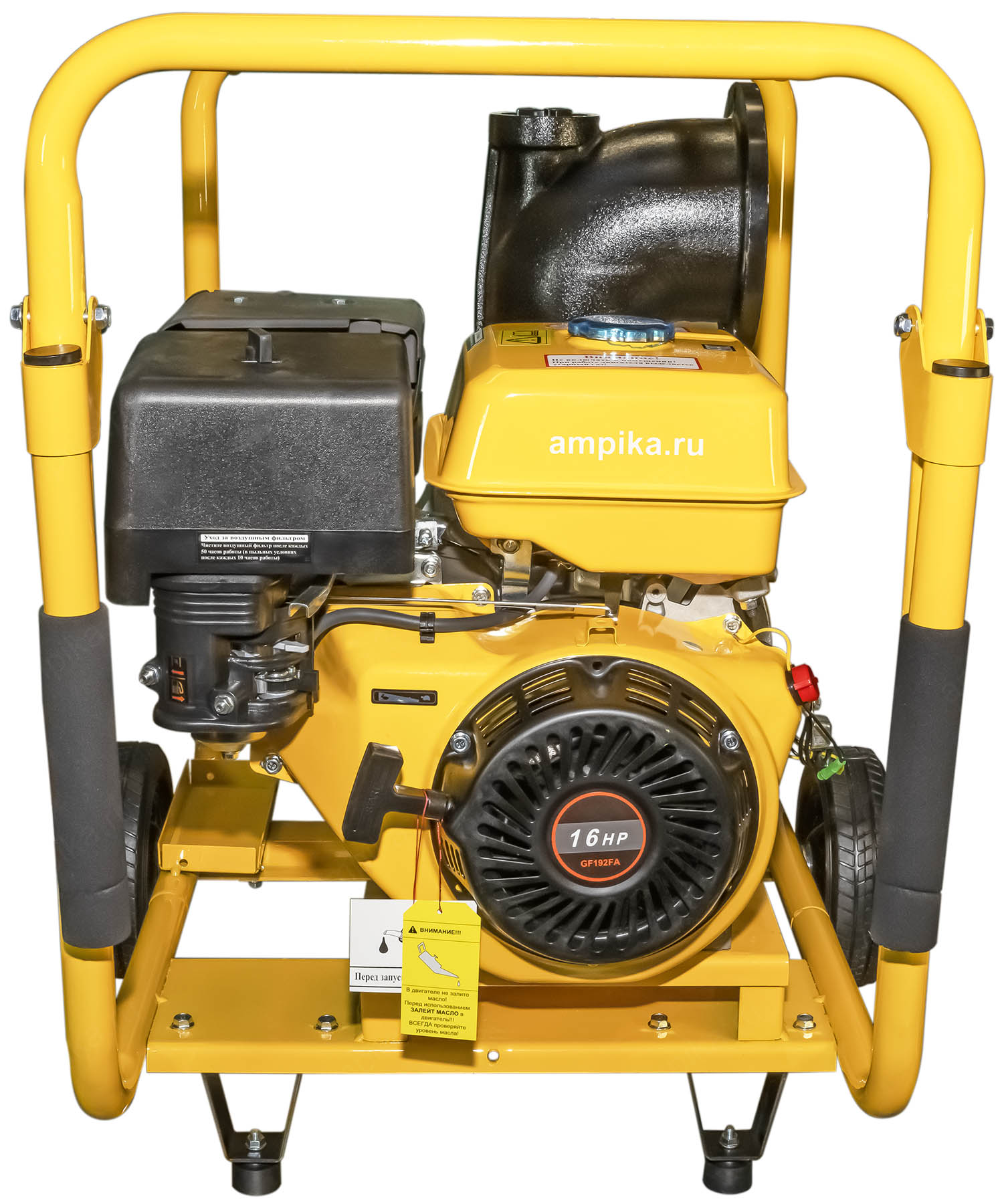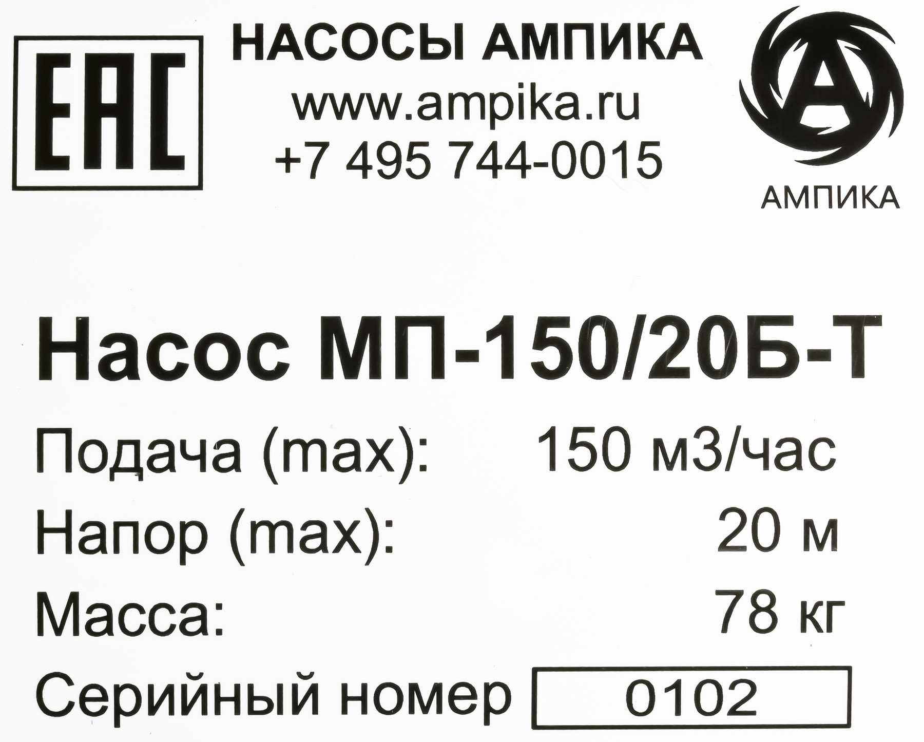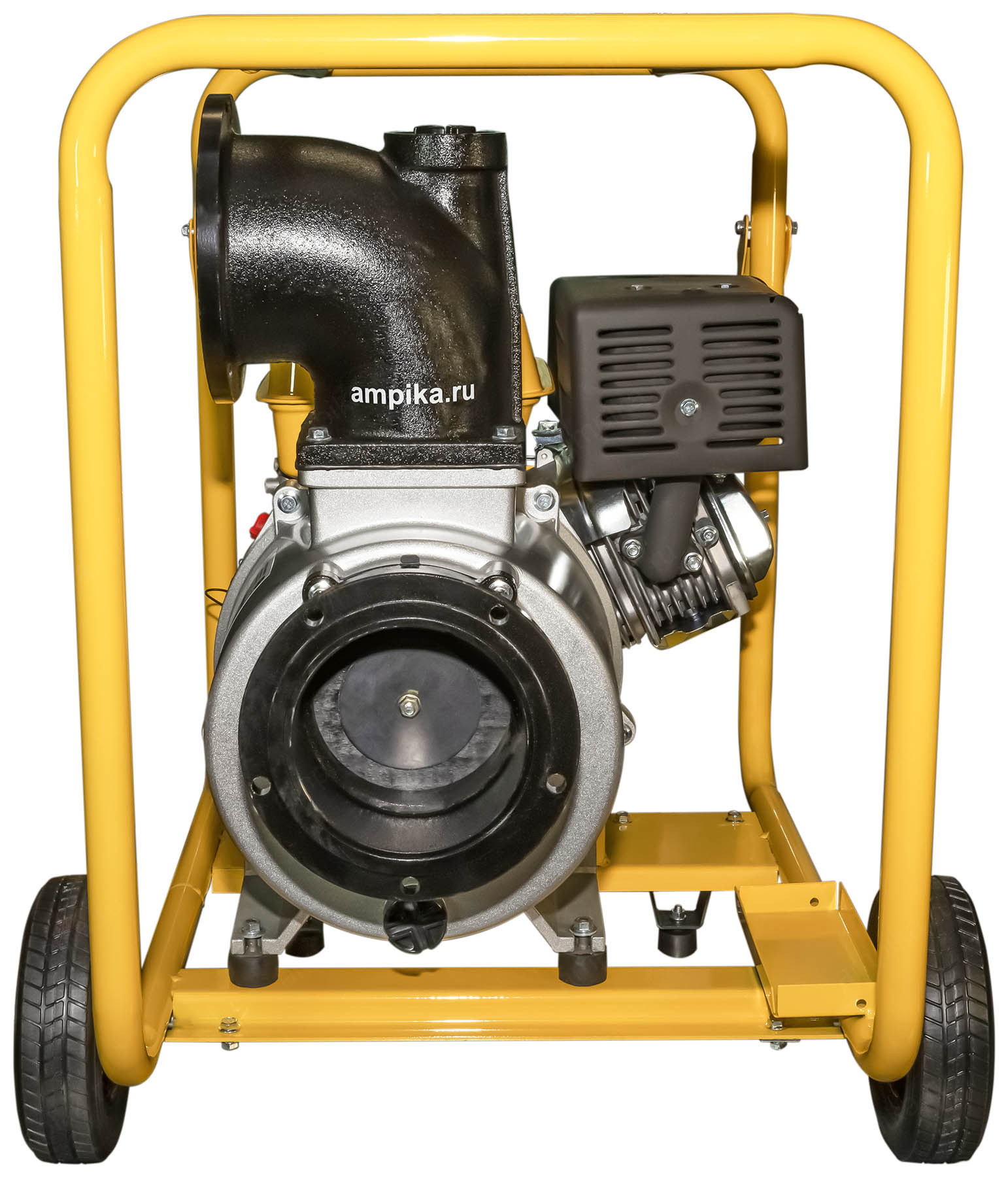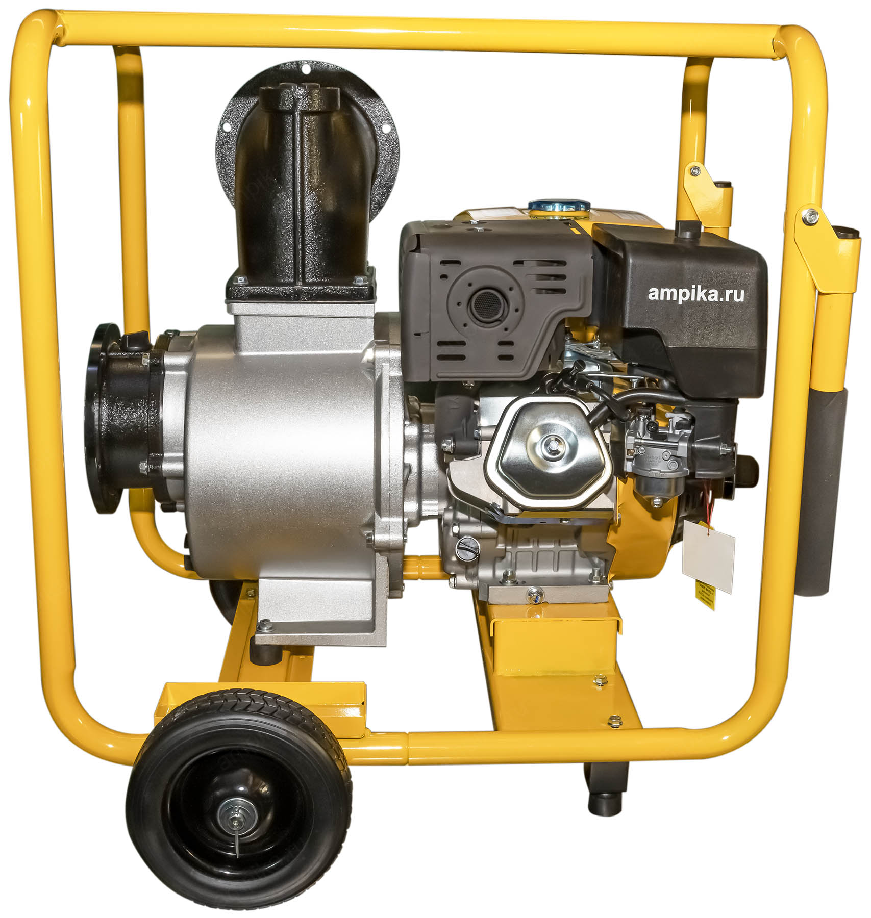 Мотопомпа бензиновая МП-150/20Б-Т (на тележке)Мощная передвижная бензиновая мотопомпа серии МП 150/20Б-Т - самая производительная из серии МП. Она предназначена для перекачивания как чистых, так и очень грязных дренажных вод с концентрацией твёрдых частиц до 10-20% и размером не более 20 мм. В двигатель встроен датчик уровня масла - без масла блок управления не даёт искры, помпа не заводится. Насос является самовсасывающим, т.е. для того, чтобы он начал работать (всасывать жидкость), нет необходимости заполнения перекачиваемой жидкостью всей всасывающей магистрали, достаточно залить жидкость только в корпус насоса перед его запуском (через отверстие сверху напорного патрубка): мотопомпа сама прососёт воздух из заборного шланга и начнёт качать воду. Высота самовсасывания - до 7 метров. Расшифровка маркировки МП-150/20Б-Т: - МП - мотопомпа; - 150 - максимальная подача в м³/час; - 20 - максимальный напор в метрах; - Б - бензиновая; - Т - для тяжёлых режимов работы. Комплект поставки: - насос в сборе с бензиновым четырёхтактным двигателем внутри передвижной рамы; - штуцеры под шланг, всасывающий фильтр и хомуты; - свечной ключ; - инструкция по эксплуатации. Техническое описание: - тип двигателя - бензиновый четырёхтактный одноцилиндровый верхнеклапанный; - питание топливом - карбюратор; - стартёр - электрический (есть и ручной - запасной); - тип насоса - центробежный самовсасывающий; - уплотнение вала - торцевое: керамика-NBR; - материал корпуса проточной части - алюминий; - рабочее колесо - из чугуна. В таблице характеристик мотопомпы указаны её вес и размеры в упаковочной коробке. Параметры голого насоса: • длина: 730 мм, • ширина: 550 мм, • высота: 720 мм, • вес: 96 кг. Рекомендуем также приобрести шланги: армированный на всасывание и пожарный на напор. Другие модели этого типа