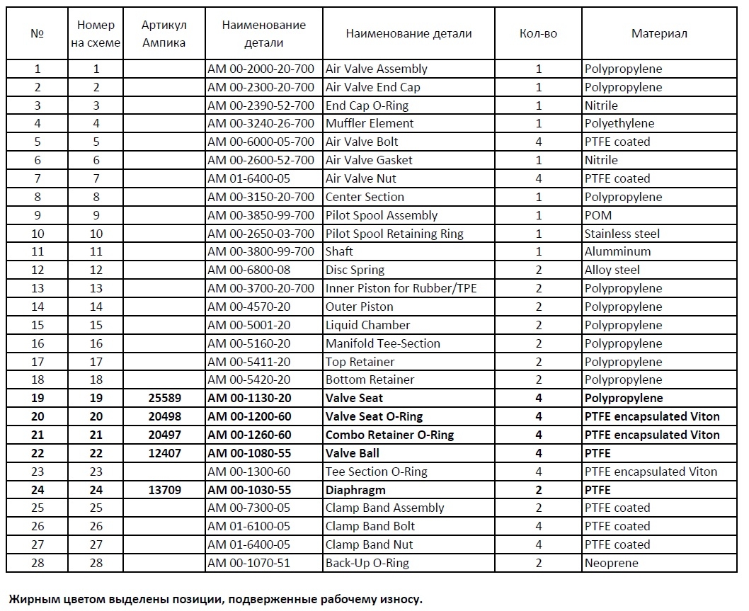 Мембранный насос Ампика МН-0,25-PP/PTFEМаленький мембранный пневматический насос из пластика МН 0,25-PP/PTFE предназначен для перекачивания жидких агрессивных химических веществ. Насос с корпусом из полипропилена и мембранами и клапанами из тефлона отлично подходит например для перекачивания серной и плавиковой кислот средней концентрации, сильных концентраций соляной, молочной и лимонной кислоты, концентрированных щелочей. При выборе насоса необходимо учитывать не только концентрацию перекачиваемых жидкостей, но и их температуру, плотность и вязкость. Допустимый рабочий диапазон температур: +4 ~ +70 ºC. Насос является самовсасывающим. Возможность всасывания "на сухую" зависит от глубины всасывания и физических свойств жидкости (плотность, вязкость). Вязкость имеет важную роль при выборе насоса. Чем меньше патрубки насоса, тем сложнее ему перекачивать вязкие среды. Всасывающая способность насоса также зависит от плотности жидкости. Если например возможно всасывание воды с глубины до 5 метров, а плотность концентрированной соляной кислоты 1200 кг/м³, то при её перекачке всасывание упадёт до 4,16 метра. Вязкость влияет не только на способность всасывать жидкость, но и на то, какие потери будут на трубопроводе после насоса. Чем больше насос, его патрубки и рабочий объём, тем большей вязкости жидкость он способен перекачивать. В отдельных случаях мембранные насосы способны перекачивать жидкости вязкостью до 20000 мПа*с. Производительность насоса регулируется давлением приводящего его в действие воздуха: чем выше давление (максимально допустимое - 7 атм.), тем чаще мембраны совершают возвратно-поступательные движения. Максимальная подача: 1 м³/ч. Максимальный напор: 70 метров водяного столба. Максимальный размер частиц в перекачиваемой жидкости: 0,4 мм. Расход воздуха: 1,5~8,3 м³/ч. Маркировка модели МН-0,25-PP/PTFE: МН - Мембранный Насос. 0,25 - Размер насоса (вход/выход) в дюймах – 1/4’’, стандартная трубная внутренняя резьба "одна четвёртая". PP - Материал корпуса – полипропилен - недорогой термопластик, который устойчив к воздействию щелочей и сильных кислот. Рабочий диапазон температур: 0°C ~ 70°C. PTFE - Материал мембран/шаров – тефлон (политетрафторэтилен) - химически инертный, устойчивый к широкому спектру химических веществ. Диапазон температур: 4°C - 107°C. Запасные части приведены во вкладке "Запчасти" под фотографиями насоса. Так как размер насоса экстремально мал, на корпусе нет традиционного шильдика. Паспорт (инструкция по эксплуатации насоса) вложен в его транспортировочную коробку.
