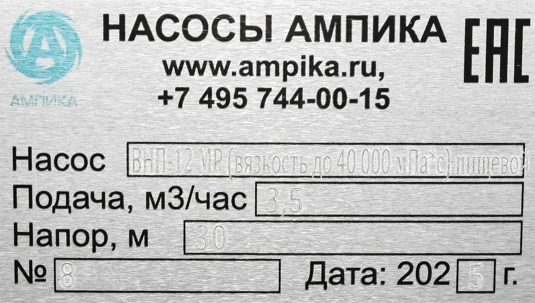 Винтовой полупогружной насос для бочек Ампика ВНП-12 МР (вязкость до 40 000 мПа*с) пищевойМощный промышленный бочковой насос ВНП-12 МР в пищевом исполнении предназначен для выкачивания густых продуктов с вязкостью до 40000 мПа*с из 200 л бочек со съёмной крышкой или большой горловиной и еврокубов (максимальная глубина погружения - 1200 мм). Выходной патрубок с ёлочкой под шланг внутренним диаметром 50 мм, крепится к корпусу насоса через молочную муфту, что позволяет быстро отсоединять шланг при необходимости. Насос может использоваться для перекачки таких жидкостей как например: пищевые масла, концентраты соков, майонез, сметана, мёд, патока, фруктовые пюре, томатная паста, для некоторых щелочных жидкостей (например, лауретсульфат натрия (SLES), гидроксид натрия) и других вязких жидкостей, химически не агрессивных к материалам насоса. По окончании работы винтовой насос можно промывать дезрастворами с концентрацией 1-2%. В стандартном исполнении эта модель комплектуется статором из белой пищевой резины NBR (25-25-563) и уплотнением вала из EPDM. ВНИМАНИЕ! Этот насос НЕ ПРЕДНАЗНАЧЕН для полиэфирных смол, отвердителей, кислот, растворителей!!! Уточняйте возможность работы каждого конкретного насоса с каждой конкретной жидкостью у поставщика!!! В качестве привода устанавливается мотор-редуктор типа TRC с оборотами вала 490 мин⁻¹. Это позволяет перекачивать высоковязкие жидкости, например патоку. Для работы с такими жидкостями требуются пониженные обороты винта, т.к. иначе продукт не будет успевать затекать в насосную часть из-за большой вязкости и героторная пара будет работать "с голоданием", что приведёт к преждевременному износу обоймы. Рекомендуем также работать в паре с частотным преобразователем, т.к. он позволяет подстраивать обороты ротора в зависимости от вязкости жидкости, которая может меняться. Данный насос хорошо зарекомендовал себя при перекачке томатной пасты. Из нашей линейки полупогружных насосов для выкачивания томатной пасты или патоки из бочек мы рекомендуем использовать бочковые электрические насосы с мотор-редуктором: ВНП-12-МР, либо ВНП-25-МР. Следует помнить, что чем больше будет вязкость, тем ниже будет производительность насоса (подача насоса в таблице параметров указана на воде). На больших вязкостях подача может упасть в 5-10 раз (например, этот насос на патоке при +20ºC выдаёт подачу не более 300 л/час). Технические характеристики: 1) Глубина погружения максимально - 1,2 м (под заказ возможно изготовление с глубиной погружения до 2 м). 2) Размер пропускаемых частиц - до 5 мм, не более 10% по объёму. 3) Материал корпуса проточной части (трубы) и внутренних деталей (винт, торсион, наконечник вала э/д, фланец под торцевое уплотнение): нержавеющая сталь марки AISI304. 4) Уплотнение вала торцевое, с парой из карбида кремния и эластомером из EPDM. Возможна установка уплотнения из витона. 5) Материал обоймы: пищевая резина 25-52-563 (NBR). Возможна установка обойм из: - полиуретана, - витона (фторкаучука), - износостойкой чёрной МБС резины 7-В-14. 6) Наружный диаметр погружной части: 76 мм. 7) Выход насоса – молочная муфта Ду50 DIN 11851 со штуцером под шланг Ду 50 мм. 8) Электродвигатель - общепромышленный, на 380 вольт, IP55, с возможностью постоянной работы. Возможна комплектация электродвигателем во взрывозащищённом исполнении. Видео перекачки патоки снято специалистами нашего 