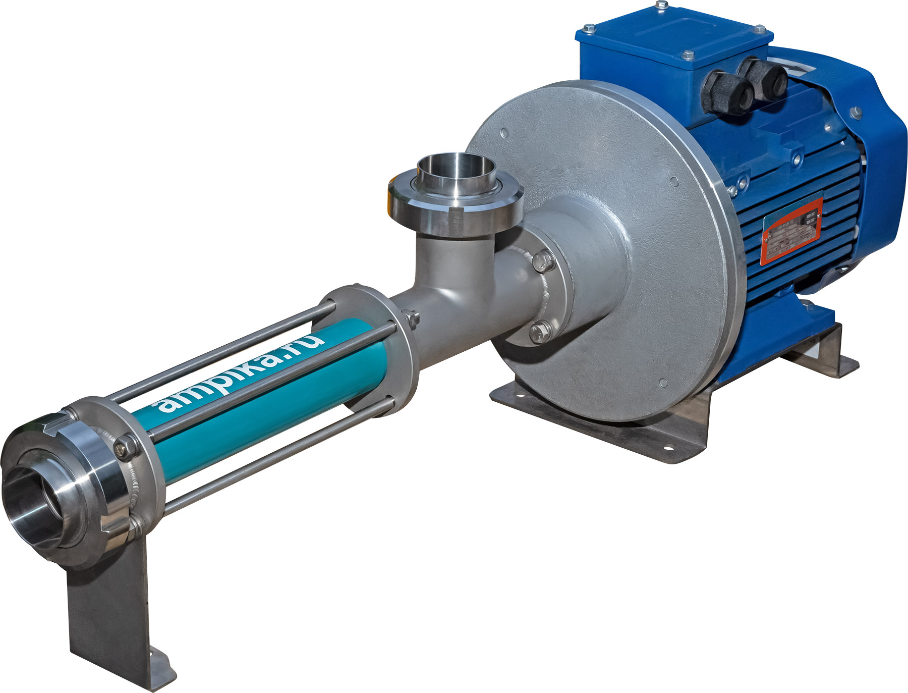 Винтовой насос Ампика ОВН-12-6,0/6 с 3,0 кВтВинтовые насосы серии ОВН предназначены для перекачивания вязких жидкостей в пищевой и химической промышленности. Температура перекачиваемой жидкости - до +80ºC в стандартном исполнении. Возможно изготовление насосов с рабочей температурой до +140ºC под заказ. Уплотнение вала - торцевое. Материал проточной части - нержавеющая сталь марки AISI 304. Насосы представляют собой моноблочную конструкцию, что позволило снизить цену по сравнению с традиционным решением, когда используется выносная промежуточная подшипниковая стойка. Допустимый размер частиц в перекачиваемой жидкости: - для ОВН-2 (до 12 атм.), ОВН-4 (до 6 атм.), ОВН-6 (до 6 атм.): твёрдые до 6 мм, мягкие до 9 мм, - для ОВН-8: твёрдые до 8 мм, мягкие до 12 мм, - для ОВН-6 (до 12 атм.), ОВН-12 (до 6 атм.), ОВН-18 (до 6 атм.): твёрдые до 9 мм, мягкие до 13 мм, - для ОВН-18 (до 12 атм.), ОВН-36 (до 6 атм.), ОВН-54 (до 6 атм.): твёрдые до 14 мм, мягкие до 21 мм. Расшифровка обозначения на примере насоса ОВН-4-2,5/5: - "О" - насос для молочной промышленности по советской классификации, - "ВН" - винтовой насос, - "4" - номинальная производительность статора (обоймы) на 100 оборотов винта в литрах, - "2,5" - производительность насоса в м³/час, - "5" - давление насоса в атмосферах. Возможные варианты исполнения: - с байпасом (дает возможность работы на закрытый выход, например, для дозирования), - с дополнительным штуцером для CIP мойки, - во взрывозащищённом исполнении, - со шнековым питателем, - с мотор-редуктором. ВНИМАНИЕ! Если требуется работа с частотным преобразователем, об этом нужно сообщать при заказе, т.к. со стандартным электродвигателем насос может не запускаться от частотника. В этом случае может потребоваться установка более мощного электродвигателя, а также дополнительного внешнего вентилятора, т.к. при снижении оборотов встроенная в э/д крыльчатка может перестать эффективно охлаждать электродвигатель, и это может привести к его перегреву. Частотный регулятор следует выбирать на одну ступень больше, чем мощность электродвигателя, и обязательно использовать частотный преобразователь с векторным управлением. Другие модели этого типа