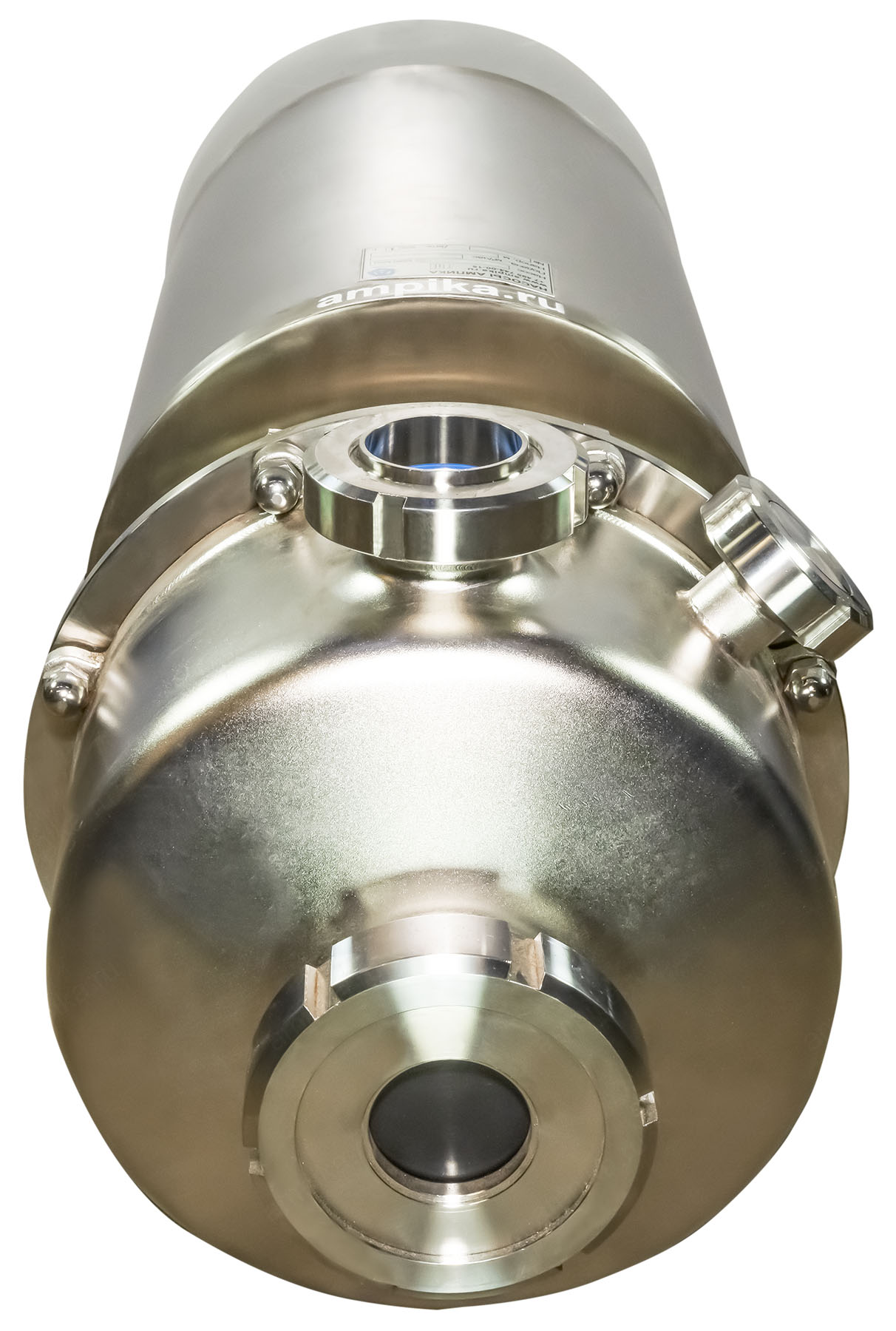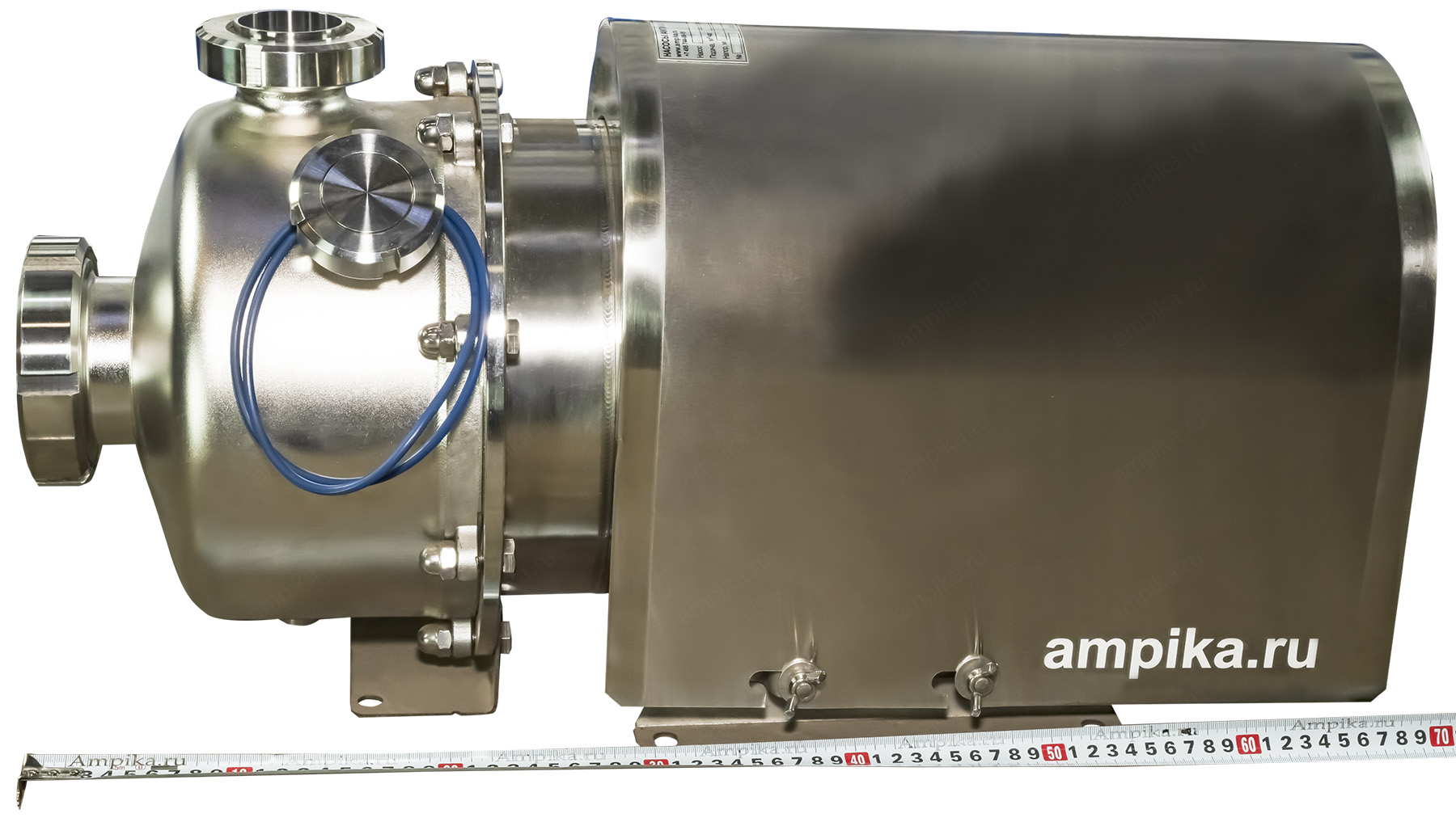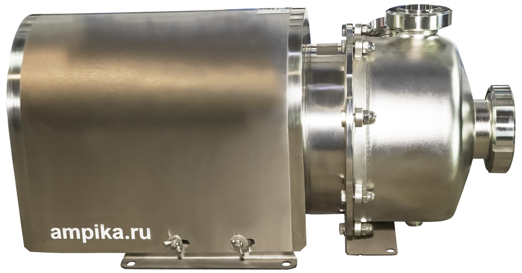 Цена с НДС 206200 ₽ Центробежный самовсасывающий пищевой насос ОНЦс-12,5/50К-5,5/2 (с кожухом) – это моноблочный, горизонтальный, одноступенчатый насосный агрегат. Отличительной особенностью пищевых насосов ОНЦс является возможность всасывать жидкость без предварительного заполнения входной магистрали: для осуществления самовсасывания (выкачивания воздуха из всасывающего трубопровода) достаточно наличия жидкости только в корпусе проточной части насоса. Для заполнения корпуса насоса без отсоединения трубопроводов, в верхней части рабочей камеры предусмотрено заливное отверстие, закрытое пробкой. Высота самовсасывания - до 7 метров. ВНИМАНИЕ! Высота самовсасывания зависит от температуры жидкости и её плотности! При подборе насосов всегда консультируйтесь со специалистами Ампики. Насос предназначен для перекачивания подсолнечного масла, вина, пива, соков, а также других пищевых продуктов, сходных с ними по вязкости и плотности. Температура перекачиваемой среды от +4 до +95 ºC (возможно изготовление версии до +140 ºC). Допускается использовать этот электронасос для перекачивания слабокислых и слабощелочных сред (CIP-растворов), обеспечивающих скорость коррозии проточной части не более 0,1 мм/год. Концентрация механических примесей - не более 0,1% по объёму, максимальный размер частиц - 0,2 мм. Электродвигатель трёхфазный общепромышленный, на 380 вольт, мощностью 5,5 кВт. Уплотнение вала - одинарное торцевое (возможно изготовления с двойным торцевым уплотнением и бачком с затворной жидкостью). Проточная часть выполнена из нержавеющей стали 12Х18Н10Т и AISI304. Патрубки – молочные муфты Ду50, со штуцерами под сварку. Для защиты электродвигателя от брызг жидкости при мойке оборудования насос комплектуется защитным кожухом из нержавеющей стали. При комплектации электродвигателем во взрывозащищённом исполнении, такой насос можно использовать для перекачивания спирта, водки. Цена указана за насос с общепромышленным электродвигателем. Другие модели этого типа