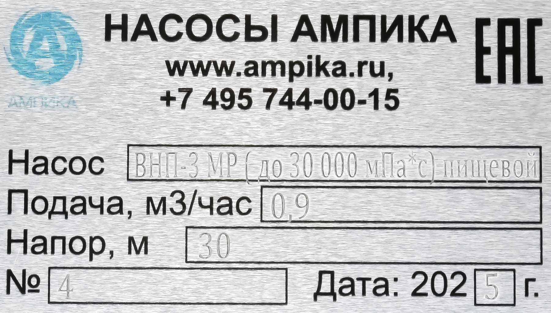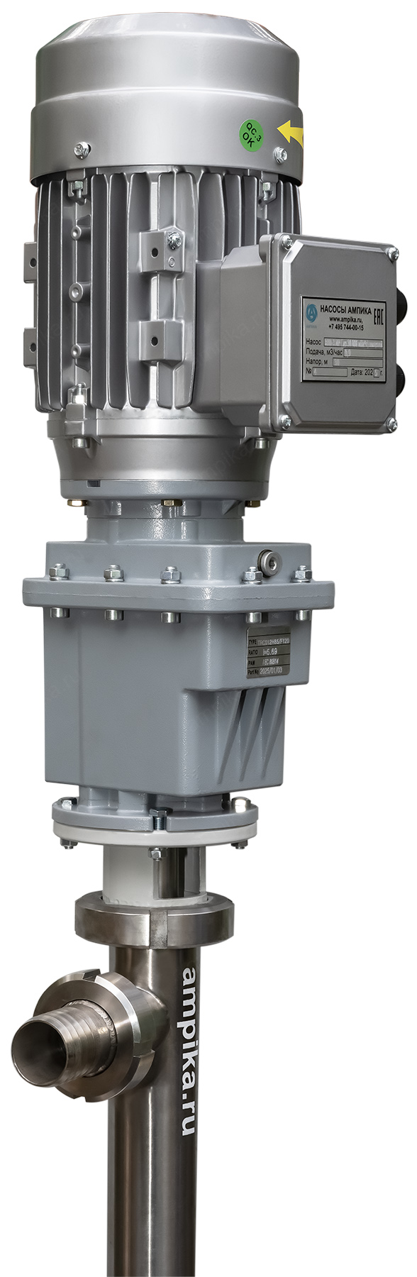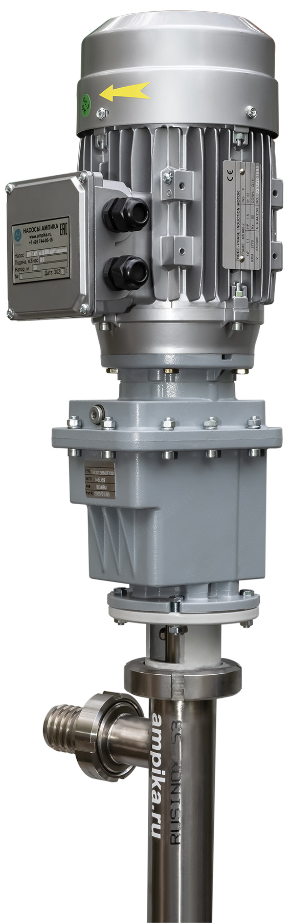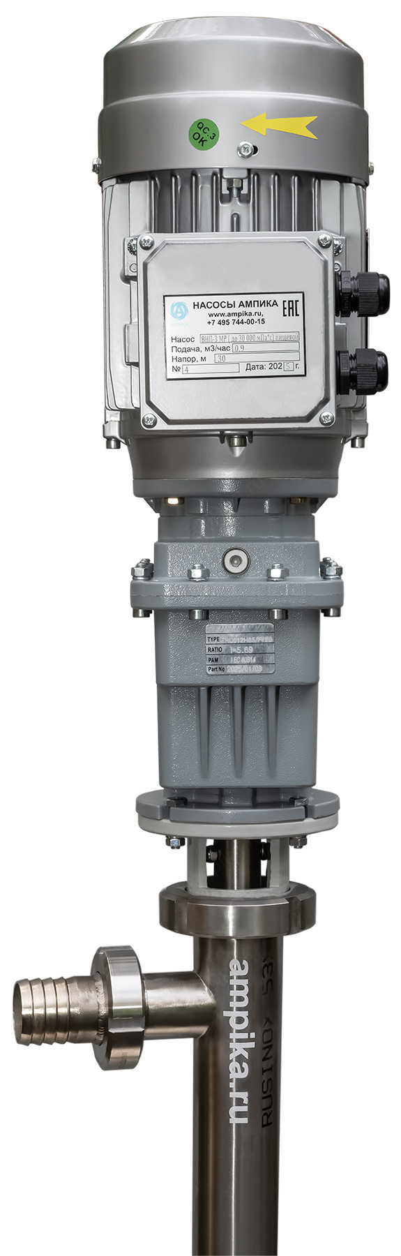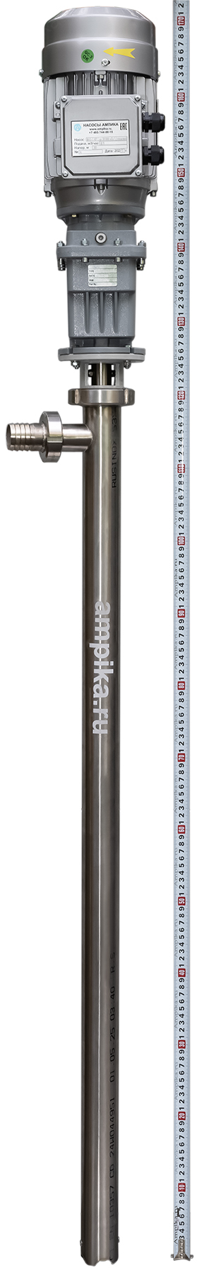 Винтовой полупогружной насос. Ампика ВНП-3 МР (до 30 000 мПа*с) пищевойПромышленный полупогружной пищевой насос с мотор-редуктором ВНП-3-МР предназначен для выкачивания высоковязких (с вязкостью до 30000 мПа*с) пищевых продуктов с из 200-литровых бочек и еврокубов. Насос может использоваться например для выкачивания таких жидкостей, как глюкозный сироп, патока, жир, сорбитол, пищевые масла, майонез, сметана, щелочные жидкости (например, лауретсульфат натрия (SLES), гидроксид натрия) и подобных жидкостей, не агрессивных к материалам насоса. В стандартном исполнении эта модель комплектуется статором из белой пищевой резины и уплотнением вала из EPDM. Размер пропускаемых частиц - до 3 мм, не более 10% по объёму. В качестве привода устанавливается мотор-редуктор типа TRC с оборотами выходного вала 490 мин⁻¹. Это позволяет перекачивать высоковязкие жидкости, например холодные трансмиссионные масла, которые плохо текут. Для работы с такими жидкостями требуются пониженные обороты винта, т.к. иначе продукт не будет успевать затекать в насосную часть из-за большой вязкости и героторная пара будет работать "с голоданием", что приведёт к преждевременному износу обоймы. Рекомендуем также работать в паре с частотным преобразователем, т.к. он позволяет подстраивать обороты ротора в зависимости от вязкости жидкости, которая может меняться. Следует помнить, что чем больше будет вязкость (максимальная - 30000 мПа*с), тем ниже будет производительность насоса (подача в таблице указана на воде). ВНИМАНИЕ! Насос НЕ ПРЕДНАЗНАЧЕН!!! для полиэфирных смол, отвердителей, кислот, щелочей, растворителей!!! Уточняйте возможность работы насоса с каждой конкретной жидкостью у наших специалистов!!! Технические характеристики: 1) Глубина погружения - 1200 мм (возможно изготовление с глубиной погружения до 2000 мм под заказ). 2) Материал проточной части (трубы) – нержавеющая сталь марки AISI 304. 3) Материалы внутренних деталей (винт, торсион, наконечник вала э/д, фланец под торцевое уплотнение): 40Х13 (винт закалённый). 4) Уплотнение вала торцевое, с парой из карбида кремния и эластомером из EPDM. Возможна установка уплотнения из витона (фторкаучука). 5) Материал обоймы: белая пищевая резина 25-52-563 (NBR). Возможна установка обойм из: - полиуретана (это самый износостойкий материал), - витона (фторкаучука), - износостойкой МБС резины 7-В-14. 6) Диаметр погружной части: 53 мм. 7) Выход насоса – молочная муфта Ду38 DIN 11851 со штуцером под шланг Ду38 мм. 8) Мотор-редуктор с оборотами вала 490 об./мин. (по требованию заказчика можно поставить редуктор с пониженными оборотами), 9) Электродвигатель: общепромышленный, на 380 вольт, 1,1 кВт, IP54, с возможностью постоянной работы. Возможна комплектация электродвигателем во взрывозащищённом исполнении. Другие модели этого типа