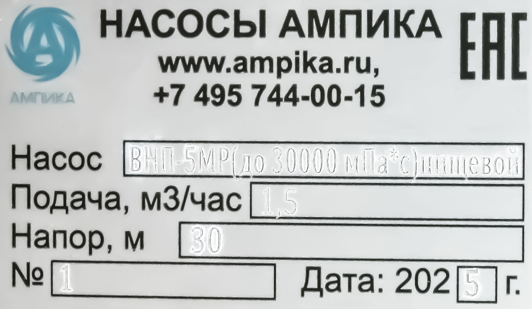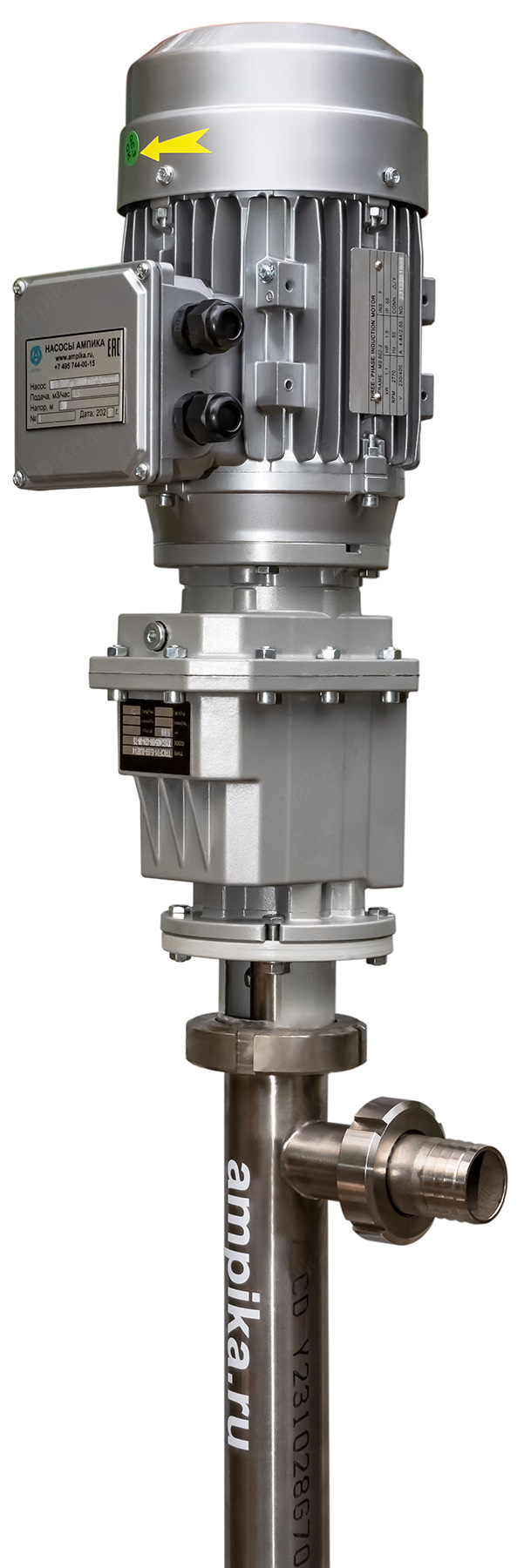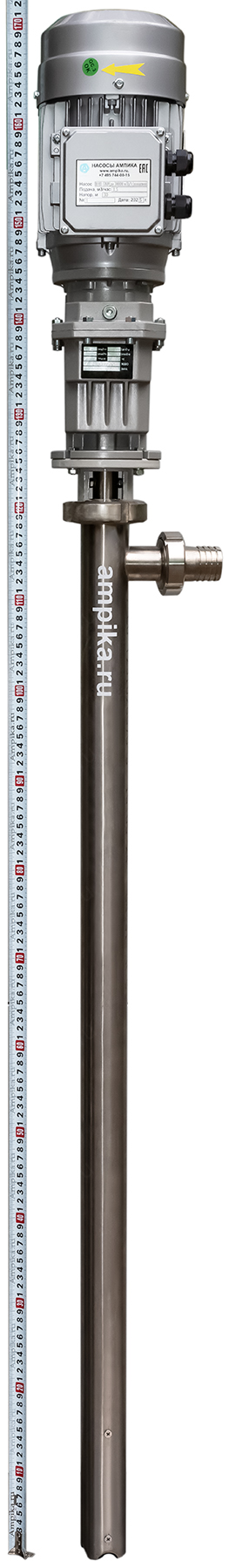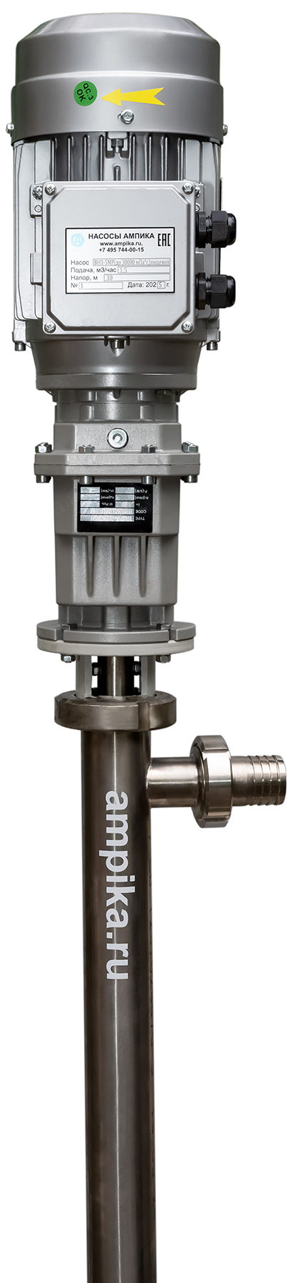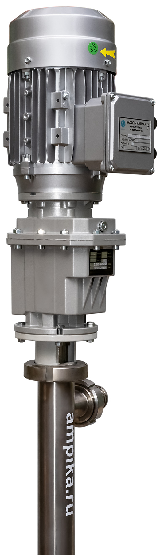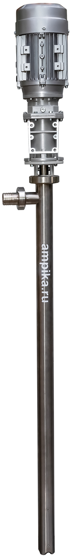 Винтовой полупогружной насос Ампика ВНП-5 МР (до 30 000 мПа*с) пищевойПолупогружной промышленный электрический бочковой насос ВНП-5-МР (с мотор-редуктором), пищевой предназначен для выкачивания высоковязких продуктов (с вязкостью до 30000 мПа*с) из бочек 200 л и еврокубов (глубина погружения - до 1,2 м). В стандартном исполнении эта модель комплектуется статором из пищевой белой резины и уплотнением вала из EPDM. Примеры перекачиваемых этим насосом веществ: лецитин, глюкозный сироп, фруктовое пюре, арахисовая паста, патока, жир, сорбитол, пищевые масла, майонез, сметана, глицерин, дехикварт, щелочные жидкости (например, лауретсульфат натрия (SLES), гидроксид натрия), жидкое стекло и любые подобные, неагрессивные к материалам насоса. Допускаются небольшие включения (сгустки). Размер пропускаемых частиц - до 3 мм, не более 10% по объёму. ВНИМАНИЕ! Насос НЕ ПРЕДНАЗНАЧЕН!!! для полиэфирных смол, отвердителей, кислот (возможна работа с некоторыми неконцентрированными, типа ортофосфорной, азотной), растворителей!!! Уточняйте возможность работы насоса с конкретной жидкостью у наших менеджеров!!! В качестве привода устанавливается мотор-редуктор типа TRC с выходными оборотами вала 490 мин.⁻¹. Это позволяет перекачивать высоковязкие жидкости, например патоку. Для работы с такими жидкостями требуются пониженные обороты винта, т.к. иначе продукт не будет успевать затекать в насосную часть из-за большой вязкости, и героторная пара насоса будет работать "с голоданием", что приведёт к преждевременному износу обоймы. Рекомендуем использовать насос в паре с частотным преобразователем, т.к. он позволяет подстраивать обороты ротора в зависимости от вязкости жидкости, которая может меняться. Следует помнить, что чем больше будет вязкость, тем ниже будет производительность насоса (подача насоса в таблице указана на воде). На больших вязкостях подача может упасть в 5-10 раз. Технические характеристики: Модель насоса ВНП-5-МР (вязкость до 30000 мПа*с) пищевой 1) Глубина погружения - 1200 мм, возможно изготовление с глубиной погружения до 2000 мм под заказ. 2) Материал проточной части (трубы) – AISI 304. 3) Материалы внутренних деталей (винт, торсион, наконечник вала э/д, фланец под торцевое уплотнение): нержавеющая сталь AISI304. 4) Уплотнение вала торцевое, с парой из карбида кремния и эластомером из EPDM. Возможна установка уплотнения из витона. 5) Материал обоймы: пищевая резина 25-52-563 (NBR). Возможна установка обойм из: - полиуретана (самый износостойкий материал), - витона (фторкаучука), - износостойкой МБС резины 7-В-14. 6) Диаметр погружной части насоса: 53 мм. 7) Выход насоса – молочная муфта Ду38 DIN 11851 со штуцером под шланг Ду38 мм. 8) Мотор-редуктор с оборотами вала 490 об./мин. (по требованию заказчика можно поставить редуктор с пониженными оборотами). 9) Электродвигатель: общепромышленный, трёхфазный, на 380 вольт , IP54, с возможностью постоянной работы. Возможна комплектация электродвигателем во взрывозащищенном исполнении. Другие модели этого типа