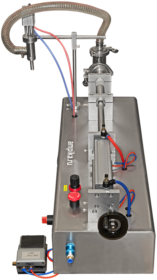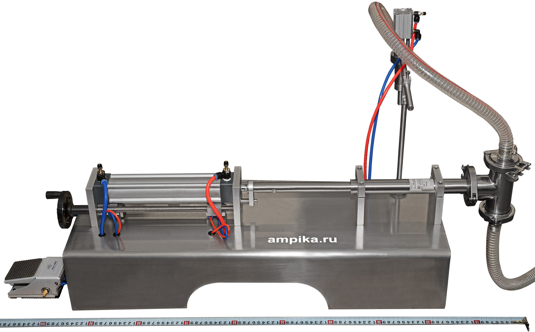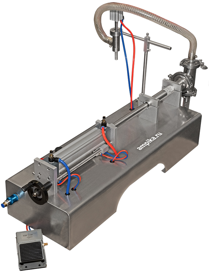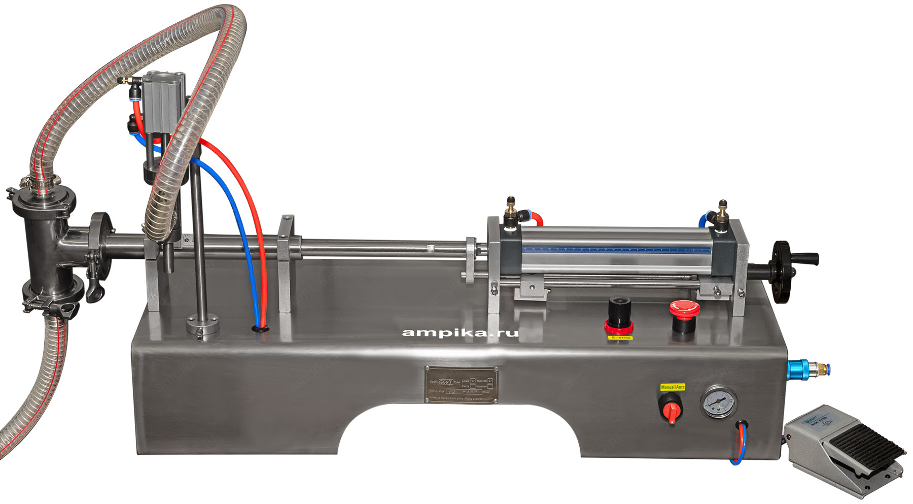 Дозировщик пневматический промышленный Ампика ДПП 5-100Дозатор малых доз пневматический ДПП 5-100 предназначен для розлива жидкостей средней вязкости (до 1000 мПа*с) таких как: молоко, алкоголь, масло, шампунь и т.п. при температуре до +60ºC. Конструктивно он представляет собой поршневой насос с пневмоприводом и возможностью регулировки хода поршня. Установка дозы происходит за счет выставления длины хода пневмопривода, которая выставляется вращением чёрной рукоятки в торце пневмоцилиндра. Также возможна регулировка скорости выдачи дозы (производительности), паузы между дозами и давления. Возможна работа в 2-х режимах: ручном и автоматическом. При работе в ручном режиме выдача одной единственной дозы производится после одного нажатия на педаль, которая идёт в комплекте. В автоматическом режиме дозатор работает непрерывно, выдавая одну за одной настроенную дозу через настроенный промежуток времени. Более доходчиво всё описано в шестиминутном видеоролике ниже. Дозатор самовсасывающий (не требует предварительной заливки). Для подъёма жидкости в дозатор достаточно просто опустить всасывающий шланг в ёмкость с продуктом. Точность дозирования: +/- 0,5%. Давление компрессора: 4-6 атм., нужен ресивер не менее 30 литров (компрессор приобретается отдельно). Расшифровка условного обозначения дозировщика ДПП-5-100: "ДПП" - дозатор поршневой пневматический, "5-100" - минимальная и максимальная выдаваемые дозы в мл (то есть возможна установка любой дозы в диапазоне от 5 до 100 мл). Комплект поставки: - дозатор в сборе, - всасывающий шланг длиной 1,5 метра, - педаль, - держатель раздаточной насадки с возможностью регулировки высоты и вылета, - комплект ЗИП. В таблице характеристик дозировщика указаны его вес и размеры в упаковочной коробке. Параметры собранного агрегата без упаковки: • длина: 1000 мм, • ширина: 280 мм, • высота: 300 мм, • вес: 18,4 кг. Паспорт (инструкция по эксплуатации дозатора) вложен в его упаковочную коробку. |