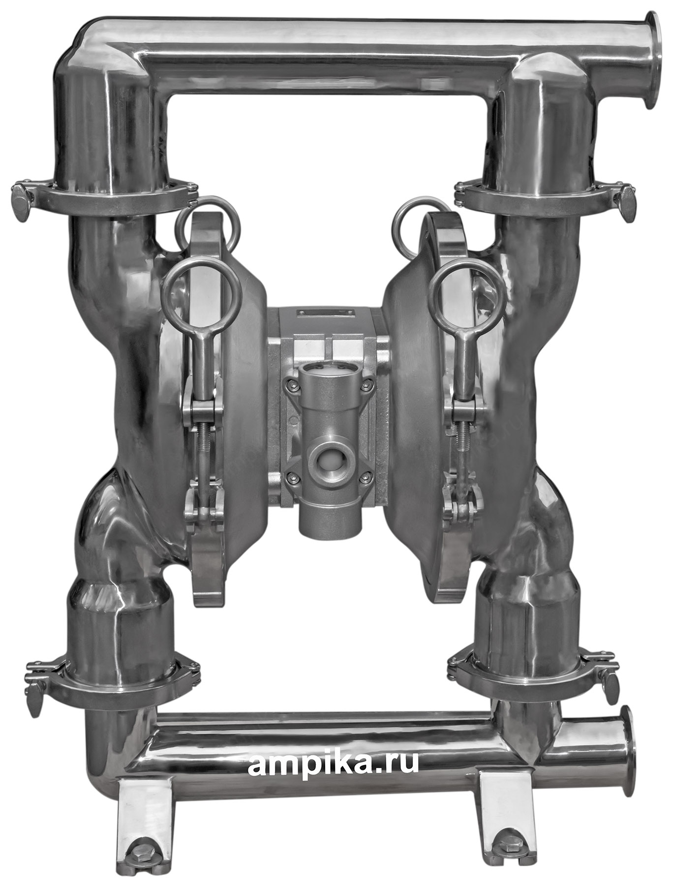 Материал корпуса проточной части - нержавеющая сталь марки AISI 316. Все внутренние металлические поверхности обработаны механической полировкой (финальный результат Ra 0,8). Вход/выход: быстроразъёмные соединения Tri-Clamp, Ø 77,5 мм. Насос является самовсасывающим, максимальная глубина самовсасывания насухую - 5,6 м. Но следует обязательно помнить, что высота самовсасывания зависит от множества параметров: от температуры жидкости, типоразмера насоса, плотности и вязкости перекачиваемого продукта. Допустимый диапазон температур перекачиваемой жидкости ограничен материалом мембран (тефлон, PTFE) и составляет от +4,4°C до +104°C. Высота всасывания насоса, если вся всасывающая магистраль находится под заливом - до 8 метров. Насос может перекачивать жидкости с твёрдыми частицами. Допустимый размер частиц в продукте зависит от типа используемых клапанов (у шаровых - меньше, у дисковых - больше). У конкретно этой модели клапана дисковые, что означает допустимые частицы в перекачиваемом продукте диаметром до 38 мм. ВАЖНО! С помощью ремкомплектов можно заменить один тип клапанов на другой (дисковый на шаровый). Это может потребоваться, например, если вязкость перекачиваемого продукта низкая, дисковые клапаны будут звенеть при работе. Всё подбирается под жидкость - обращайтесь к нашим специалистам. Расшифровка маркировки модели МП-77-Д-38: - МП - Мембранный Пищевой насос. - 77 - Округлённый размер присоединительных патрубков (клампов) в мм [77 -> Ø 77.5]. - Д - Тип клапанов: Д - дисковые клапаны (Ш - шаровые клапаны). - 38 - Размер пропускаемых частиц, мм.