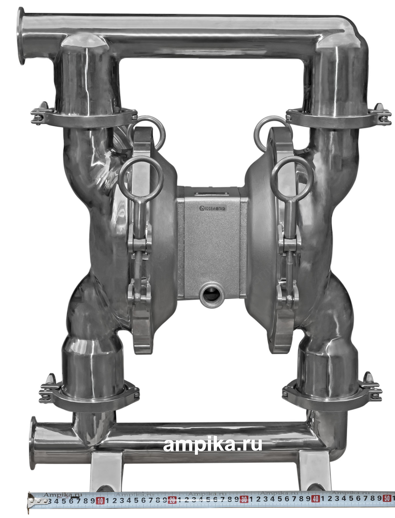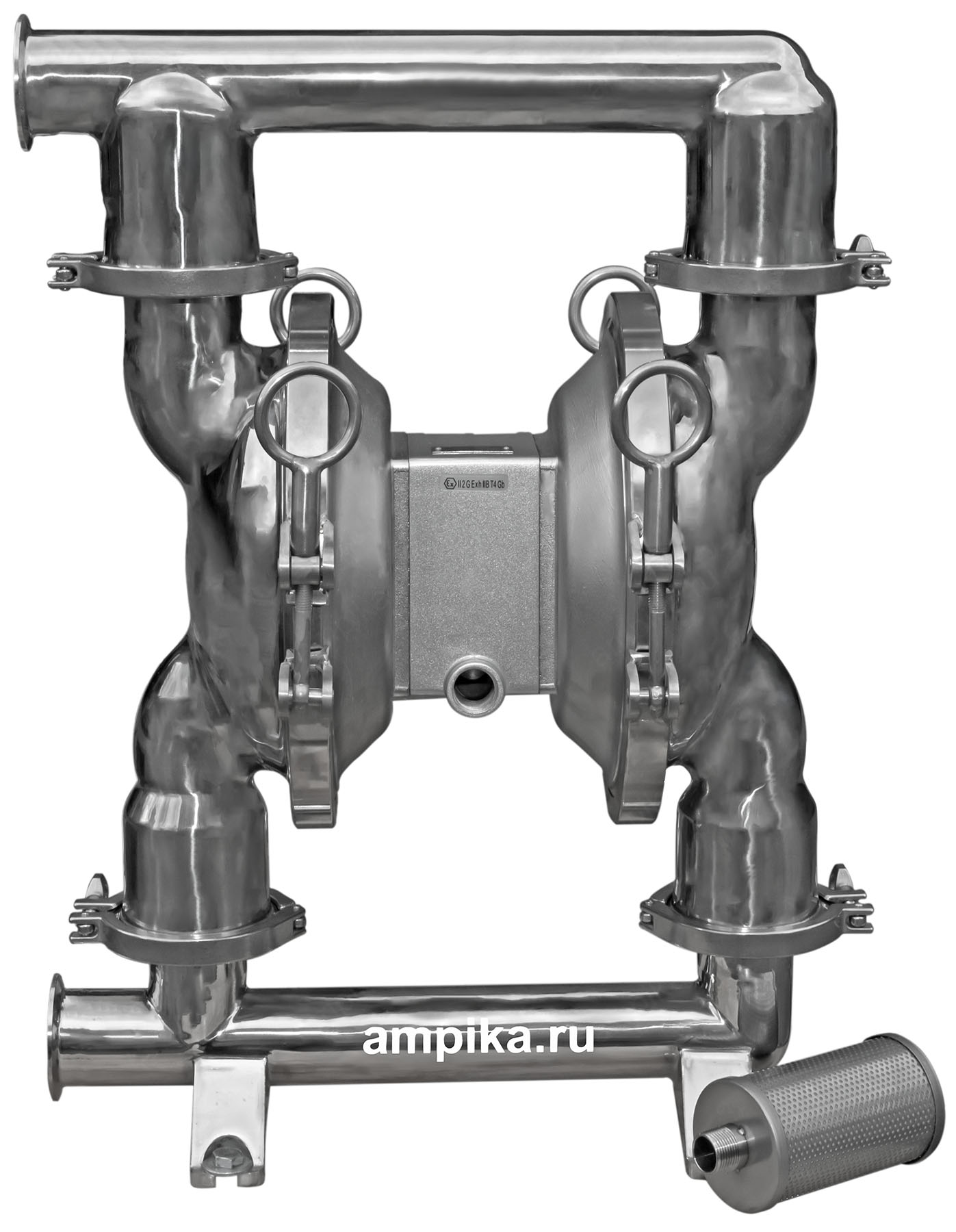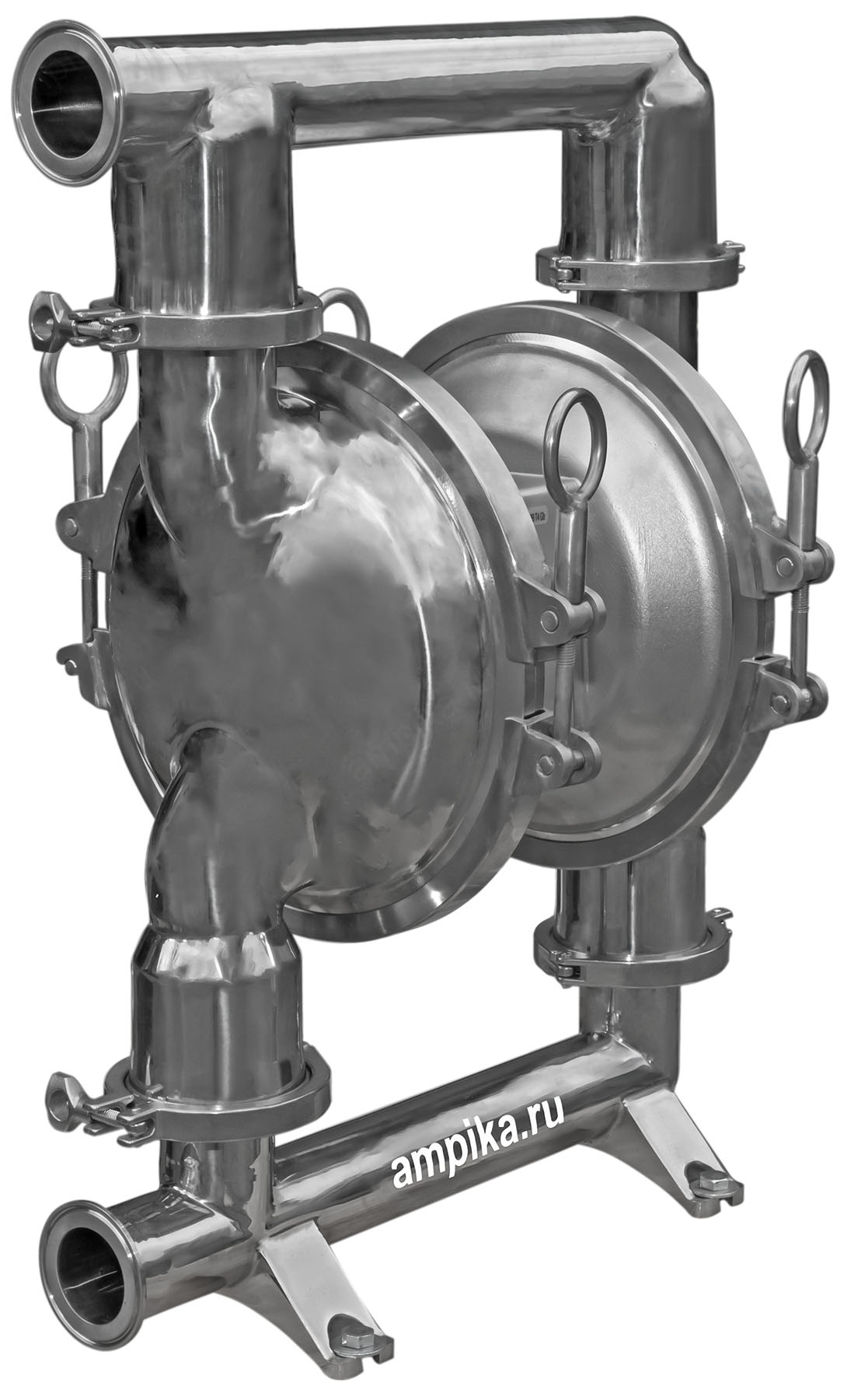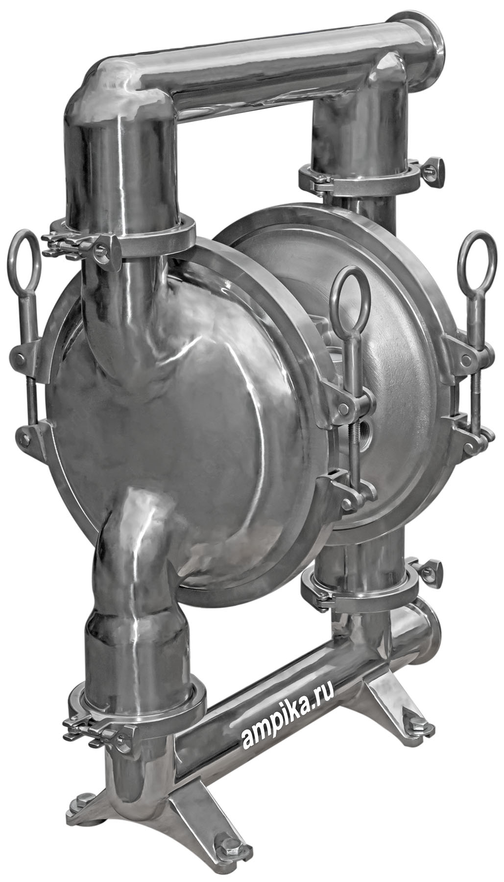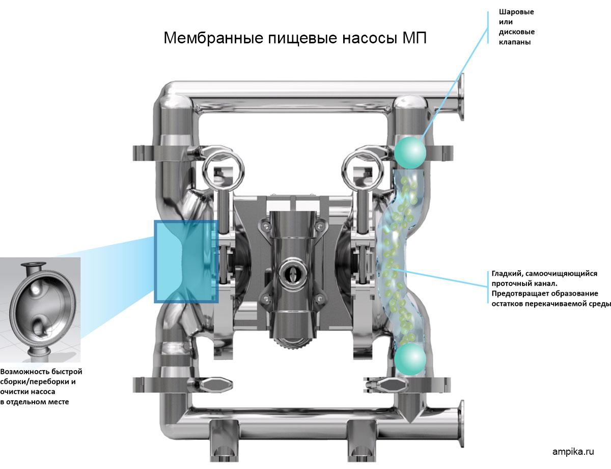 Мембранный пищевой насос Ампика МП-77-Д-38Большой промышленный пищевой мембранный насос МП-77-Д-38 предназначен для перекачки различных пищевых жидкостей с большими кусками продукта на пищевых производствах. Он может бережно, не повреждая ягод, не размалывая фрукты перекачивать например йогурты, джемы и подобные продукты. Насос приводится в действие сжатым воздухом, его производительность зависит от давления в пневматической магистрали. Его можно назвать пищевым насосом переменной производительности: установив перед насосом воздушный фильтр-редуктор, можно подстраивать подачу и давление насоса под текущие производственные нужды. Благодаря отсутствию электродвигателя насос отвечает требованиям взрывозащиты. Немаловажная особенность мембранного пищевого насоса МП - возможность быстрой сборки/разборки проточной части насоса для очистки и промывки (на фото ниже представлен насос в разобранном виде). Процесс сборки/разборки не требует специальных инструментов и может быть выполнен вручную.