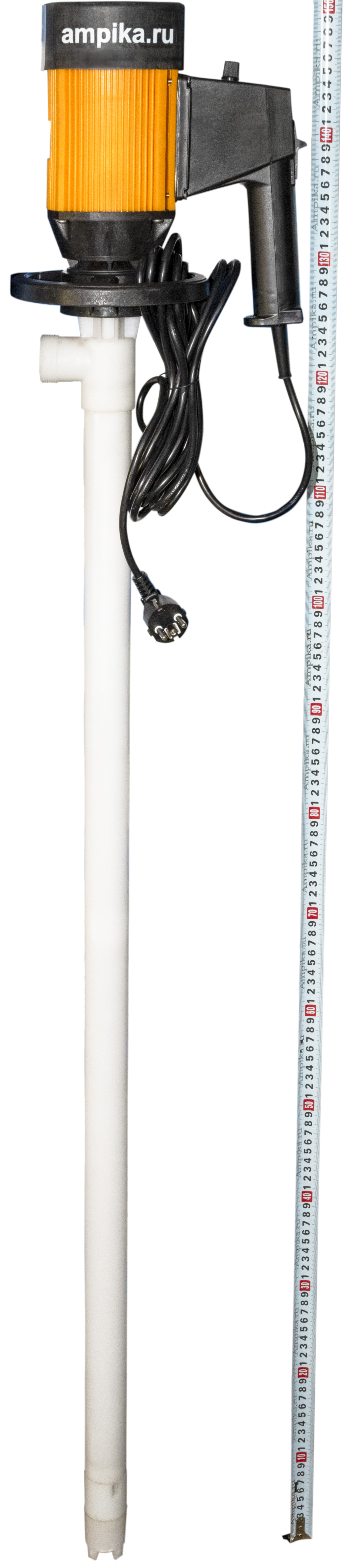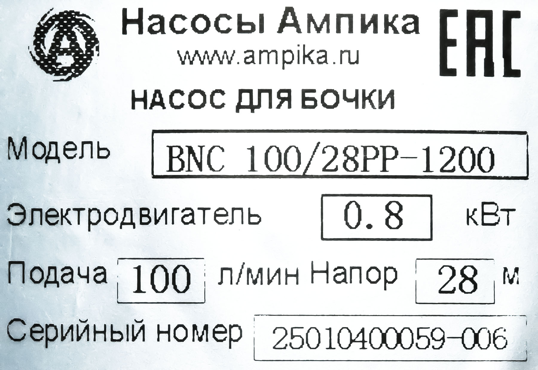 Бочковой химический насос Ампика BNC 100/28PP-1200Назначение Универсальный электрический бочковой насос BNС-100/28-PP-1200 предназначен для выкачивания различных химически активных жидкостей без механических примесей из 60-литровых бочек (глубина погружения насоса составит 700 мм), 200-литровых бочек (1000 мм) и еврокубов (1200 мм). Максимальная вязкость перекачиваемой жидкости - 500 мПа*с. Следует помнить, что при перекачке вязких жидкостей может сильно уменьшиться производительность (подача и напор) насоса. Диаметр погружной части насоса - 42 мм. На выходе насос имеет съёмный штуцер под шланг внутренним диаметром 25 мм. Это насос без уплотнения вала (при работе насоса жидкость не доходит до подшипникового узла). ВНИМАНИЕ! Насос следует хранить только в вертикальном положении!!! Хранение в горизонтальном положении может привести к попаданию перекачиваемой жидкости в подшипниковый узел. Насосы серии BNC поставляются в сборе с электродвигателями мощностью 800 Вт и скоростью вращения 10000 об./мин., с возможностью регулировки оборотов. Степень защиты - IP44. ВНИМАНИЕ! Электродвигатели коллекторного типа. Режим работы - кратковременный: на максимальных оборотах - не более 3 минут (достаточно, чтобы откачать бочку 200 литров), на оборотах 80% от номинала - не более 10-15 минут с перерывом на охлаждение. Возможна комплектация любого насоса пневматическим двигателем 375 Вт х 1000 об./мин., или взрывозащищённым электродвигателем. ВНИМАНИЕ! При работе насоса в паре с пневматическим двигателем рабочие параметры подачи и напора химического бочкового насоса уменьшаются примерно на 50%. При выборе насоса ОБЯЗАТЕЛЬНО проконсультируйтесь с нашими специалистами! Расшифровка обозначения: BNС 100/28PP-1200 «BNС» – бочковой насос химический, «100» - максимальная производительность 100 литров в минуту, «28» - максимальный напор, м (насос создаёт давление до 2,8 атмосферы), «PP» - корпус из полипропилена (вал из хастеллоя, крыльчатка - из PTFE), «1200» - длина погружной части в миллиметрах. В таблице параметров указаны габариты и вес коробки с насосом. Параметры самого насоса: • длина: 250 мм, • ширина: 170 мм, • высота: 1510 мм, • вес: 5 кг. Паспорт (инструкция по эксплуатации бочковых насосов BNC) вложен в коробку. Другие модели этого типа