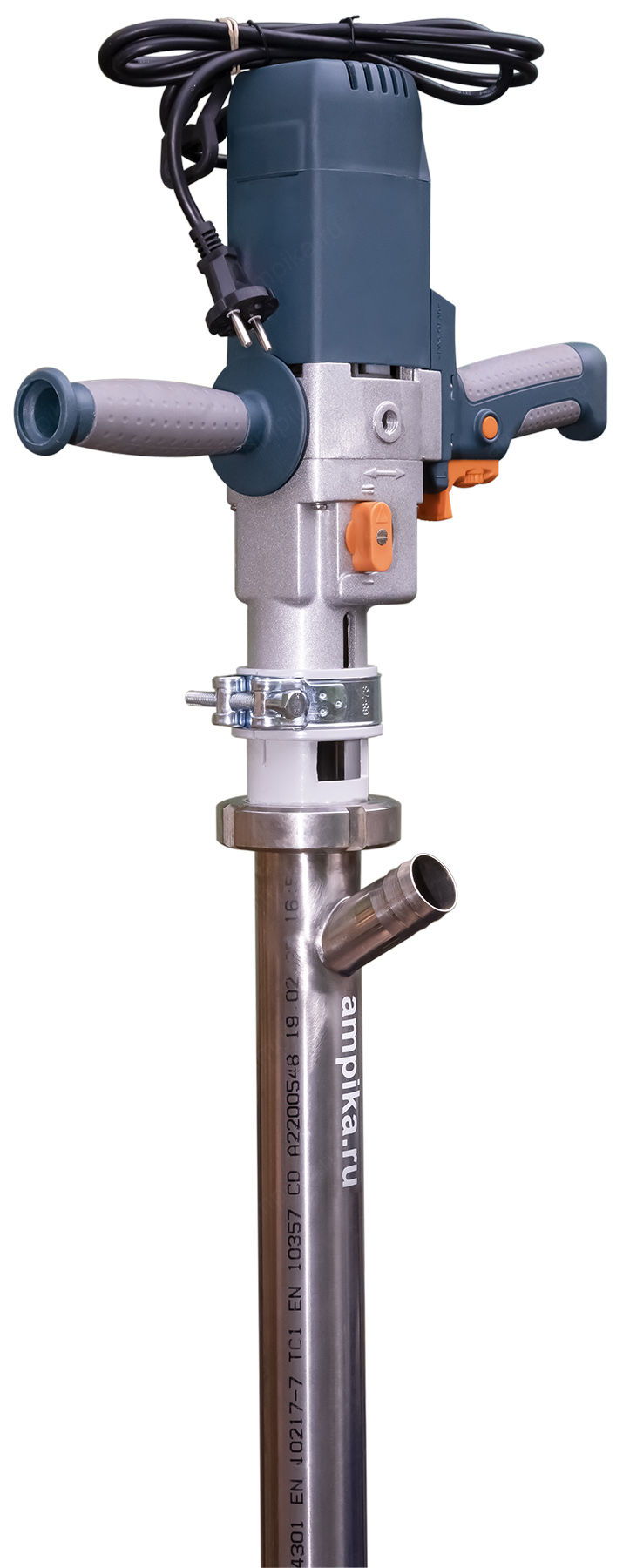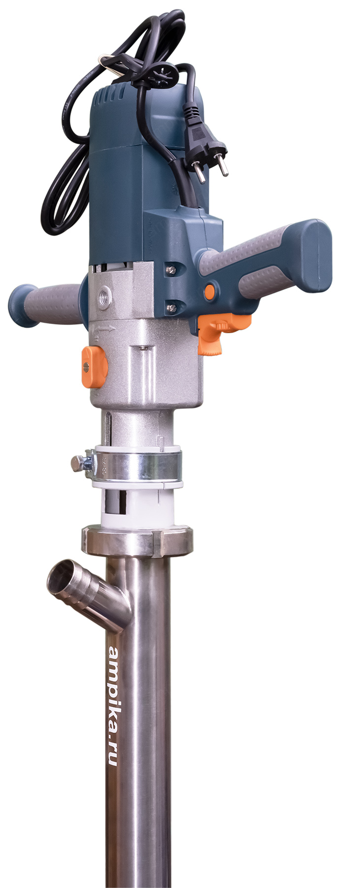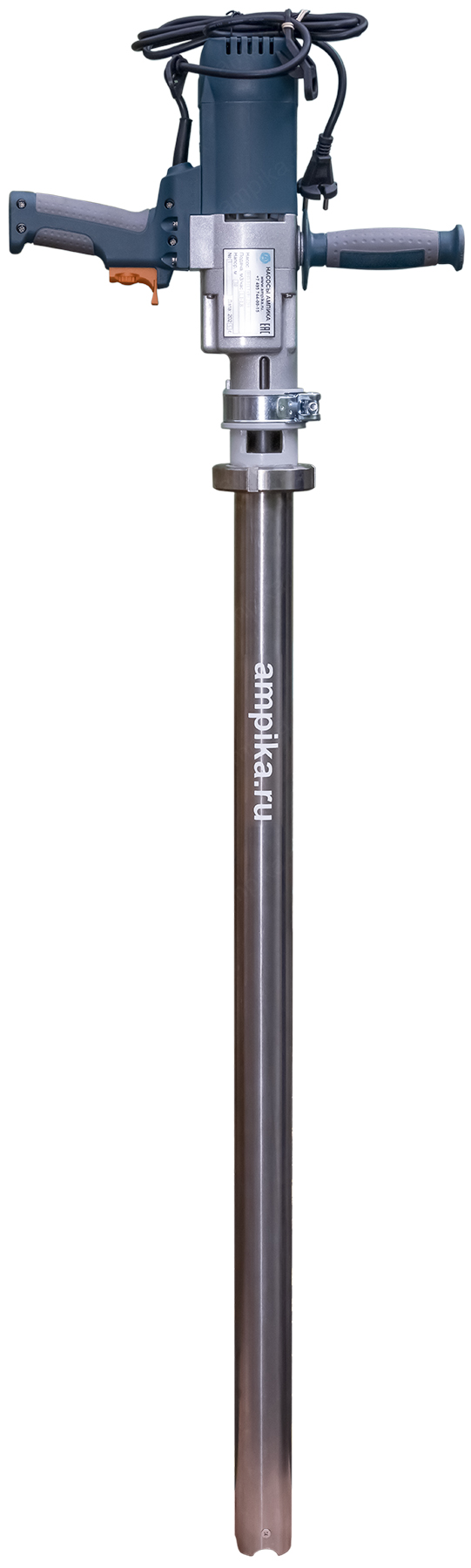 Винтовой бочковой насос Ампика ВНП-3 (1,3 кВт_220В) AISI304, FKMНазначение: Лёгкий электрический бочковой насос ВНП-3_1,3 кВт_220В_AISI304, в химическом исполнении FKM предназначен для выкачивания жидких химических веществ с вязкостью до 10000 мПа*с из бочек 200 л, 60 л, фляг (допустимая глубина погружения - до 1,2 м). Примеры перекачиваемых этим насосом жидкостей: краски, лаки, клеи на водной основе, масла, дизельное топливо, эпоксидные смолы, кислотные жидкостей с PH до 3 (ортофосфорная кислота, лимонная кислота, азотная кислота) и любые подобные жидкости, химически не агрессивные к материалам насоса. Исполнение по эластомерам: статор из фторкаучука, уплотнение вала из витона. ВНИМАНИЕ! Насос НЕ ПРЕДНАЗНАЧЕН для полиэфирных смол, отвердителей, кислот, щелочей, растворителей, хлорсодержащих жидкостей!!! Уточняйте возможность работы насоса с каждой конкретной жидкостью у наших специалистов!!! Винтовой насос на 220 вольт для выкачивания вязких веществ из бочек ВНП-3 подаёт в среднем 1,5 куба продукта в час с напором 30 метров. В качестве привода использован массовый и удобный в обращении электродвигатель от профессиональной дрели, позволяющий изменять скорость вращения ротора и подачу насоса в диапазоне от 1,1 до 1,8 м3/час. Питается от стандартной бытовой розетки. Запасные щётки идут в комплекте. Благодаря этому решению насос имеет небольшой вес и может легко транспортироваться от бочки к бочке. Технические характеристики: 1) Максимальная глубина погружения - 1200 мм (возможно изготовление с глубиной погружения до 2000 мм). 2) Размер пропускаемых частиц - до 3 мм, не более 10% по объёму. 3) Материал корпуса проточной части (погружной трубы) и внутренних деталей насоса (винт, торсион, наконечник вала электродвигателя, фланец под торцевое уплотнение): нержавейка AISI304. 4) Уплотнение вала торцевое, с парой из карбида кремния и эластомером из витона (фторкаучук). Возможна установка уплотнения из EPDM. 5) Материал обоймы: фторкаучук (витон, FKM). Возможна установка обойм из: - полиуретана (самый износостойкий материал). - пищевой резины 25-52-563 (NBR), - износостойкой МБС резины 7-В-14. 6) Наружный диаметр погружной части: 53 мм. 7) Выход насоса – штуцер под шланг Ду 38 мм. 8) Электродвигатель: щёточный, от дрели, однофазный, на 220 вольт, с возможностью регулировки оборотов. Режим работы периодический: 10-15 минут работа, затем перерыв до полного остывания электродвигателя. В комплекте идут запасные щётки электромотора и клин для съёма вала насоса, который вставляется в электропривод (там конус Морзе). Другие модели этого типа