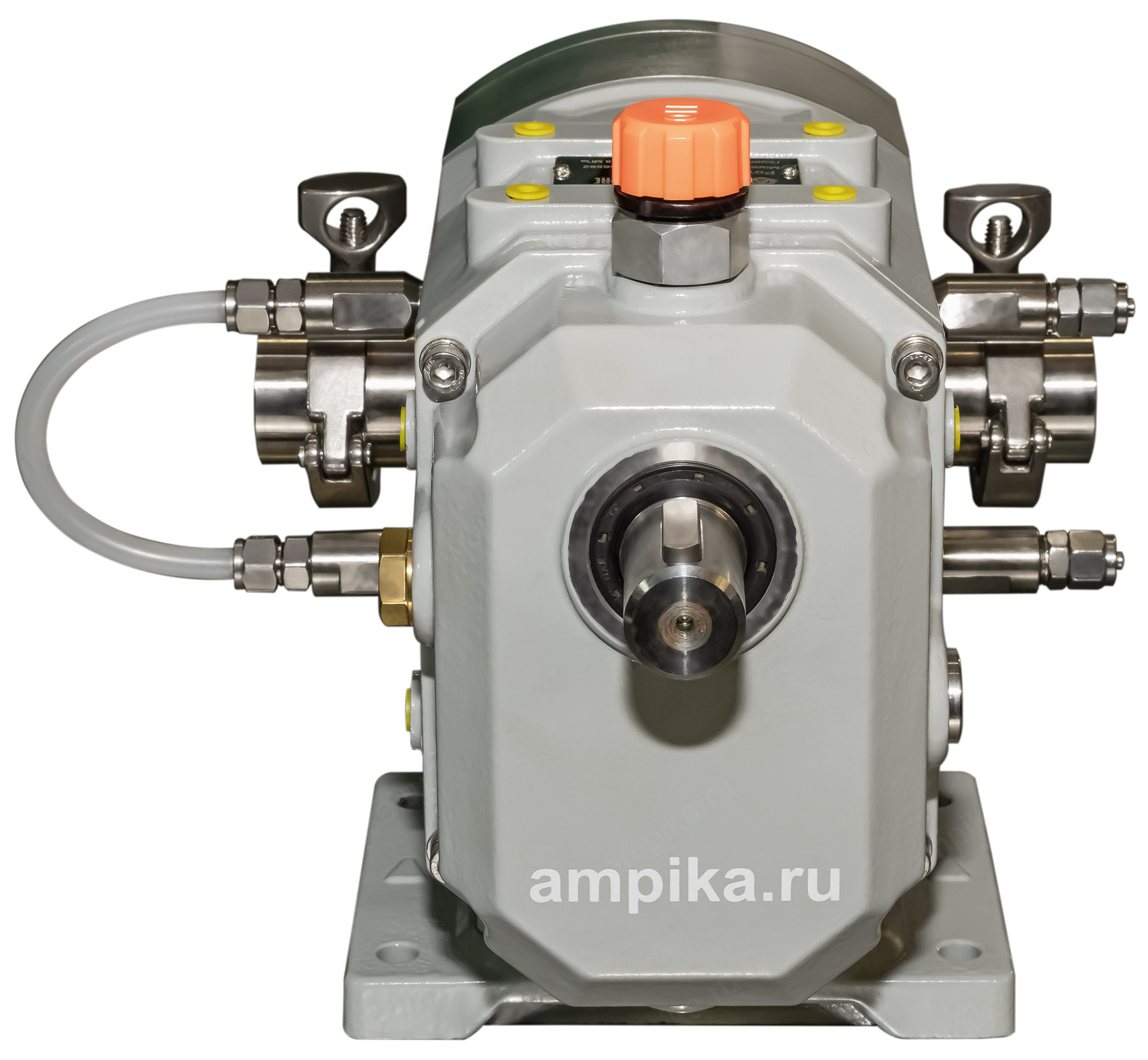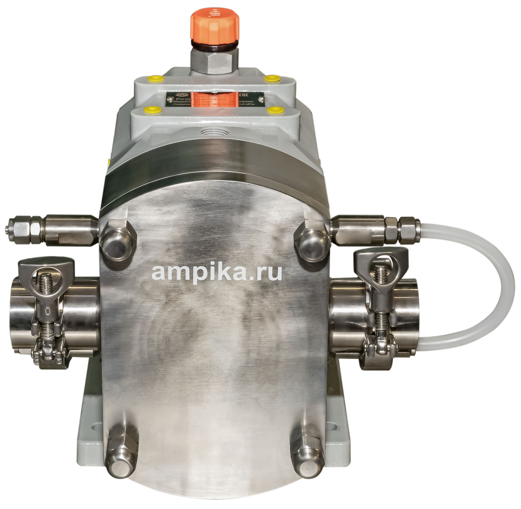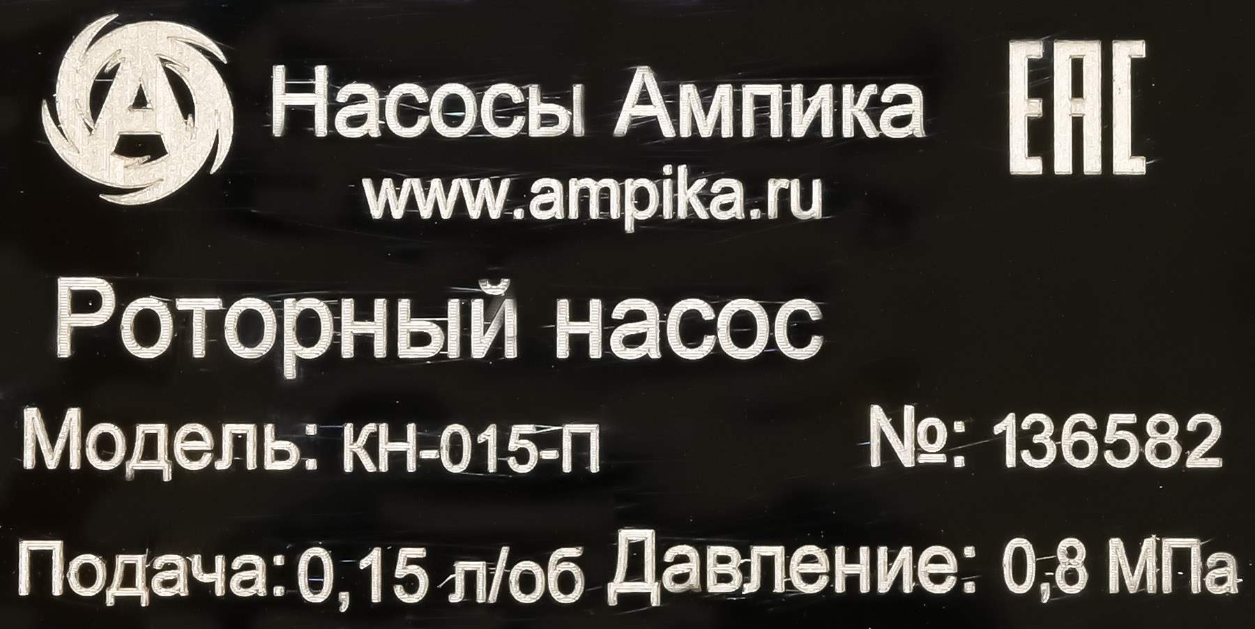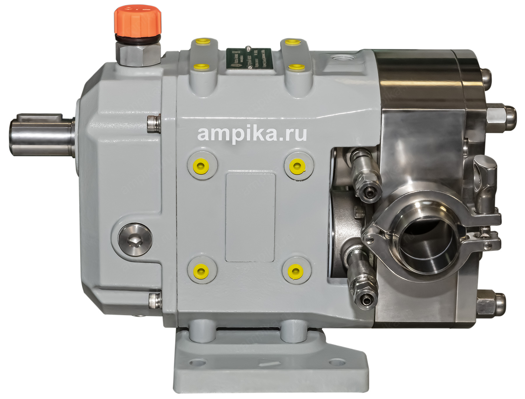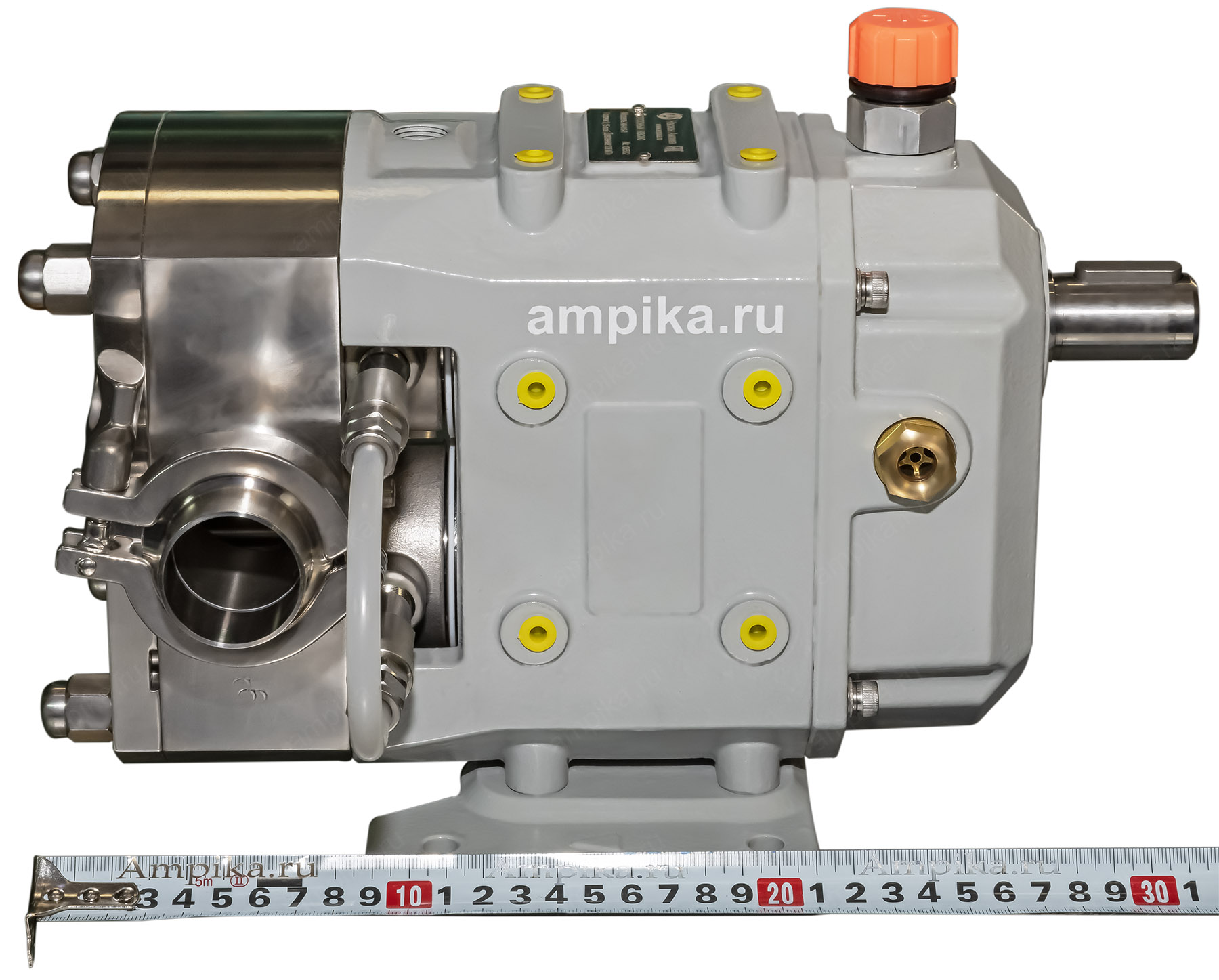 Кулачковый насос Ампика КН-015-П б/д, б/рПромышленный насос кулачкового принципа действия КН-015-П без двигателя, без рамы. Он предназначается для перекачки самых различных жидких веществ вязкостью до 100 000 мПа*с и температурой до +120 ºC. Способность перекачивать вязкие жидкости зависит от оборотов ротора насоса: чем ниже скорость его вращения, тем более вязкую среду способен перекачивать насос. Это насос с возможностью промывки узла уплотнения, без рубашки обогрева. Подходит для вязких и горячих жидкостей. Проточная часть, роторы и вал изготовлены из пищевой стали AISI316. Обработка внутренних поверхностей насоса: Ra 3,2-1,6. Уплотнение вала - торцевое (SIC-SIC-Viton). Вход/выход - клампы с ответной частью под приварку размером "полтора дюйма". Такой тихоходный пищевой насос может бережно перекачивать пищевые жидкости (в том числе горячие) без разрушения их структуры. В стандартном исполнении насос комплектуется трёхлепестковыми роторами. Максимальные размеры пропускаемых частиц: - для 3-х лепестковых роторов: до 11 мм, - для 2-х лепестковых роторов: до 17 мм. Указанное в таблице параметров максимальное давление насос развивает при вязкости жидкости от 1000 мПа*с. При низкой вязкости перекачиваемого продукта давление на выходе насоса может сильно упасть. Для правильного подбора оборудования обращайтесь к нашим специалистам! Расшифровка обозначения марки насоса КН-015-П б/д, б/р: - "КН" - кулачковый насос, - "015" - производительность головки насоса в литрах за 100 оборотов вала (015 = 0,15 л/оборот), - "П" - с возможностью промывки узла уплотнения вала, - "б/д " - без электродвигателя, - "б/р" - без рамы. В таблице характеристик насоса указаны его вес и размеры в упаковочной коробке. Параметры голого насоса: • длина: 330 мм, • ширина: 290 мм, • высота: 230 мм, • вес: 28 кг. Другие модели этого типа
