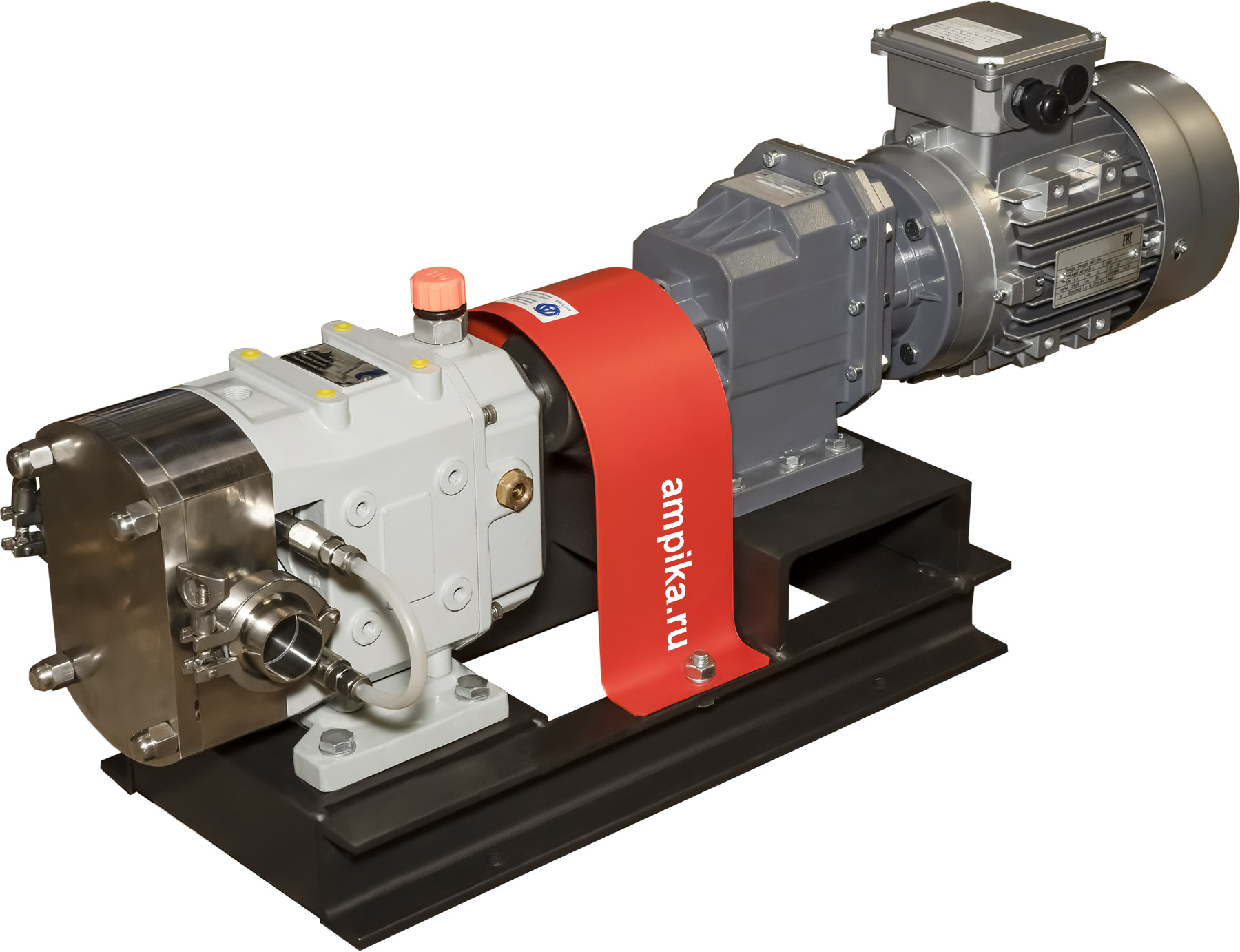 Кулачковый насос Ампика КН-170-П-МР (271) с э/д 11 кВтБольшой промышленный насосный агрегат кулачкового принципа действия КН-170-П-МР (271) с э/д 11 кВт способен перекачивать различные жидкие вещества вязкостью до 100 000 мПа*с при температуре до +120ºC. Он перекачивает 25 кубометров жидкости за час, создавая на своём выходе давление 5 атм. Подходит для вязких и горячих жидкостей. Это насос с возможностью промывки узла уплотнения, без рубашки обогрева. Проточная часть, роторы, вал изготовлены из пищевой стали AISI316, уплотнение вала - торцевое (SIC-SIC-Viton). Обработка внутренних поверхностей насоса: Ra 3,2-1,6. Вход/выход - клампы с ответной частью под приварку размером "три с половиной дюйма". При частоте питающего тока 50 Гц вал электродвигателя вращается со скоростью 1450 оборотов в минуту. Он приводит в движение редуктор с передаточным отношением 5,4. В результате понижения оборотов роторы насоса вращаются со скоростью 270 об./мин. Тихоходный пищевой насос может бережно перекачивать пищевые жидкости (в том числе горячие) без разрушения их структуры. В стандартном исполнении насос комплектуется трёхлепестковыми роторами. Максимальные размеры пропускаемых частиц: - для 3-х лепестковых роторов: до 26 мм, - для 2-х лепестковых роторов: до 40 мм. Указанное давление насос развивает при вязкости жидкости от 1000 мПа*с. При низкой вязкости перекачиваемого продукта давление на выходе насоса может сильно упасть. Для правильного подбора оборудования обращайтесь к нашим специалистам! Расшифровка обозначения марки насоса КН-170-П-МР (271) с э/д 11 кВт: - "КН" - кулачковый насос, - "170" - производительность головки насоса в литрах за 100 оборотов вала (170 = 1,7 л/оборот), - "П" - с возможностью промывки узла уплотнения вала, - "МР" - с мотор-редуктором (с фиксированными оборотами), - "(271)" - скорость вращения выходного вала мотор-редуктора, оборотов в минуту, - "с э/д " - готовый к использованию насосный агрегат с электродвигателем, - "11 кВт" - мощность трёхфазного (на 380 вольт) электродвигателя. Агрегат собственного производства Ампики, фотографии сделаны на нашем подмосковном складе. Этот конкретный экземпляр предназначался для перекачки ПАВ SLES (расшифровывается как Sodium Laureth Sulfate, Лауретсульфат натрия - это анионное поверхностно-активное вещество (ПАВ), которое используется в косметике, моющих средствах и бытовой химии из-за своих сильных очищающих и пенообразующих свойств). Для этого вещества стандартное уплотнение вала насоса из витоновой резины было заменено на EPDM. Другие модели этого типа