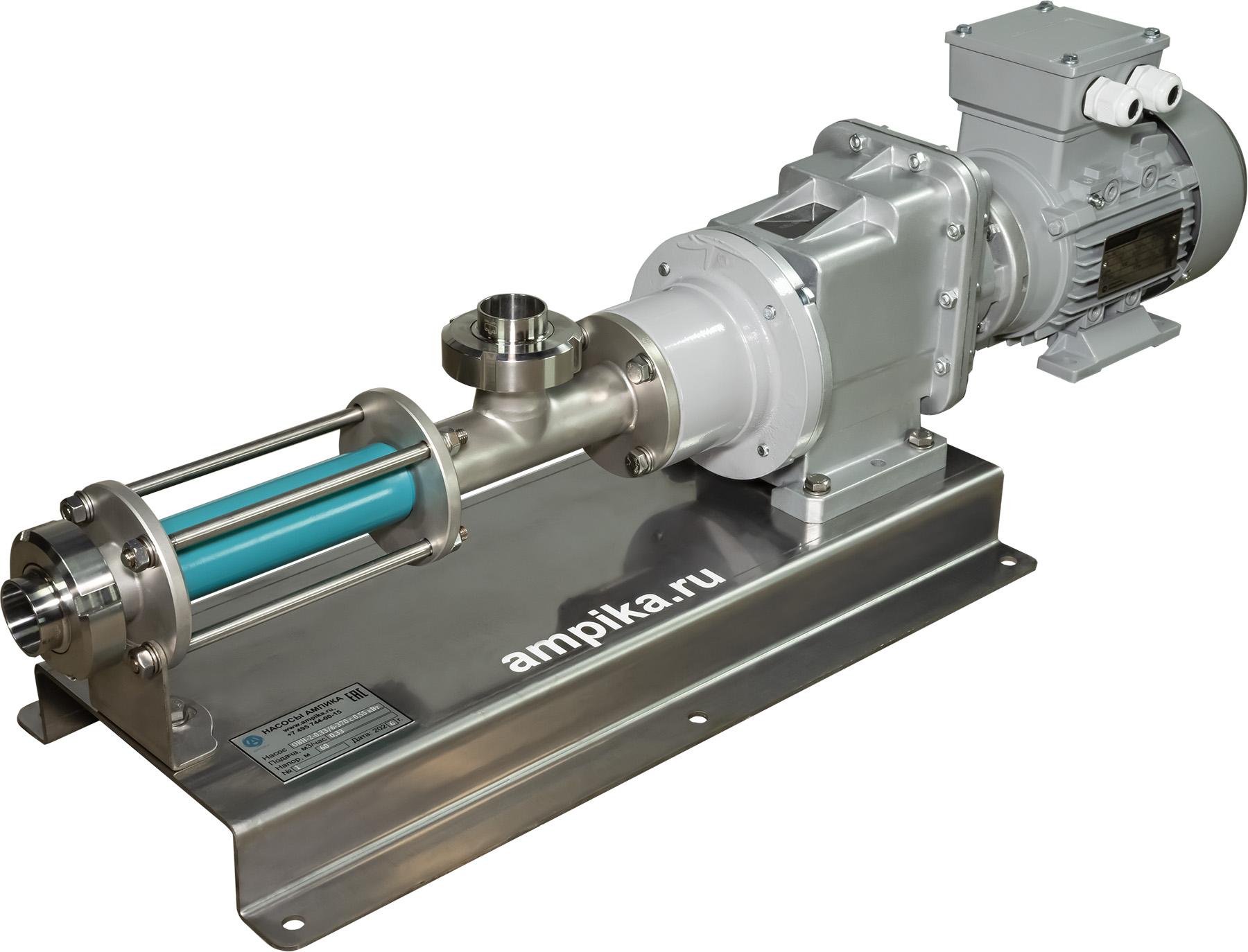 Винтовой насос Ампика ОВН-18-4,0/6-370 с э/д 2,2 кВтВинтовой насос с мотор-редуктором ОВН 18-4,0/6-370 с э/д 2,2 кВт предназначен для перекачивания вязких жидкостей вязкостью до 50000 мПа*с при температуре до +80ºC (возможно изготовление высокотемпературной версии, до +140ºC). Вязкость жидкости указана ориентировочно, возможность перекачивания каждого конкретного продукта в каждой конкретной системе зависит от множества факторов. При заказе уточняйте у менеджеров. Вход/выход - молочная муфта Ду50 со штуцером под сварку. Возможно изготовление с фланцами или с клампами. Возможен вариант насоса с приёмным бункером или прямоугольной горловиной. Расшифровка условного обозначения винтового насоса ОВН-18-4,0/6-370 с э/д 2,2 кВт: - ОВН – одновинтовой насос; - 18 – производительность насоса на 100 оборотов винта в литрах; - 4,0 – производительность насоса в м³/час на номинальных оборотах двигателя, - 6 – давление нагнетания, кгс/см²; - 370 – частота вращения винта, мин⁻¹; - с э/д 2,2 кВт – с общепромышленным асинхронным трёхфазным электродвигателем мощностью 2,2 кВт. На фотографиях изображён насос с вентилятором принудительного охлаждения электродвигателя - это опция, за доплату. Такой вентилятор нужен при использовании частотного регулятора для понижения частоты вращения вала. В этом случае штатная крыльчатка охлаждения мотора может не давать достаточного охлаждения на низких оборотах, а электрический вентилятор работает независимо. Также сфотографированный насос отличается от стандартного уплотнением вала. Штатное уплотнение по умолчанию - торцевое, а на данном конкретном сделана сальниковая набивка (опция, за доплату). Этот узел можно увидеть в прорези проставки между мотор-редуктором и насосной частью. Такой вариант уплотнения лучше подходит для перекачки липких и застывающих жидкостей. Конкретный изображённый на фотографиях насос предназначался для перекачки акриловой краски. Габариты: 1300х300х300, вес: 48 кг. Другие модели этого типа