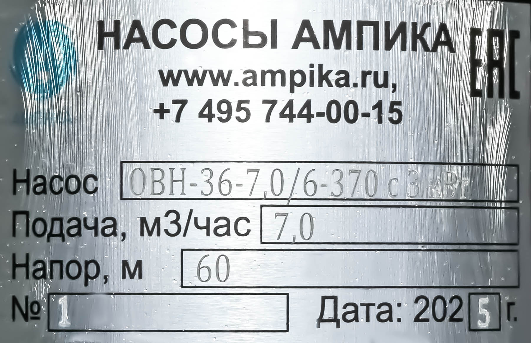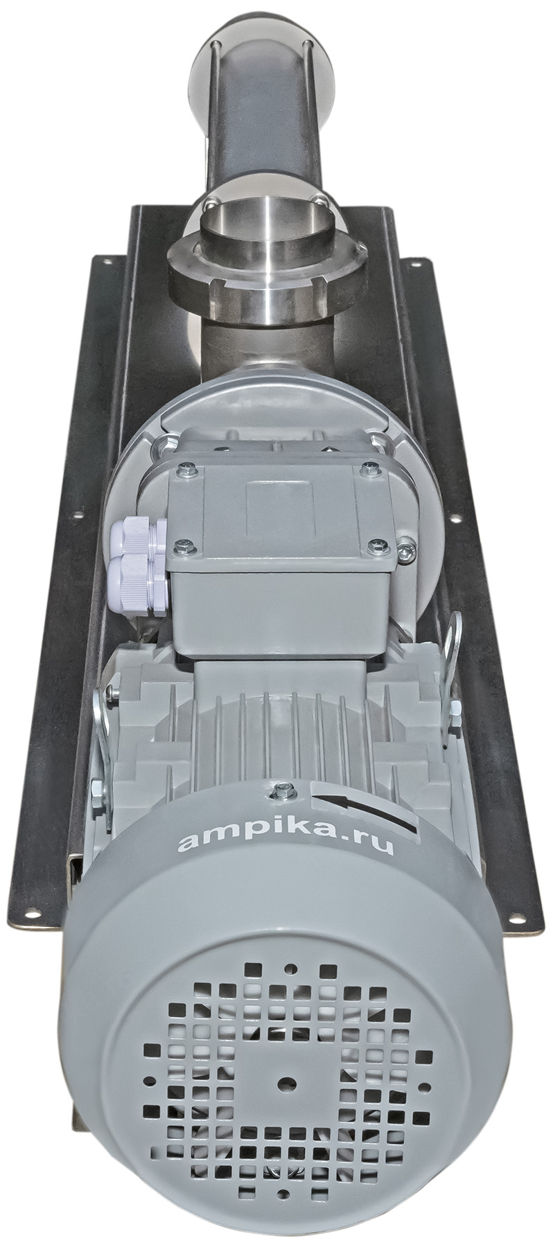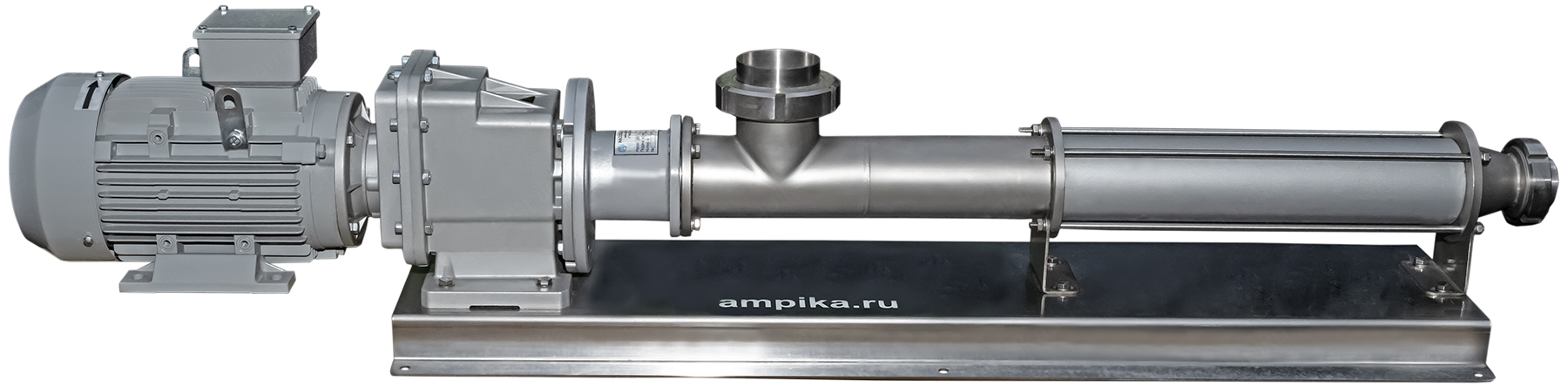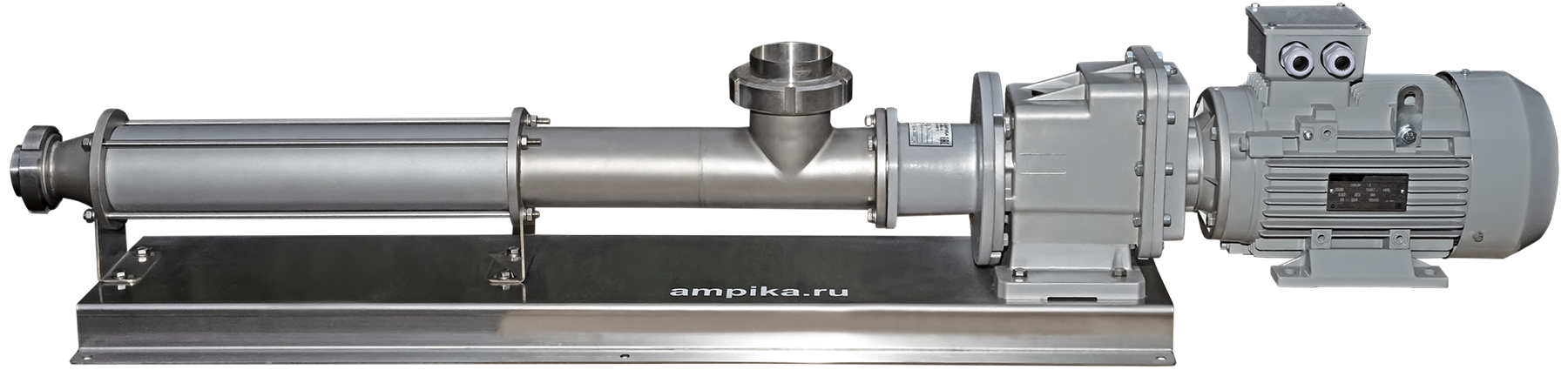 Винтовой насос Ампика ОВН-36-7,0/6-370 с 3 кВтПромышленный винтовой насос с мотор-редуктором ОВН-36-7,0/6-370 с 3 кВт предназначен для перекачивания вязких жидкостей вязкостью до 50000 мПа*с при температуре до +80ºC (возможно изготовление высокотемпературной версии, до +140ºC). Вязкость жидкости указана ориентировочно, возможность перекачивания каждого конкретного продукта в каждой конкретной системе зависит от множества факторов. При заказе всегда уточняйте у наших менеджеров возможность работы каждого конкретного насоса с каждой конкретной жидкостью. Правильный подбор насоса - залог долгой и успешной работы. Вход насоса оснащён быстроразъёмным пищевым соединением (молочной муфтой) диаметром 80 мм. Выход - молочная муфта Ду50 со штуцером под сварку. Возможно изготовление с фланцами или с клампами. Возможен вариант насоса с приёмным бункером или прямоугольной горловиной. Расшифровка условного обозначения винтового насоса ОВН-36-7,0/6-370 с 3 кВт: - ОВН – одновинтовой насос; - 36 – номинальная производительность винтовой пары (обойма-винт) насоса на 100 оборотов винта, литров; - 7,0 – производительность насоса в м³/час на номинальных оборотах двигателя; - 6 – давление нагнетания, кгс/см²; - 370 – частота вращения винта, мин⁻¹; - с э/д 3 кВт – с общепромышленным асинхронным трёхфазным электродвигателем мощностью 3 киловатта. Другие модели этого типа