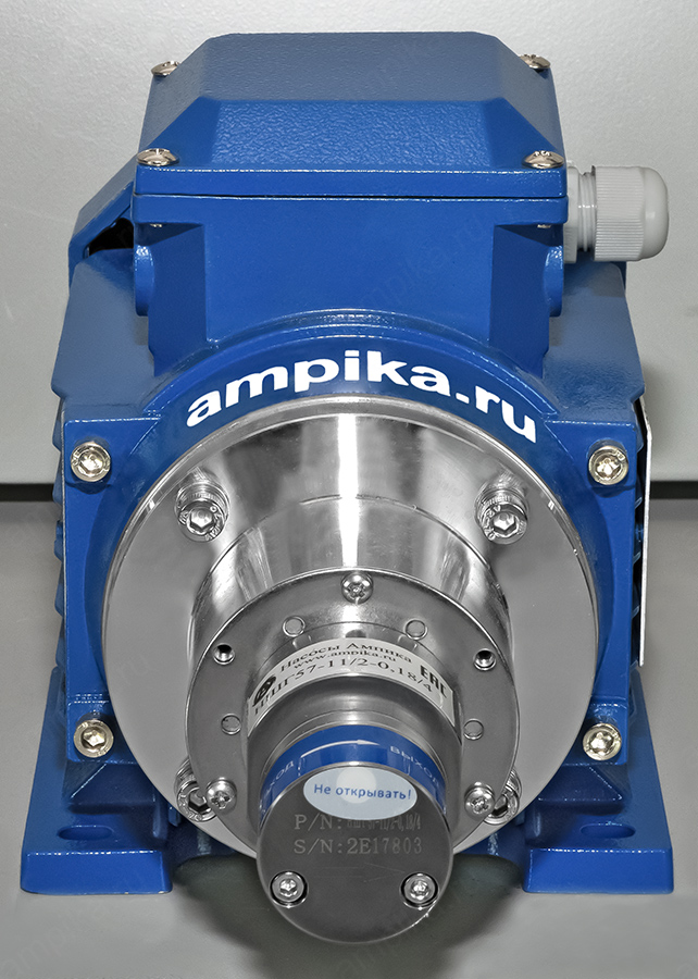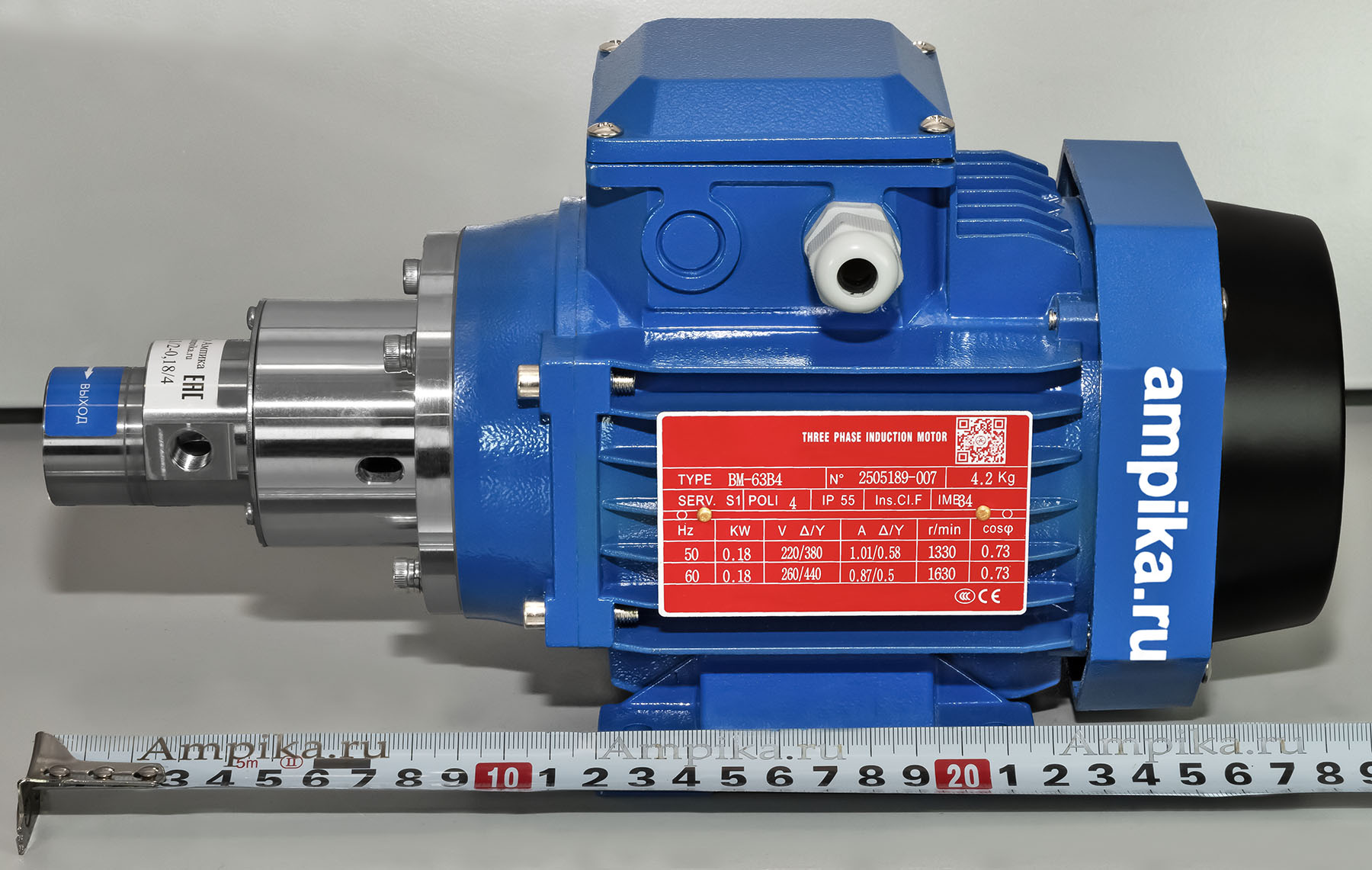 Насос малой производительности Ампика НШГ57-11/2-0,18/4Небольшой герметичный насос с магнитной муфтой НШГ-57-11/2-0,18/4 предназначен для перекачивания различных жидкостей средней вязкости, химически не агрессивных к материалам насоса, без абразивных включений. Привод шестерни насосной части осуществляется с помощью магнитного поля сквозь герметичную стенку, то есть в насосе отсутствует такая уязвимая для химических насосов деталь, как уплотнение вала. Примеры перекачиваемых жидкостей: вода, удобрения, масла, дизельное топливо, присадки, полиэфирные смолы, некоторые не хлорсодержащие кислоты (далеко не все - уточняйте у наших менеджеров), щёлочи и т.п. При установке взрывозащищенного электродвигателя возможна перекачка спиртов, растворителей. При перекачке жидкостей с низкой вязкостью (до 500 мПа*с), возможна установка электродвигателя со скоростью вращения вала 2900 мин.⁻¹ - подача насоса увеличится в 2 раза. Максимальная вязкость перекачиваемого вещества: 3000 мПа*с (зависит от оборотов, типоразмера головы и гидравлической схемы конкретного применения) при температуре от -40˚С до +70˚С. Насос самовсасывающий (высота самовсасывания - до 2 метров). Материалы конструкции проточной части: • корпус насоса, вал - нержавеющая сталь марки AISI 316L, • шестерни и втулка вала - PEEK, • прокладки корпуса - из PTFE, • втулка магнитной муфты - PPS. Электродвигатель общепромышленного исполнения, трёхфазный, на напряжение 380 вольт. Входной и напорный патрубки - со стандартной внутренней трубной резьбой "одна восьмая дюйма". Расшифровка условного обозначения насоса НШГ57-11/2-0,18/4: - «НШГ» – насос шестерённый герметичный, - «57» – типоразмер насосной части, - «11» - максимальная производительность насоса в литрах в час, - «2» - давление насоса в средней рабочей точке в атмосферах, - «0,18» - мощность электродвигателя в киловаттах, - «4» - число полюсов электродвигателя (скорость вращения вала при частоте тока 50 Гц - 1450 об./мин.). Насос является прецизионным, что даёт возможность использовать его в качестве дозатора жидкостей при установке частотного преобразователя и дополнительного внешнего вентилятора охлаждения электромотора. В таблице характеристик насоса указаны его размеры и вес в упаковочной коробке. Параметры голого насоса: • длина: 290 мм, • ширина: 125 мм, • высота: 150 мм, • вес: 4,9 кг. Паспорт (инструкция по эксплуатации насоса) вложен в его упаковочную коробку. Другие модели этого типа