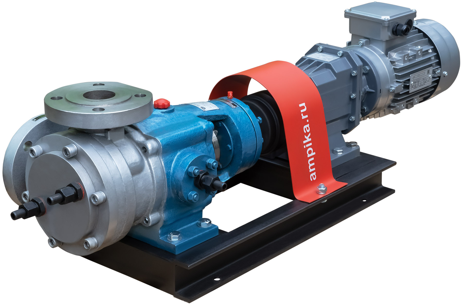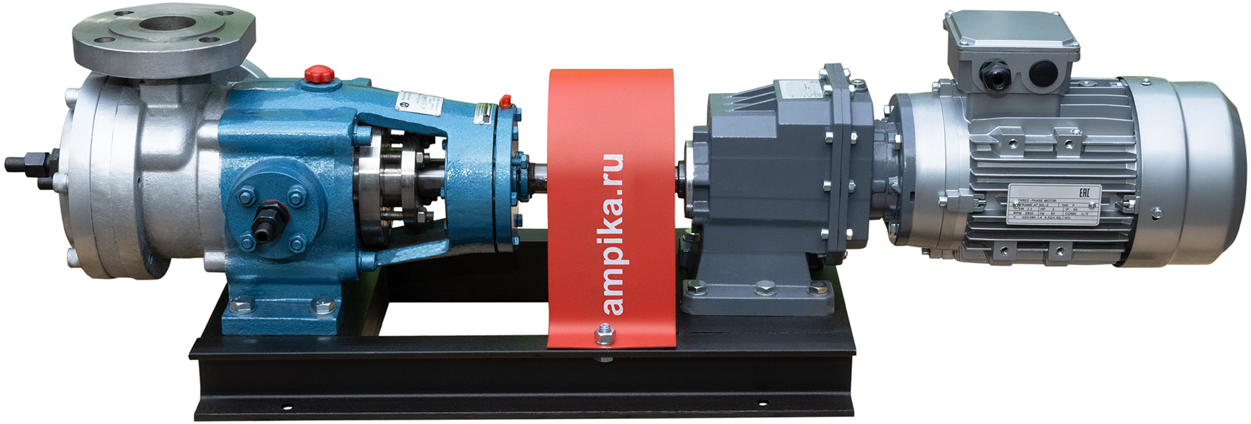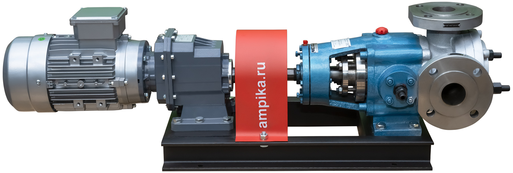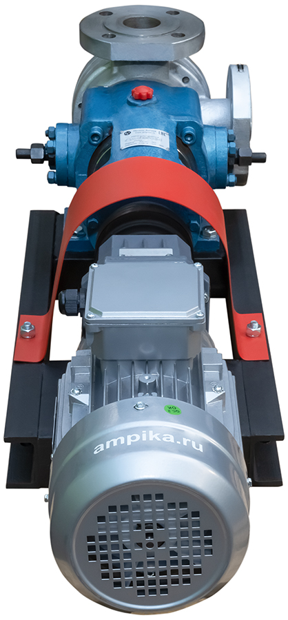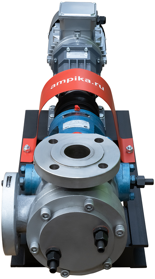 Насос с внутренним зацеплением Ампика НШВ-24,0/РО-К-С/МР-232 (до 60000 мПа*с)Промышленный высокотемпературный насос для очень вязких жидкостей НШВ-24,0/РО-К-С/МР-232 в сборе с мотор-редуктором на раме. Предназначен для перекачивания жидких веществ с вязкостью до 600000 сСт при температуре от -40°C до +300°C. При этом, что необычно для шестерённых насосов, перекачиваемая жидкость не обязательно должна обладать смазывающей способностью. Может использоваться для перекачки густых красок, густой смазки, вязких герметиков, битумов, лаков, жидких паст, масел, косметики (кремов, зубной пасты) и пищевых продуктов (мёда, патоки, вязких карамельных начинок). Насос имеет рубашку обогрева, что позволяет перекачивать жидкости, которые могут застывать при низкой температуре после остановки насоса. Для запуска агрегата в этом случае достаточно разогреть продукт внутри проточной части, используя жидкий теплоноситель, который подаётся в рубашку обогрева. У этого большого насоса рубашка двойная: с переднего торца и в корпусе подшипников (на фотографиях хорошо видно две пары маленьких чёрных патрубков). Расшифровка условного обозначения марки НШВ-24,0/РО-К-С/МР-232 (до 60000 мПа*с): - "НШВ" - насос шестерённый с внутренним зацеплением, - "24,0" – рабочий объём головки в литрах/100 оборотов, - "РО" – рубашка обогрева, - "К" - проточная часть из нержавеющей стали марки AISI304, - "С" – уплотнение вала – сальниковая набивка с тефлоновой пропиткой (PTFE). - "МР - 232" - мотор-редуктор с выходными оборотами 232 мин⁻¹, - "до 60000 мПа*с" - максимальная вязкость жидкости для насоса в указанной комплектации. Стандартное расположение патрубков насоса (если смотреть со стороны вала привода): - справа - вход (всасывающий патрубок), - вверх - выход (нагнетательный). Допускается кратковременная работа в режиме реверса (например, для слива лишнего продукта из реактора). Другие модели этого типа