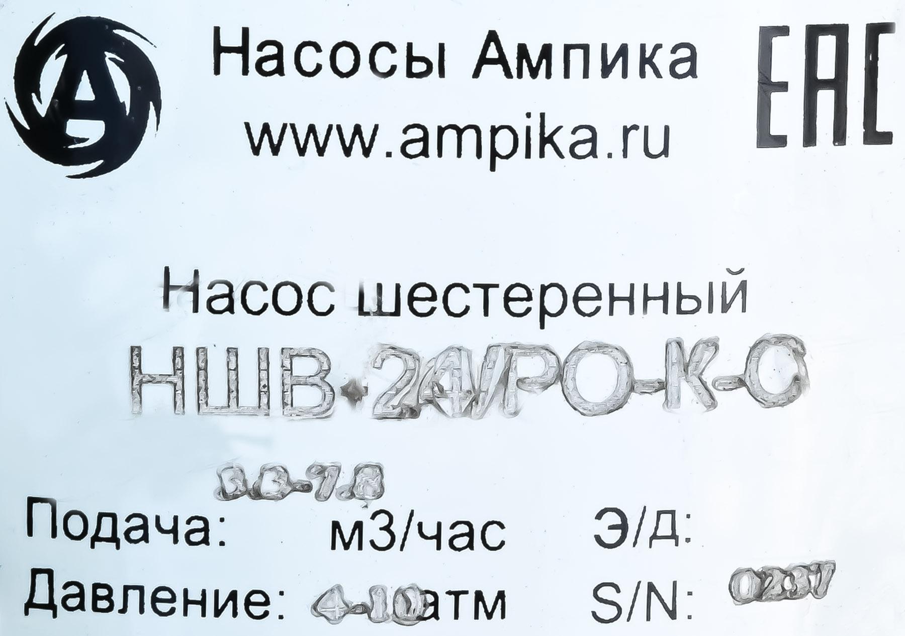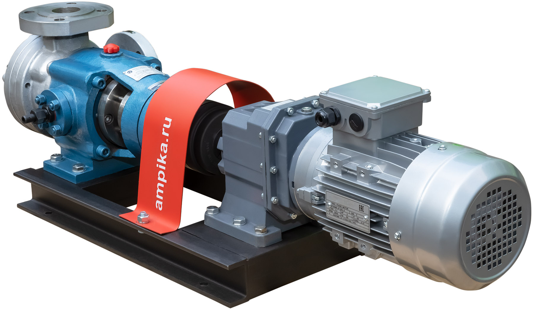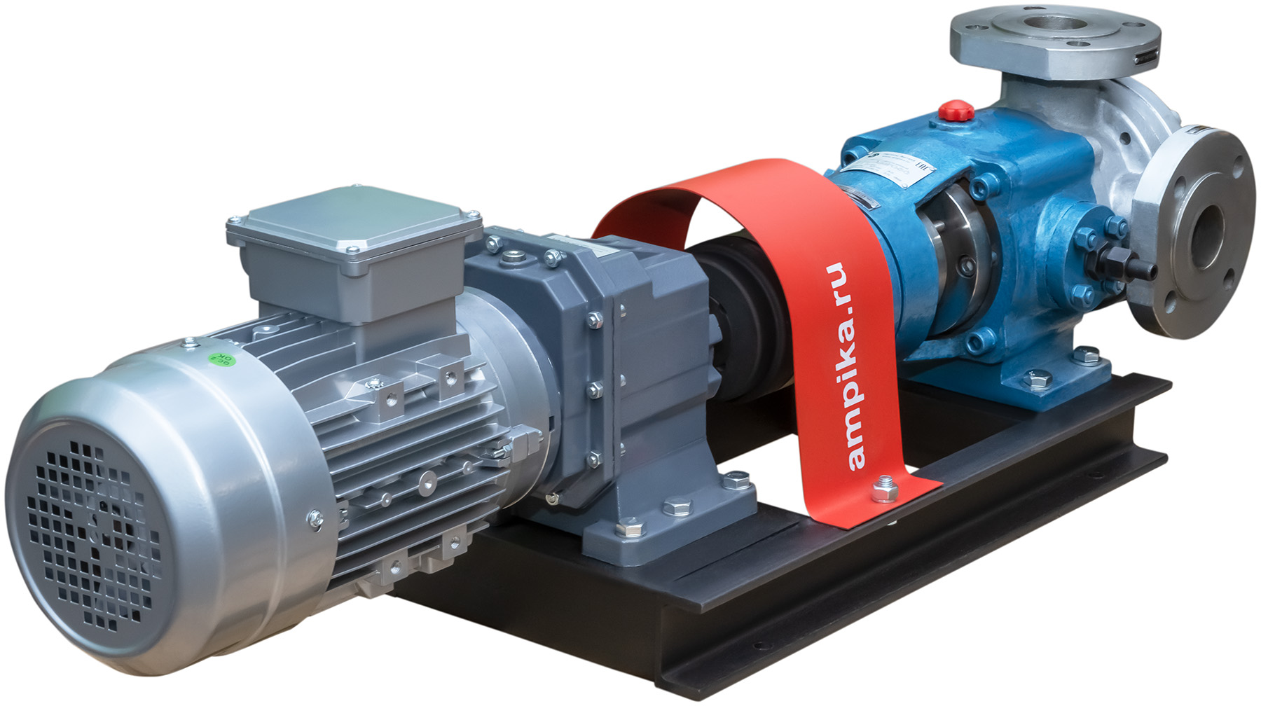 Насос с внутренним зацеплением Ампика НШВ-24,0/РО-К-С/МР-232 (до 60000 мПа*с)Промышленный высокотемпературный насос для очень вязких жидкостей НШВ-24,0/РО-К-С/МР-232 в сборе с мотор-редуктором на раме. Предназначен для перекачивания жидких веществ с вязкостью до 600000 сСт при температуре от -40°C до +300°C. При этом, что необычно для шестерённых насосов, перекачиваемая жидкость не обязательно должна обладать смазывающей способностью. Может использоваться для перекачки густых красок, густой смазки, вязких герметиков, битумов, лаков, жидких паст, масел, косметики (кремов, зубной пасты) и пищевых продуктов (мёда, патоки, вязких карамельных начинок). Насос имеет рубашку обогрева, что позволяет перекачивать жидкости, которые могут застывать при низкой температуре после остановки насоса. Для запуска агрегата в этом случае достаточно разогреть продукт внутри проточной части, используя жидкий теплоноситель, который подаётся в рубашку обогрева. У этого большого насоса рубашка двойная: с переднего торца и в корпусе подшипников (на фотографиях хорошо видно две пары маленьких чёрных патрубков). Расшифровка условного обозначения марки НШВ-24,0/РО-К-С/МР-232 (до 60000 мПа*с): - "НШВ" - насос шестерённый с внутренним зацеплением, - "24,0" – рабочий объём головки в литрах/100 оборотов, - "РО" – рубашка обогрева, - "К" - проточная часть из нержавеющей стали марки AISI304, - "С" – уплотнение вала – сальниковая набивка с тефлоновой пропиткой (PTFE). - "МР - 232" - мотор-редуктор с выходными оборотами 232 мин⁻¹, - "до 60000 мПа*с" - максимальная вязкость жидкости для насоса в указанной комплектации. Стандартное расположение патрубков насоса (если смотреть со стороны вала привода): - справа - вход (всасывающий патрубок), - вверх - выход (нагнетательный). Допускается кратковременная работа в режиме реверса (например, для слива лишнего продукта из реактора). Другие модели этого типа