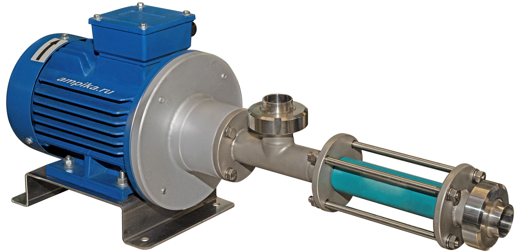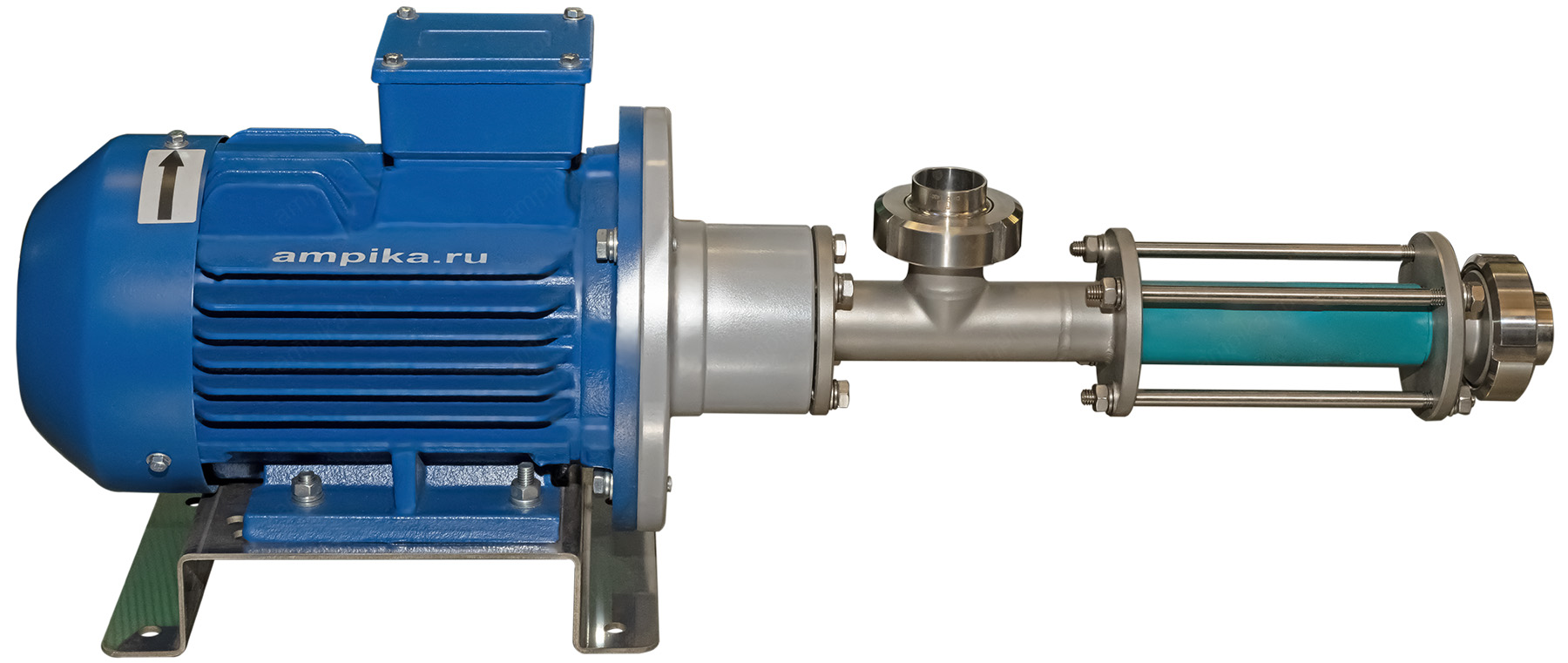 Винтовой насос Ампика ОВН-2-1,0/6 с 1,1 кВтМаленький промышленный винтовой насос ОВН-2-1,0/6 с 1,1 кВт предназначен для перекачивания вязких жидкостей с небольшими частицами в пищевой и химической промышленности. Насос представляет собой моноблочную конструкцию, что позволило снизить цену по сравнению с традиционным решением, когда используется выносная промежуточная подшипниковая стойка. Уплотнение вала - торцевое. Материал проточной части - нержавеющая сталь марки AISI 304. Температура перекачиваемой жидкости - до +80ºC в стандартном исполнении, возможно изготовление с рабочей температурой до +140ºC под заказ. Допустимый размер частиц в перекачиваемой жидкости: твёрдые - до 6 мм, мягкие - до 9 мм. Расшифровка обозначения маркировки насоса ОВН-2-1,0-6: - "О" - насос для молочной промышленности по советской классификации, - "ВН" - винтовой насос, - "2" - номинальная производительность статора (обоймы) на 100 оборотов винта в литрах, - "1,0" - производительность насоса в м³/час, - "6" - давление насоса в атмосферах. Электродвигатель общепромышленного исполнения, трёхфазный, на 380 вольт, IP55. Возможные варианты исполнения: - с байпасом (дает возможность работы на закрытый выход, например, для дозирования), - с дополнительным штуцером для CIP мойки, - во взрывозащищённом исполнении, - со шнековым питателем, - с мотор-редуктором. ВНИМАНИЕ! Если требуется работа с частотным преобразователем, об этом нужно сообщать при заказе, т.к. со стандартным электродвигателем насос может не запускаться от частотника. В этом случае может потребоваться установка более мощного электродвигателя, а также дополнительного внешнего вентилятора, т.к. при снижении оборотов встроенная в э/д крыльчатка может перестать эффективно охлаждать электродвигатель, и это может привести к его перегреву. Частотный регулятор следует выбирать на одну ступень больше, чем мощность электродвигателя, и обязательно использовать частотный преобразователь с векторным управлением. Другие модели этого типа