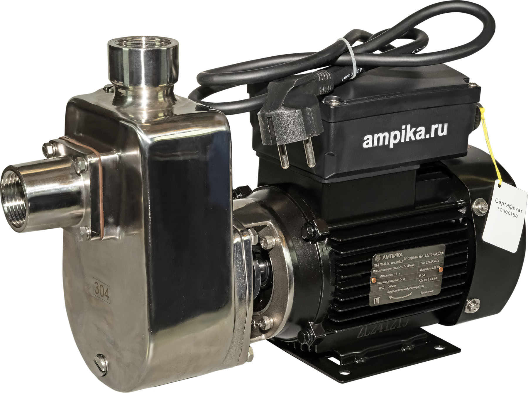 ХМС-3/13-АМ_220ВРабочее колесо открытого типа. Примеры перекачиваемых жидкостей: вода, соки, дезрастворы для СИП-моек, некоторые кислоты средней концентрации (не хлорсодержащие), дизельное топливо. В исполнении «ХМСЕ», насосы комплектуются взрывозащищенными электро-двигателями IP54, ExdIIBT4. В этом исполнении насосы могут применяться для перекачивания ЛВЖ (спирты, бензин, керосин, и подобных, не разъедающих клапан из витона). Для перекачивания щелочных жидкостей (не хлорсодержащих), требуется замена клапана насоса на исполнение их тефлона (PTFE). Для этого нужно приобрести «KIT для растворителей и щелочей». В исполнении ХМСЕ (насос с взрывозащищённым электродвигателем) и установленном «KIT для растворителей и щелочей», возможна перекачка растворителей. Высота самовсасывания - до 4-6 метров (по холодной воде). Рабочая температура: от -20°С до +90°С. Расшифровка маркировки насоса на примере ХМС(Е)-3/12-АМ_(220В): «ХМС» - химический моноблочный самовсасывающий, «Е» - взрывозащищенный электродвигатель, «3» - номинальная подача в рабочей точке, м3/час, «12» - номинальный напор, м, «АМ» - торговая марка «Ампика»®, «220В» - питание 220 В (если не указано, то 380 В). !!!Насосы не имеют сертификатов взрывозащиты!!! Другие модели этого типа