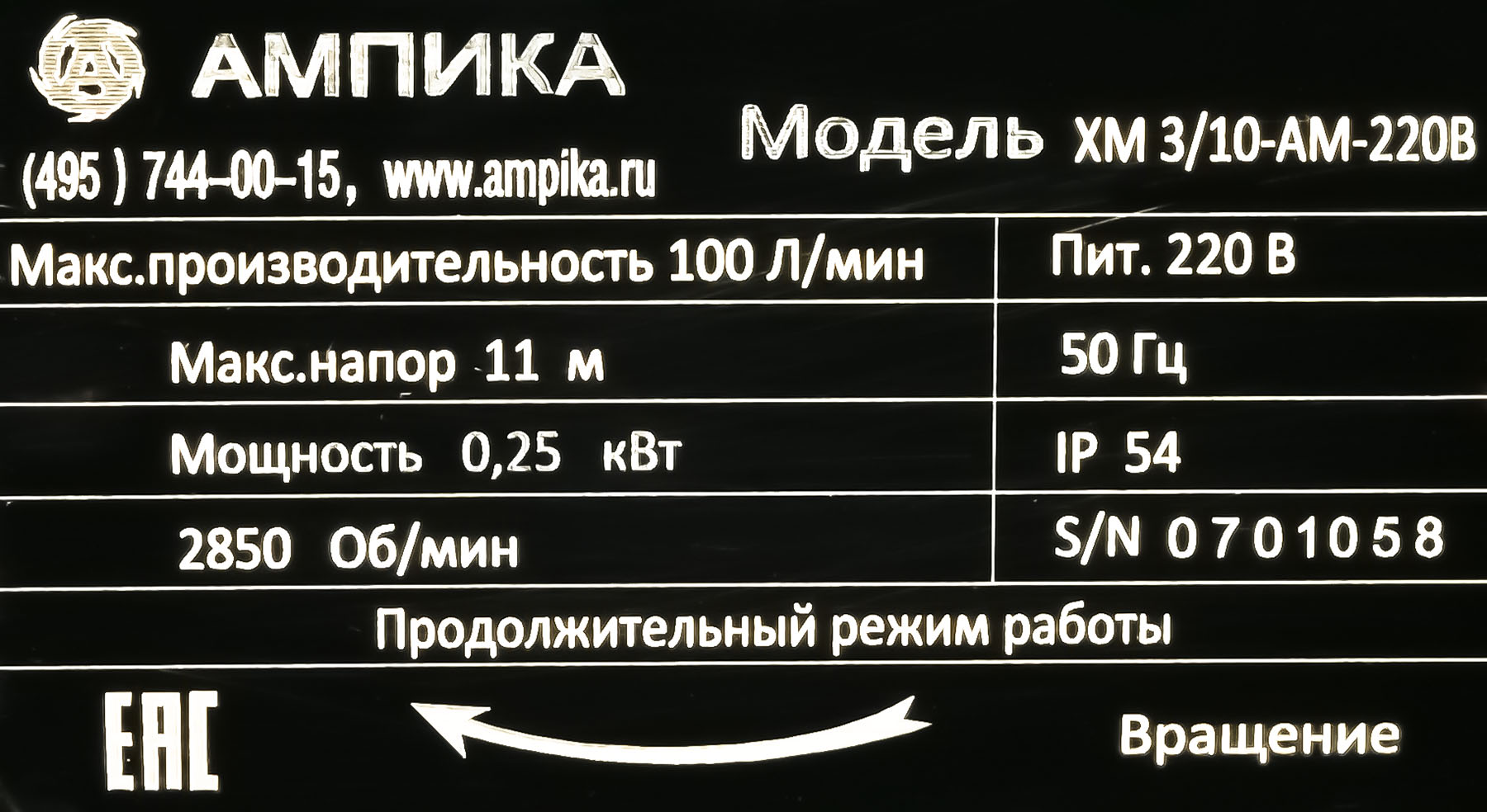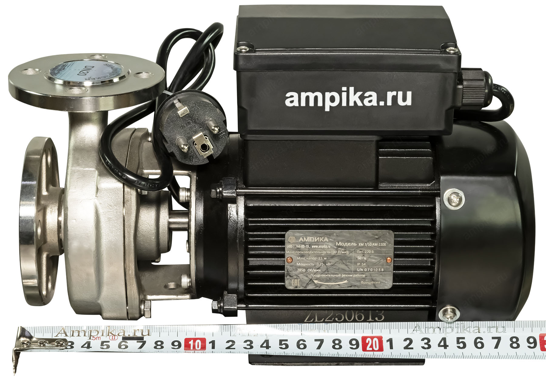 Химический насос Ампика ХМ-3/10-АМ_220ВНазначение: Маленький однофазный центробежный химический насос ХМ 3/10-АМ_220 предназначен для перекачивания различных химически активных жидкостей, неагрессивных к материалам проточной части. Может использоваться в химической, нефтехимической, косметической, пищевой промышленности. Для подбора под каждые конкретные условия эксплуатации консультируйтесь с нашими специалистами. Материалы конструкции: Проточная часть изготовлена из высококачественной нержавеющей стали марки AISI 316 (российский аналог - сталь 08Х17Н13М2). Насос имеет и резьбовое, и фланцевое присоединение (наружная резьба, на которую накручены фланцы) - всё из нержавейки. Уплотнение вала - торцевое, из фторопласта. Прокладка корпуса фторопластовая. Расшифровка обозначения ХМ-3/10-АМ_220В: «ХМ» - химический моноблочный насос, «3» - номинальная подача в рабочей точке, м³/час, «10» - номинальный напор, м, «АМ» - торговая марка «Ампика», «220В» - с однофазным двигателем и подключением к обычной розетке на 220 вольт. Технические характеристики: • Принцип действия - центробежный. • Рабочее колесо - открытого типа. • Максимальный размер частиц в жидкости - 0,25 мм (с концентрацией частиц более 0,1% по массе). • Максимальная плотность перекачиваемой жидкости - 1300 кг/м³. • Допустимый температурный диапазон перекачиваемой жидкости - от -40 до +103 °С. • Максимальная производительность (при работе на свободный излив) - 110 литров в минуту. • Максимальное давление насоса (при околонулевой подаче) - 1,1 атмосферы. • Всасывающий патрубок (с переднего торца) - наружная резьба "один дюйм" с фланцем Ду25. • Напорный патрубок (сверху) - наружная резьба "три четверти дюйма" с фланцем Ду20. Параметры, приведённые в таблице характеристик насоса, - номинальные, то есть указана средняя (рабочая) точка графика производительности. Это режим работы, оптимальный для данного насоса. Полный рабочий диапазон - график производительности (ниспадающая кривая) приведён на картинке. В таблице указаны его вес и размеры в упаковочной коробке. Параметры голого насоса: • длина: 305 мм, • ширина: 120 мм, • высота: 190 мм, • вес: 7,3 кг. Паспорт (инструкция по эксплуатации насоса ХМ) вложен в его упаковочную коробку. Другие модели этого типа