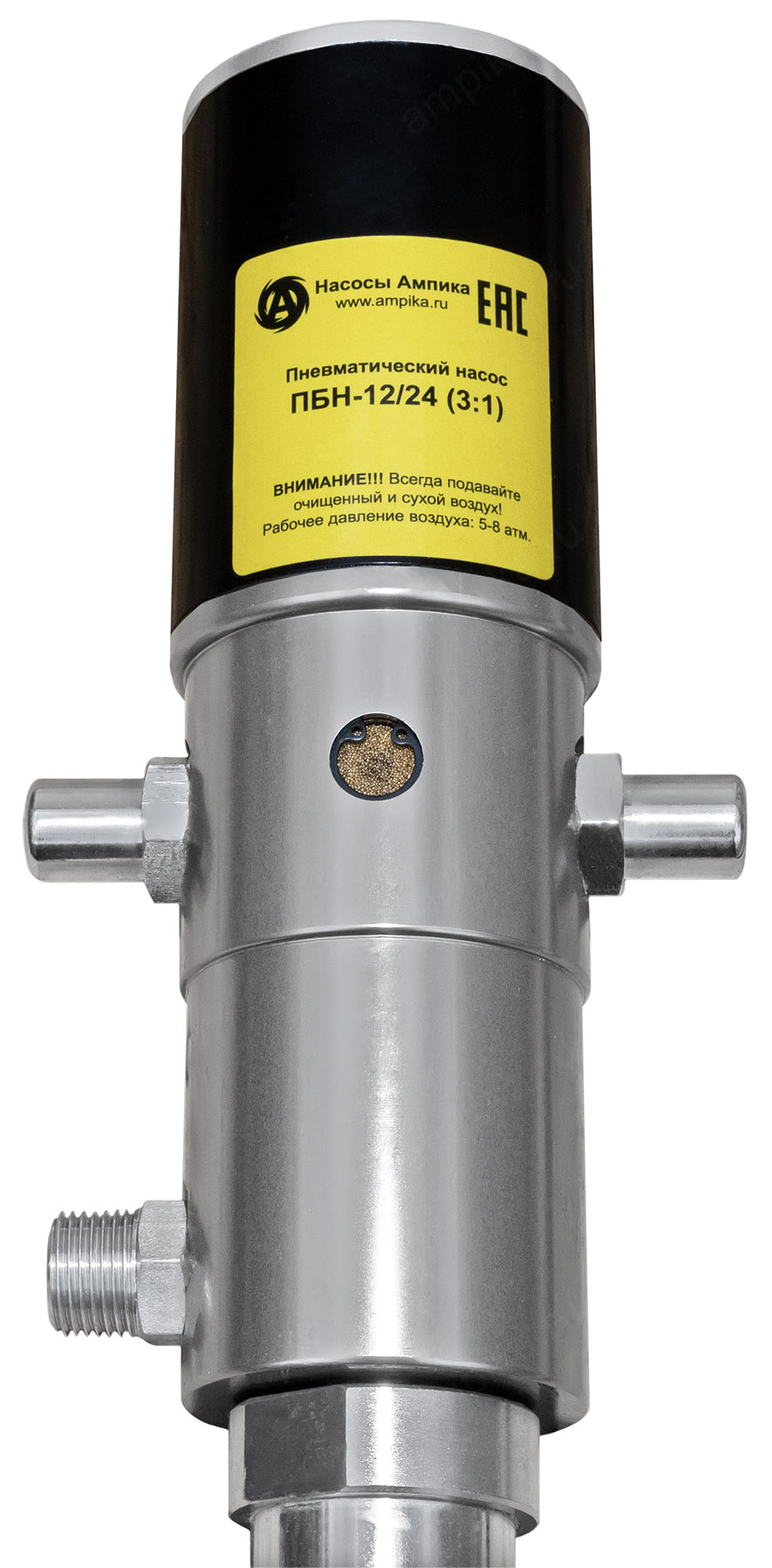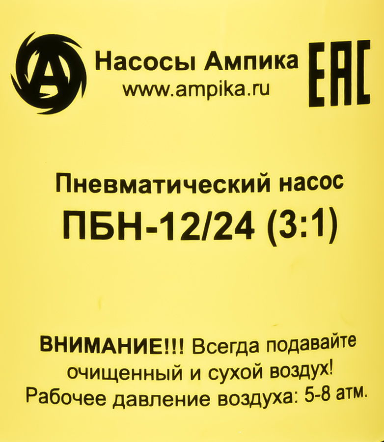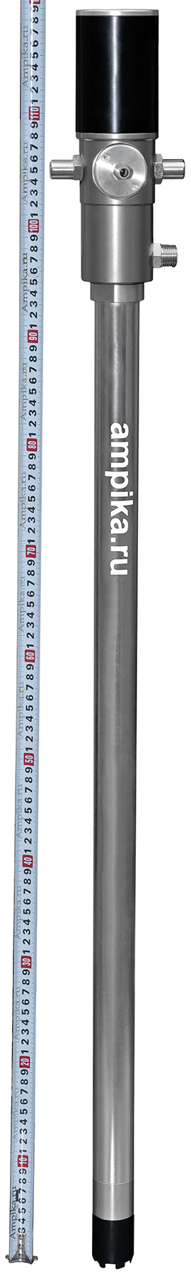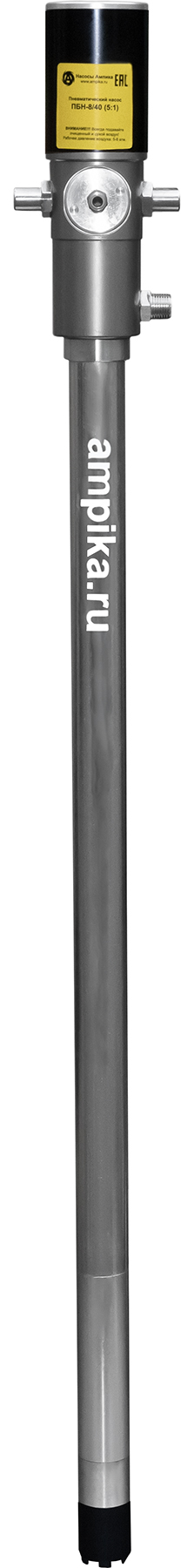 Пневмонасос для масла из бочек Ампика ПБН-12/24 (3:1)Насос пневматический ПБН-12/24 предназначен для выкачивания бочек объёмом 200 литров и подачи под давлением дизельного топлива, жидких масел, антифризов и подобных невязких, химически неагрессивных к материалам конструкции жидкостей. Изготовлен из стали. Может использоваться с раздаточным пистолетом. "3:1" означает, что давление продукта на выходе в 3 раза превосходит давление воздуха, питающего пневмодвигатель. Чем больше вязкость перекачиваемого масла, тем больше должен быть коэффициент повышения давления насоса. Технические характеристики: - максимально допустимая вязкость жидкости - 700 мПа*с (SAE 130), - глубина погружения - 940 мм, - давление компрессора - до 8 атм., - расход воздуха - до 240 л/мин., - резьба подвода воздуха - 1/4″, - резьба на выходе жидкости из насоса - 1/2″, - диаметр погружной части - 42 мм, - рабочая температура: от -10˚С до +50˚С, - уровень шума - 82 дБ (на расстоянии 1 м). Комплект поставки: - насос в сборе, - адаптер для крепления насоса на горловине бочки с резьбой 2″, - угловой кронштейн для подвешивания на стену, - фильтр-редуктор с манометром, - пневморазъём "мама-папа", - фум-лента для герметизации резьбовых соединений. ВНИМАНИЕ! Насос требует подмешивания масла в питающий воздух для правильной работы. То есть нужно либо перед каждым использованием добавлять масло в отверстие подачи воздуха, либо доукомплектовать насос автоматическим лубрикатором. Возможна комплектация фильтром-редуктором-лубрикатором MC104-C-25, который очищает воздух и подмешивает в него масло. В таблице характеристик насоса указаны его вес и размеры в упаковочной коробке. Параметры голого насоса: • длина: 1119 мм, • ширина: 75 мм, • высота: 75 мм, • вес: 5650 гр. Паспорт (инструкция по эксплуатации насоса) вложен в его упаковочную коробку. Другие модели этого типа