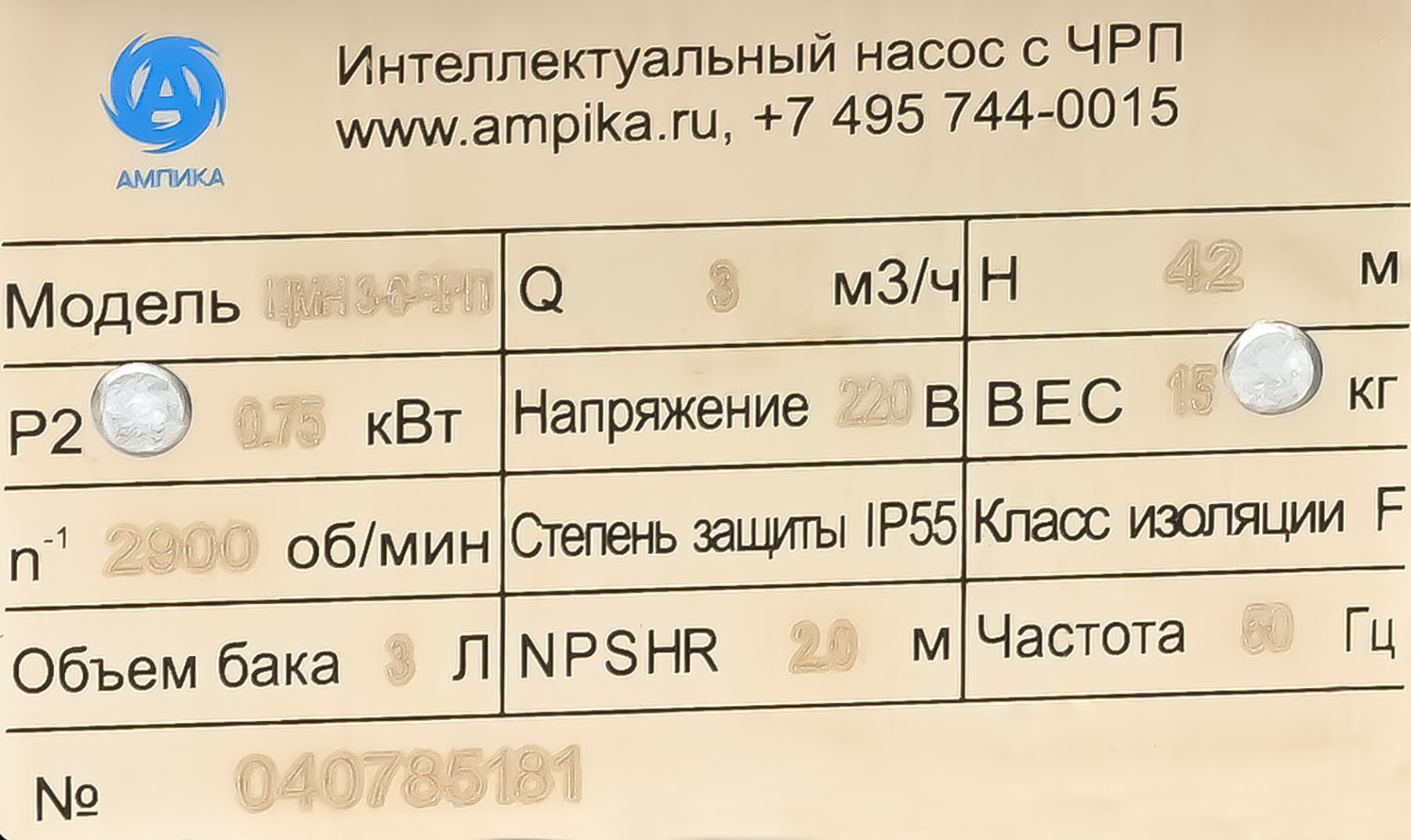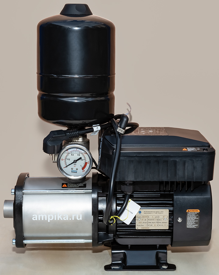 ![]() ![]() Автоматическая насосная станция Ампика ЦМН 3-6-ЧРПБытовая насосная станция ЦМН-3-6-ЧРП представляет из себя интеллектуальный несамовсасывающий насос с асинхронным электродвигателем и преобразователем частоты нового поколения. Состоит из контроллера, электродвигателя, несамовсасывающего насоса из нержавеющей стали, датчика давления, соединительной арматуры и маленького гидроаккумулятора. Питается от бытовой розетки на 220 В. Эта насосная станция отличается стабильной работой, низким уровнем шума, строгим внешним видом, компактной структурой и простотой установки и эксплуатации. Насос может автоматически, с помощью всторенного частотного преобразователя, регулировать свою производительность в соответствии с текущим потреблением воды, чтобы обеспечить постоянное давление в трубопроводной сети и сделать работу всей системы водоснабжения более эффективной и энергосберегающей. Такой управляемый электроникой насос - идеальное решение для повышения давления в водопроводе. Расшифровка обозначения марки ЦМН 3-6-ЧРП: «ЦМН» - центробежный многосекционный насос, «3» - производительность в рабочей точке, м³/час, «6» - максимальное давление насоса, в атмосферах, «ЧРП» - частотно-регулируемый привод. Технические характеристики: • Тип насоса: центробежный моноблочный многоступенчатый несамовсасывающий; • Максимальная подача: 4 куба в час; • Максимальный создаваемый насосом напор: 55 м; • Оптимальный режим работы насоса (рабочая точка): подача 2,8 м³/час с давлением 4 атм.; • Вход (с переднего торца насоса) и выход (из разветвителя): трубная внутренняя резьба "один дюйм"; • Напряжение питания: однофазное 220 вольт, 50 Гц; • Степень защиты: IP55, класс изоляции F, режим работы S1; • Высота места установки не должна превышать 1000 м над уровнем моря; • Температура окружающей среды: от -5°С до +40°С; • Температура воды: от +1°С до +68°С; • Максимальное давление в корпусе насоса: 10 атм.; • Влажность окружающей среды: 10–90 % относительной влажности (без конденсации); • Устройство отображения информации: светодиодный дисплей. В таблице характеристик станции указаны её вес и размеры в упаковочной коробке. Параметры голой насосной станции: • длина: 420 мм, • ширина: 180 мм, • высота: 510 мм, • вес: 15 кг. Паспорт (инструкция по эксплуатации насосной станции) вложен в её упаковочную коробку.
